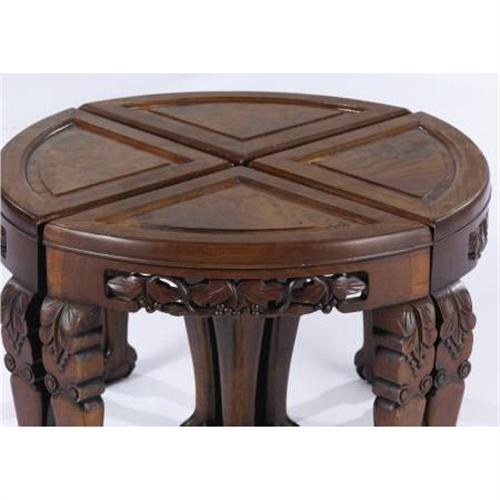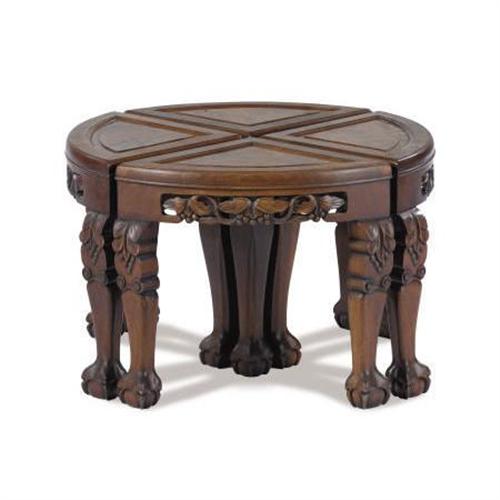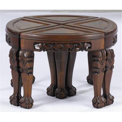 <B>A Set of Four Chinese Hardwood Tables<BR></B></I>Unknown maker, China<BR>Twentieth century<BR>Hardwood<BR>Unmarked<BR>Each: 16 x 17-1/2 x 11-1/2 inches (40.6 x 44.5 x 29.2 cm)<BR> Each quarter round table with shaped legs terminating in claw and ball feet with pierced apron and burl wood inset top, together forming a circular table.<BR><BR><BR><b>Shipping:</b> Requires 3rd Party Shipping (<a target="_blank" href="http://www.heritageauctions.com/common/shipping.php">view shipping information</a>)