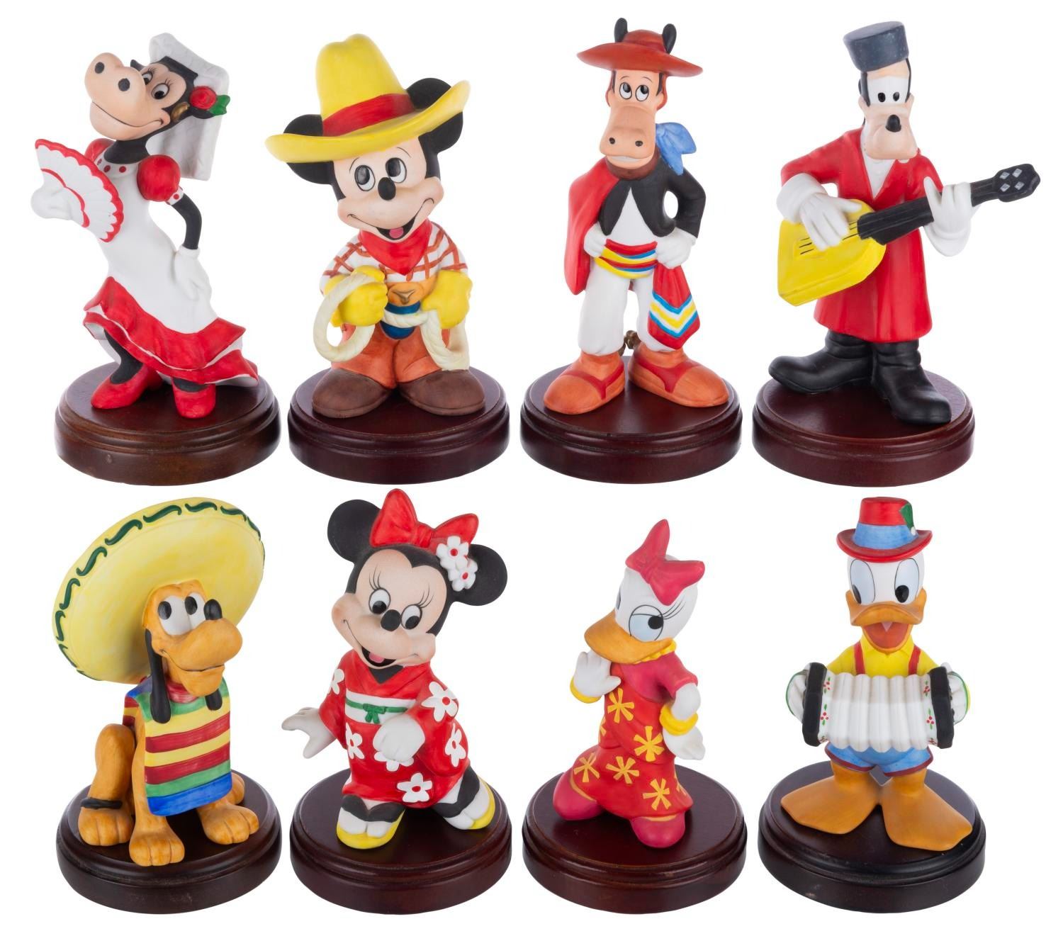 (Goebel, 1980s) A set of eight figurines inspired by It's a Small World. Included are hand-painted figurines of Mickey, Minnie, Donald, Daisy, Goofy, Pluto, Horace Horsecollar, and Clarabelle Cow dressed in the traditional attire of some of the Nations found within the attraction. Measuring 2" x 1.5" and 4.5" tall to 3" x 2" and 6" tall on 3.25" diameter bases, the figurines are in fine condition. The bases are in very good condition with light wear from use.