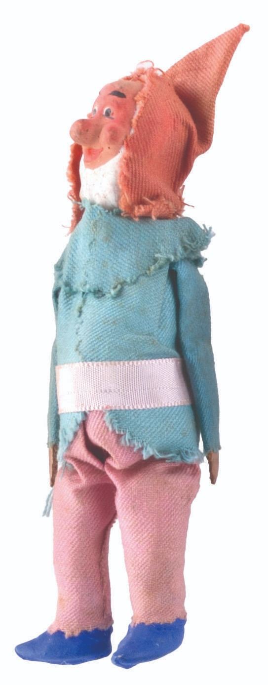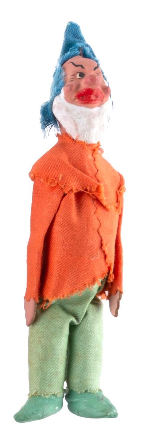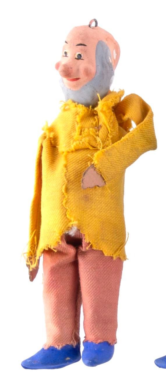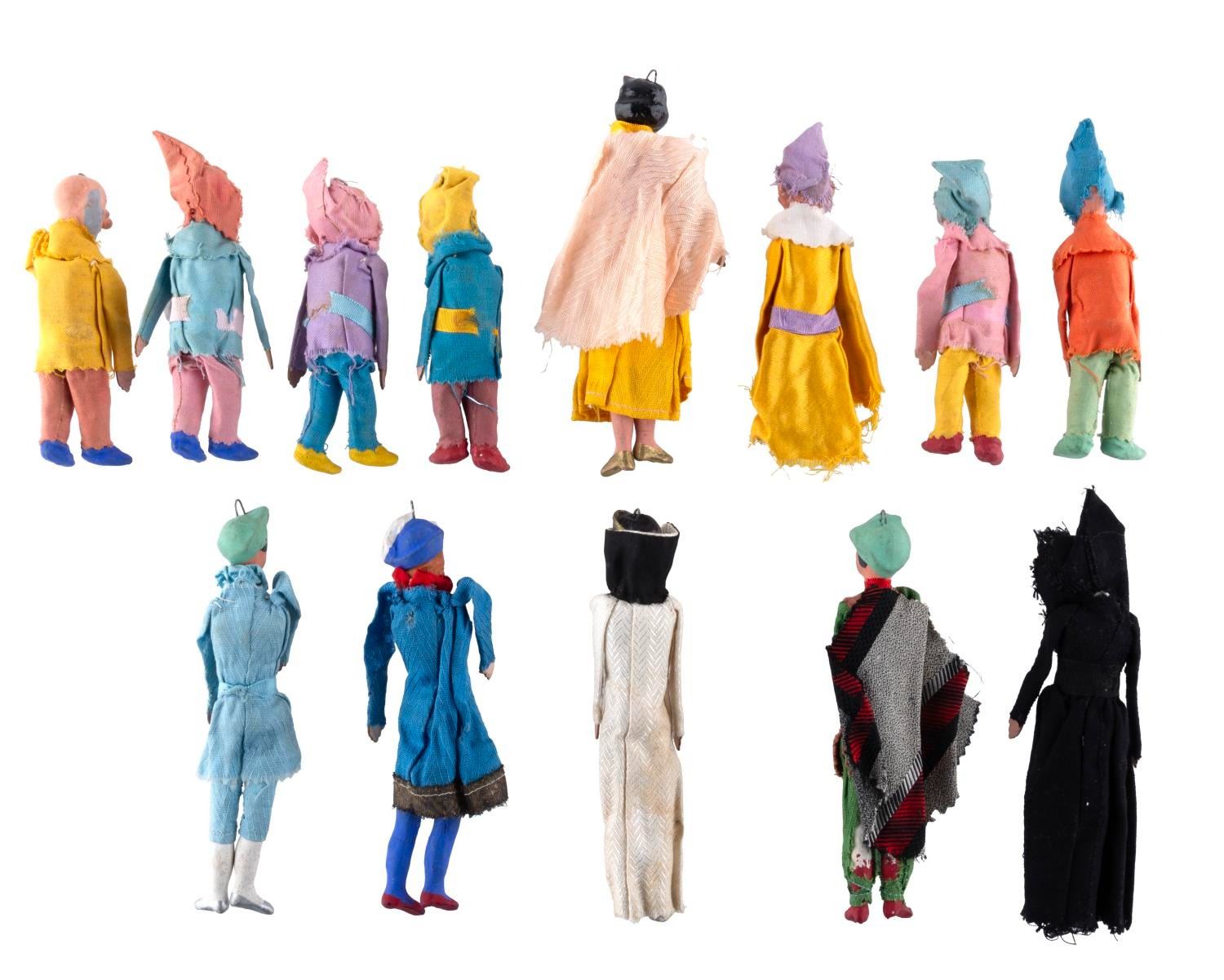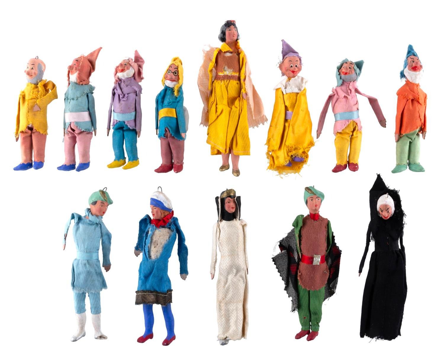 (Disney, 1930s-1960s) A set of hand-made clay "Snow White and the Seven Dwarfs" ornaments, including Snow White, the Seven Dwarfs, the Prince, two of the Prince's servants, and the Evil Queen. Measuring from 4.25" to 6.25", the ornaments are in fair condition, with both the paint and clay scuffed, chipped, and cracked, and the clothing torn and frayed.