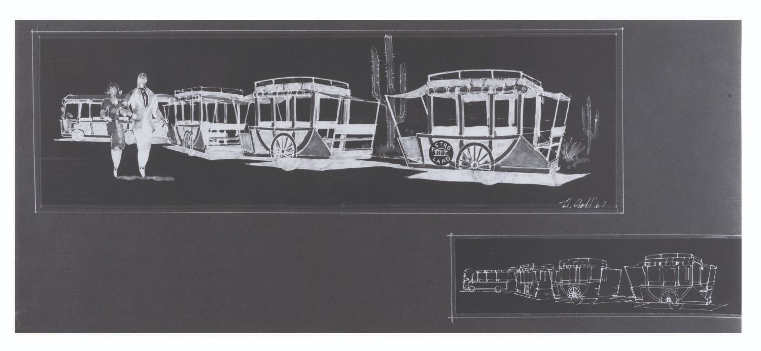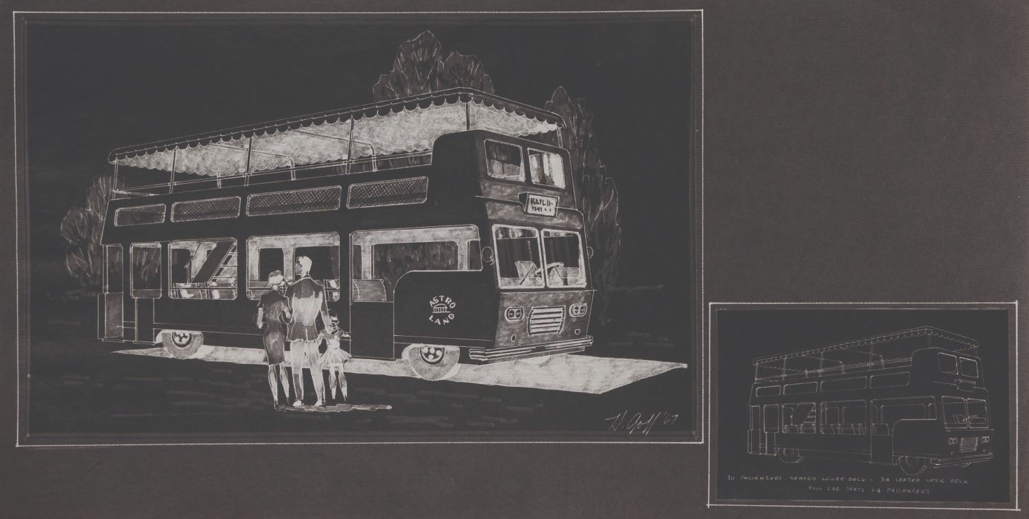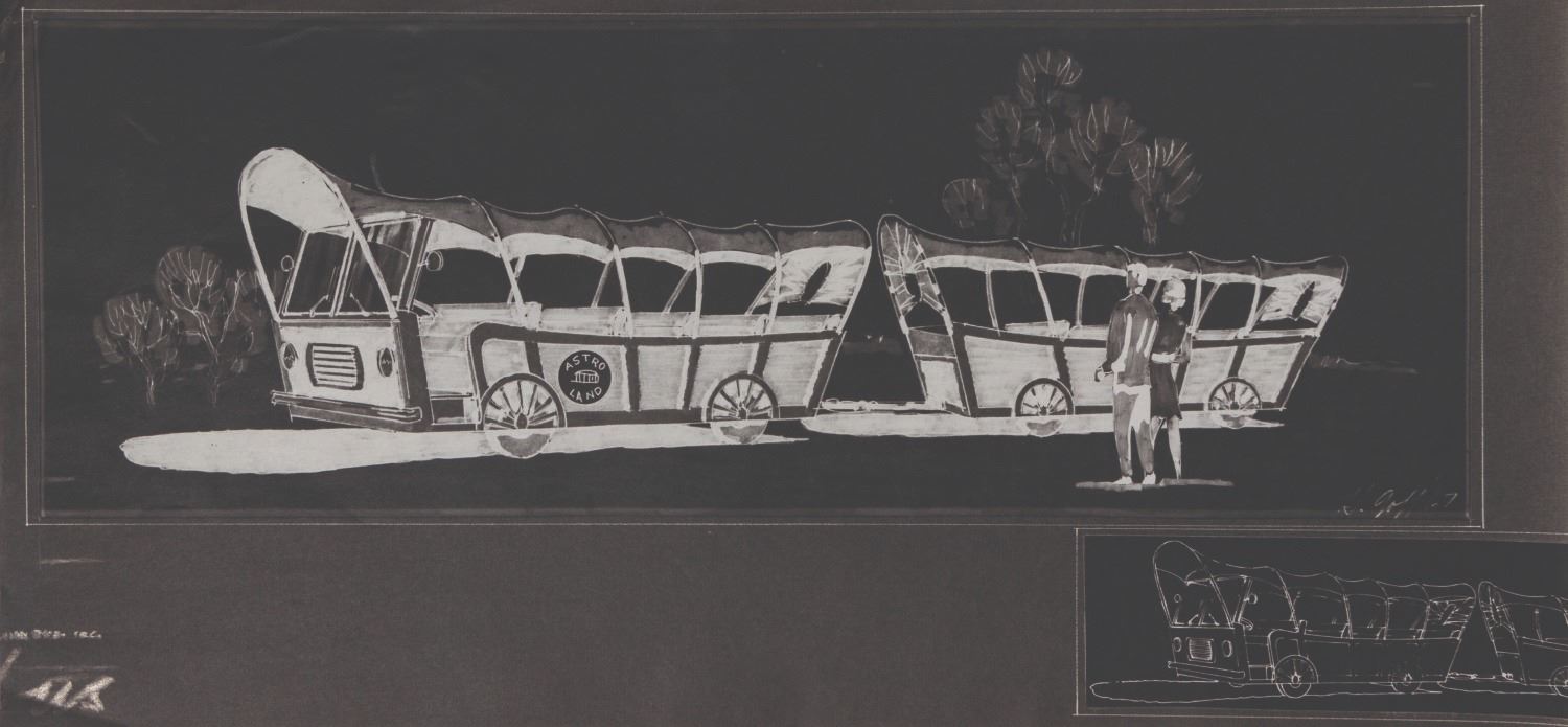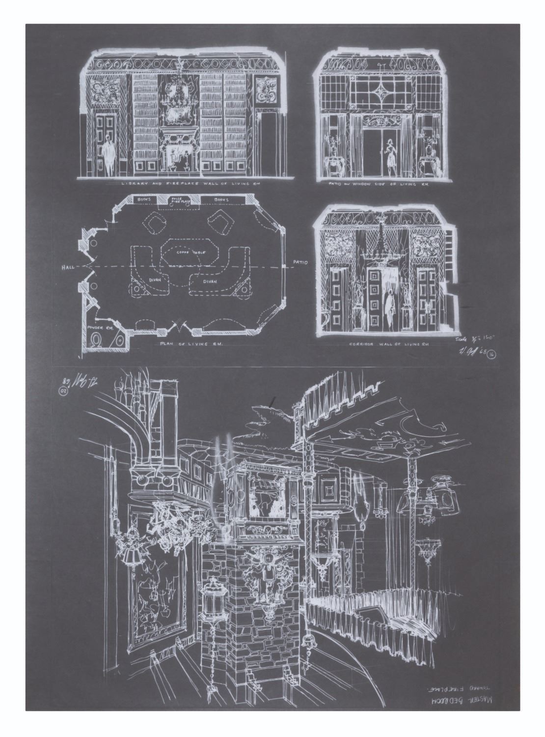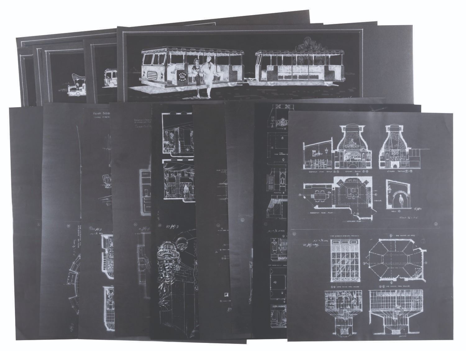 (Houston Astroworld, 1968) A set of design blueprints by Harper Goff for the Houston Astroworld Hotel. Judge Roy Hofheinz was a larger-than-life figure in Houston, who wanted everything for his Hotel and entertainment complex beside the AstroDome to be the best in the world. He hired Harper Goff to design the over-the-top deluxe VIP suites, which became legendary for hosting guests including Elvis Presley and Muhammad Ali. This set of 18 design blueprints (technically called “white black blueprints”) includes nine 17.5” x 13.75” concept, layout, and elevation drawings of VIP suite concepts, and nine 22.5” blueprints of concepts for Astro Land trams in the style of covered wagons, street cars, and more historical vehicles. The plans are all in very good condition with light handling wear.