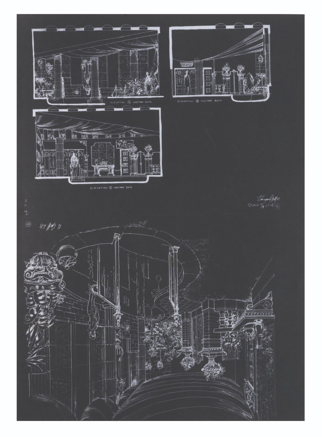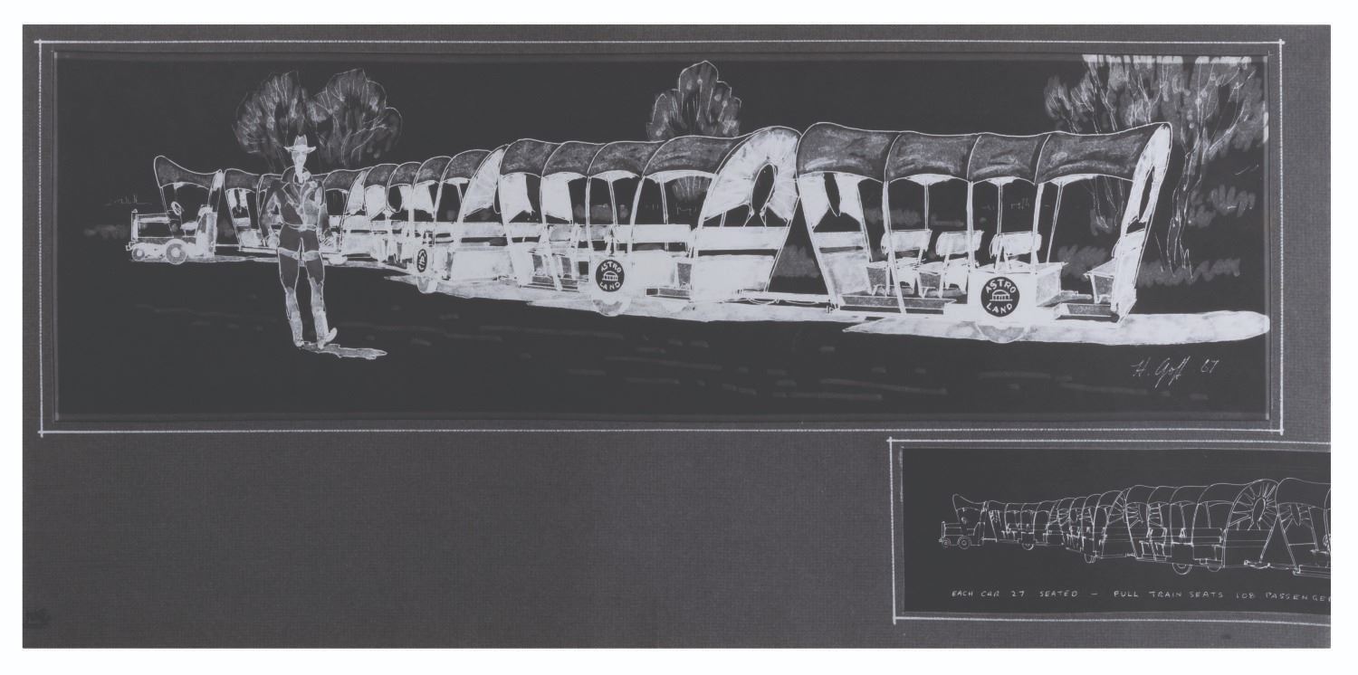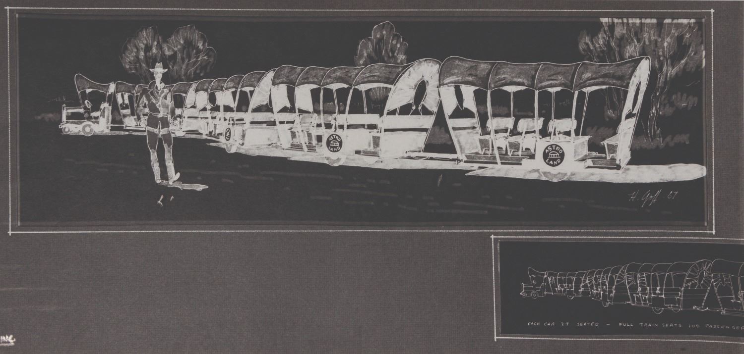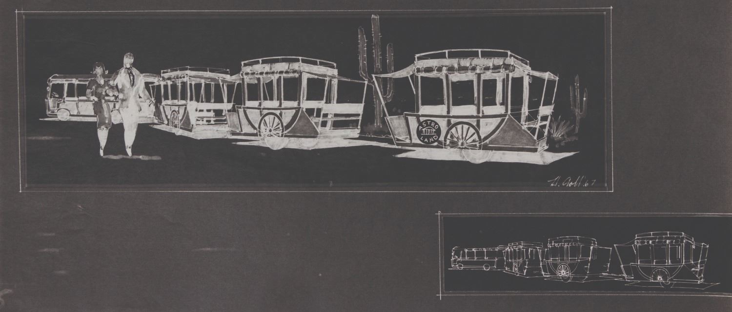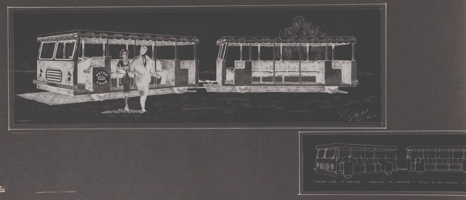 (Houston Astroworld, 1968) A set of design blueprints by Harper Goff for the Houston Astroworld Hotel. Judge Roy Hofheinz was a larger-than-life figure in Houston, who wanted everything for his Hotel and entertainment complex beside the AstroDome to be the best in the world. He hired Harper Goff to design the over-the-top deluxe VIP suites, which became legendary for hosting guests including Elvis Presley and Muhammad Ali. This set of 18 design blueprints (technically called “white black blueprints”) includes nine 17.5” x 13.75” concept, layout, and elevation drawings of VIP suite concepts, and nine 22.5” blueprints of concepts for Astro Land trams in the style of covered wagons, street cars, and more historical vehicles. The plans are all in very good condition with light handling wear.