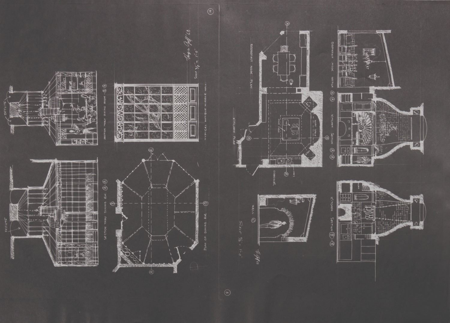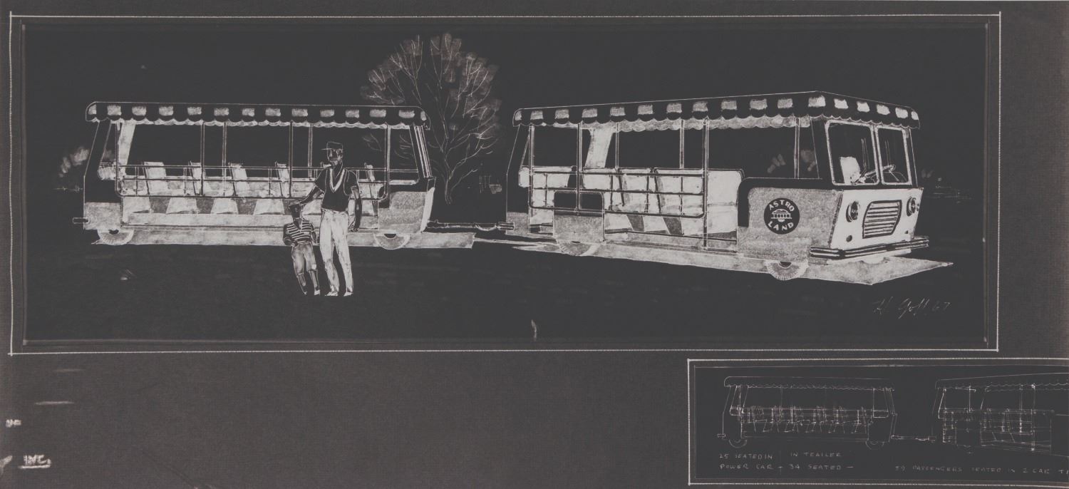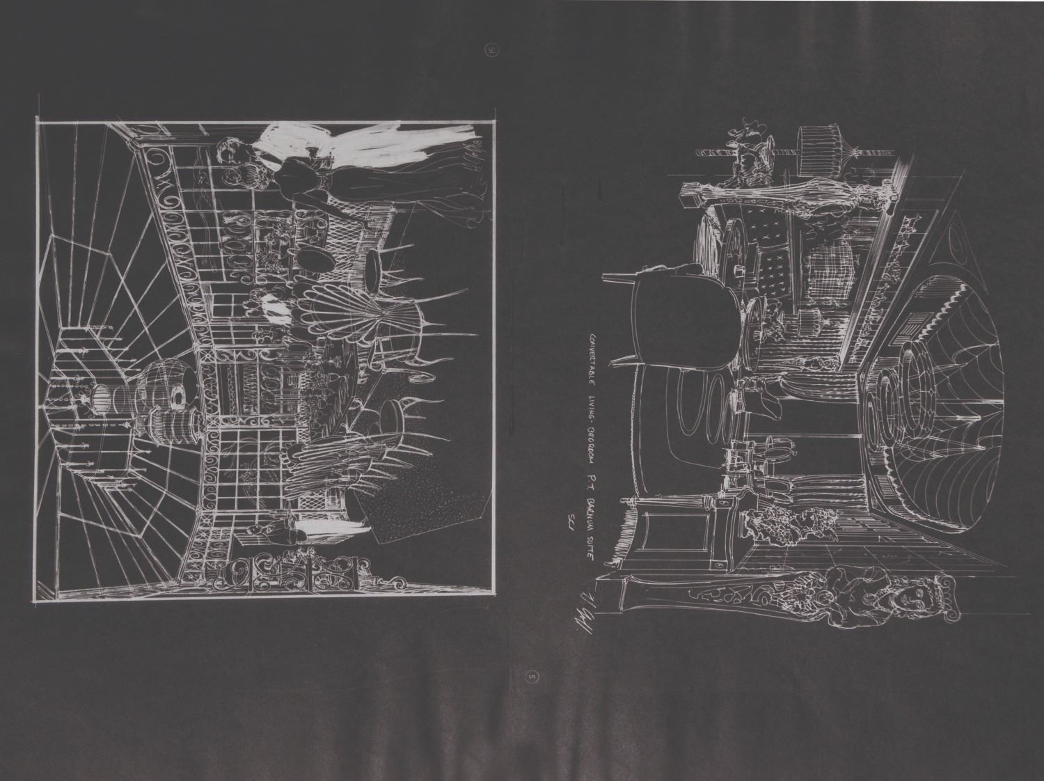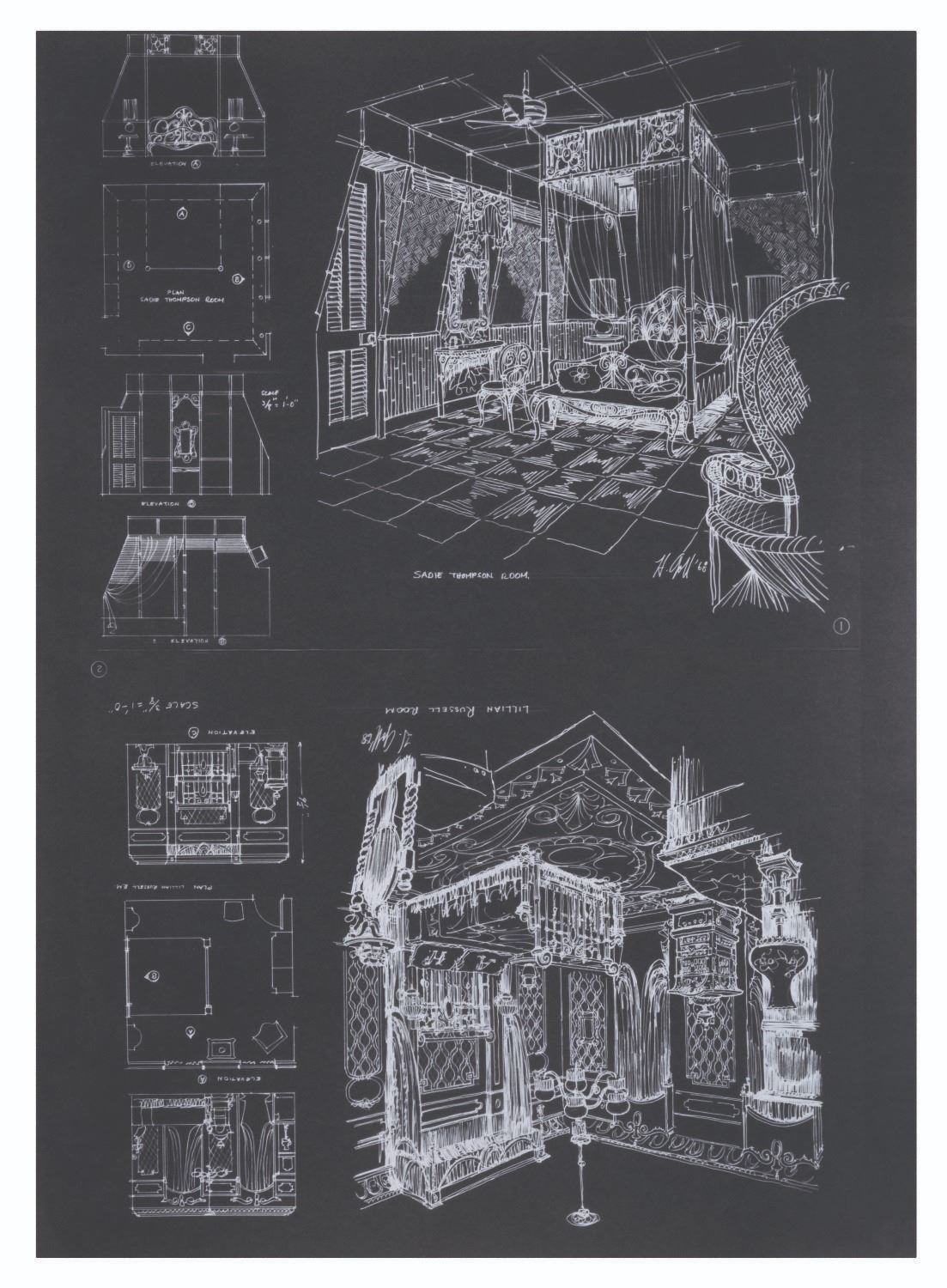 (Houston Astroworld, 1968) A set of design blueprints by Harper Goff for the Houston Astroworld Hotel. Judge Roy Hofheinz was a larger-than-life figure in Houston, who wanted everything for his Hotel and entertainment complex beside the AstroDome to be the best in the world. He hired Harper Goff to design the over-the-top deluxe VIP suites, which became legendary for hosting guests including Elvis Presley and Muhammad Ali. This set of 18 design blueprints (technically called “white black blueprints”) includes nine 17.5” x 13.75” concept, layout, and elevation drawings of VIP suite concepts, and nine 22.5” blueprints of concepts for Astro Land trams in the style of covered wagons, street cars, and more historical vehicles. The plans are all in very good condition with light handling wear.