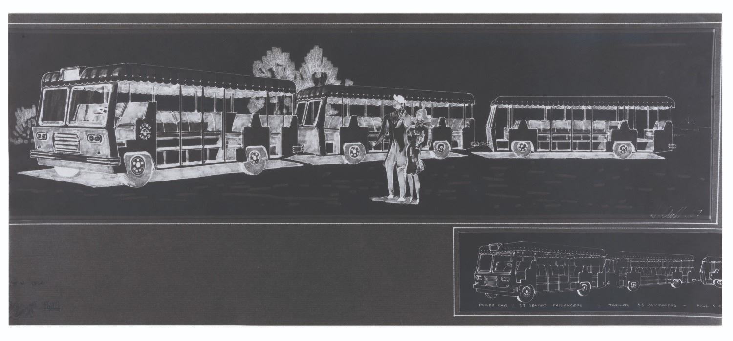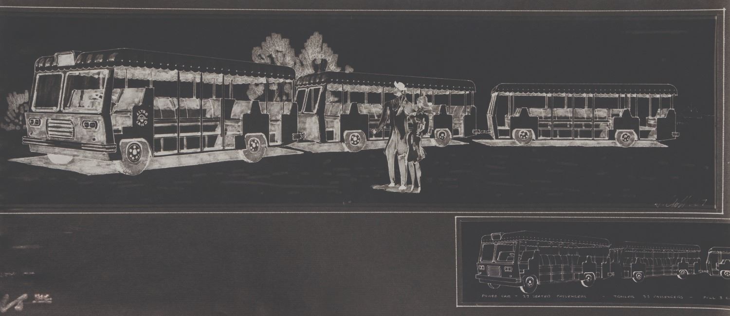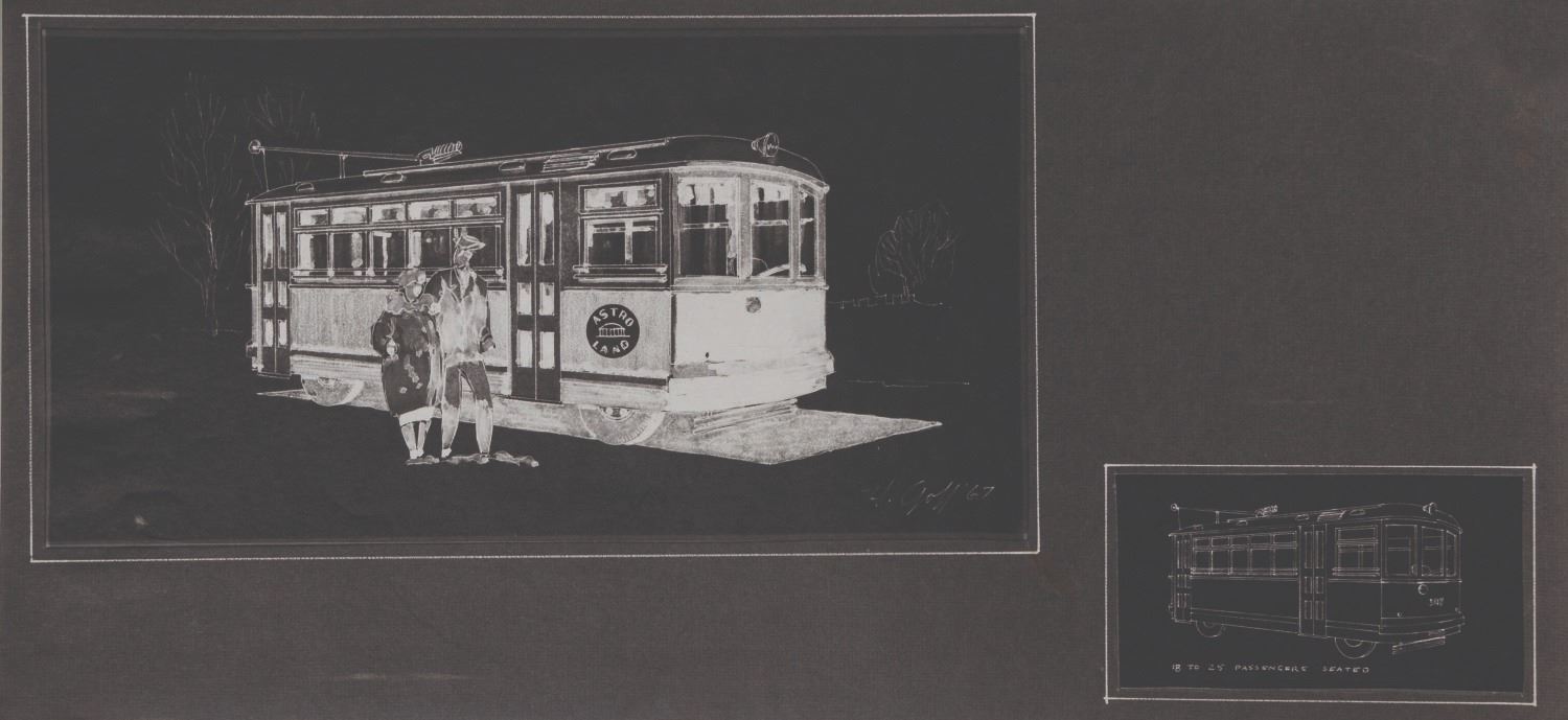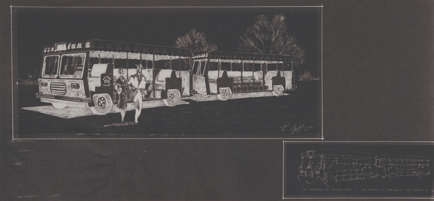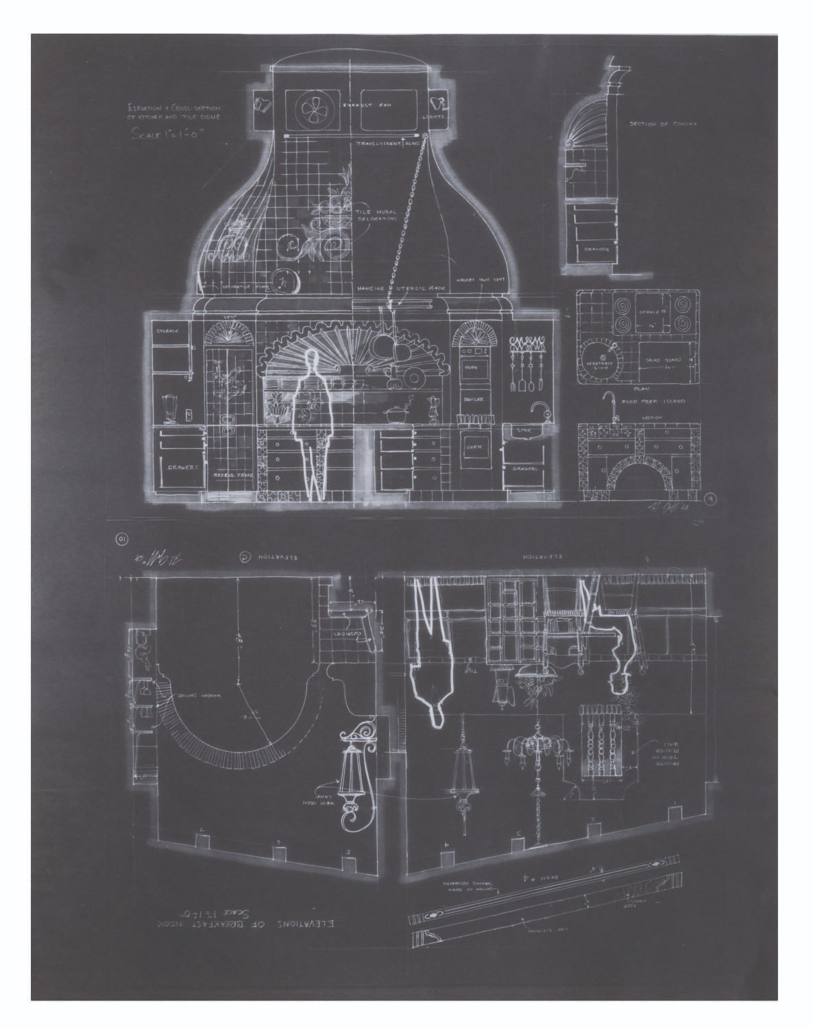 (Houston Astroworld, 1968) A set of design blueprints by Harper Goff for the Houston Astroworld Hotel. Judge Roy Hofheinz was a larger-than-life figure in Houston, who wanted everything for his Hotel and entertainment complex beside the AstroDome to be the best in the world. He hired Harper Goff to design the over-the-top deluxe VIP suites, which became legendary for hosting guests including Elvis Presley and Muhammad Ali. This set of 18 design blueprints (technically called “white black blueprints”) includes nine 17.5” x 13.75” concept, layout, and elevation drawings of VIP suite concepts, and nine 22.5” blueprints of concepts for Astro Land trams in the style of covered wagons, street cars, and more historical vehicles. The plans are all in very good condition with light handling wear.