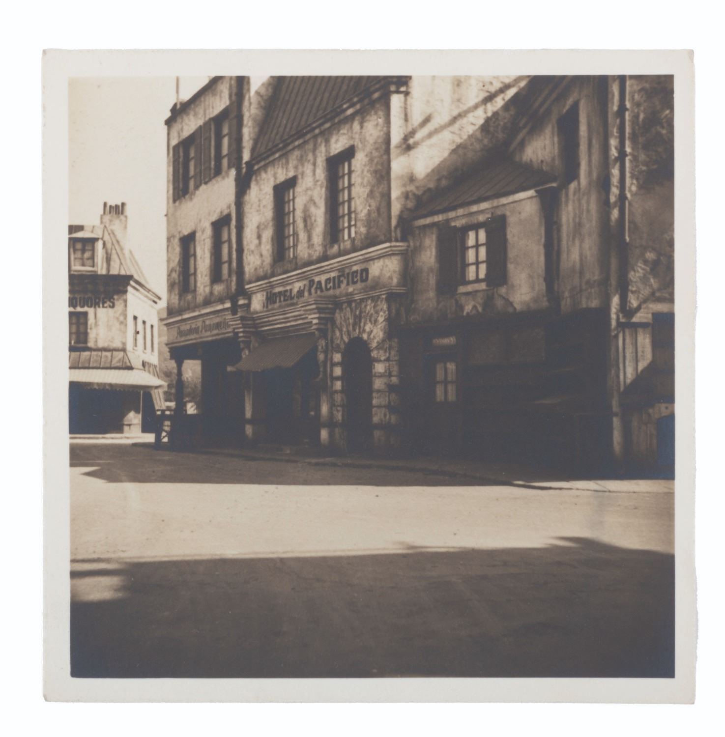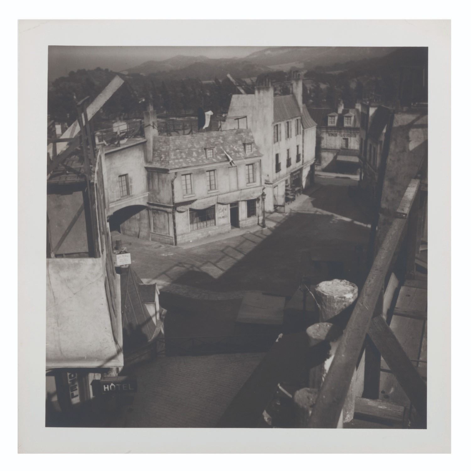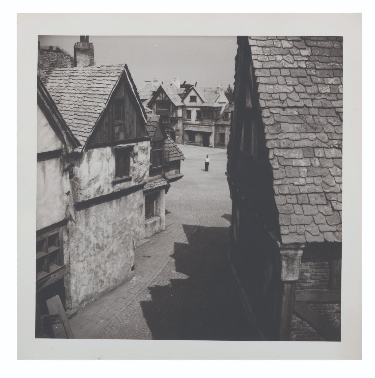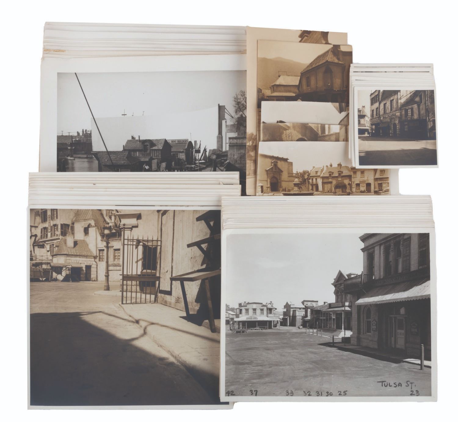 (Goff, 1930s-40s) A set of 63 photos of film backlots from the collection of Harper Goff. Best known for "20,000 Leagues Under the Sea", earlier Goff was an uncredited set designer on a range of films including "The Adventures of Don Juan" and "Casablanca." These photos show mostly empty standing sets on studio backlots including western, Spanish, and European streets on the Universal and Warner Brothers backlots, and more. Some photos include a single man standing in the center for scale reference, or signs of another production in progress. Measuring from 4" x 4" up to 11" x 10.5", the fiber based photos are in very good condition, with some edge wear including small corner creases often only in the borders, and much toning.