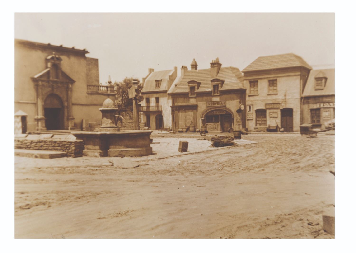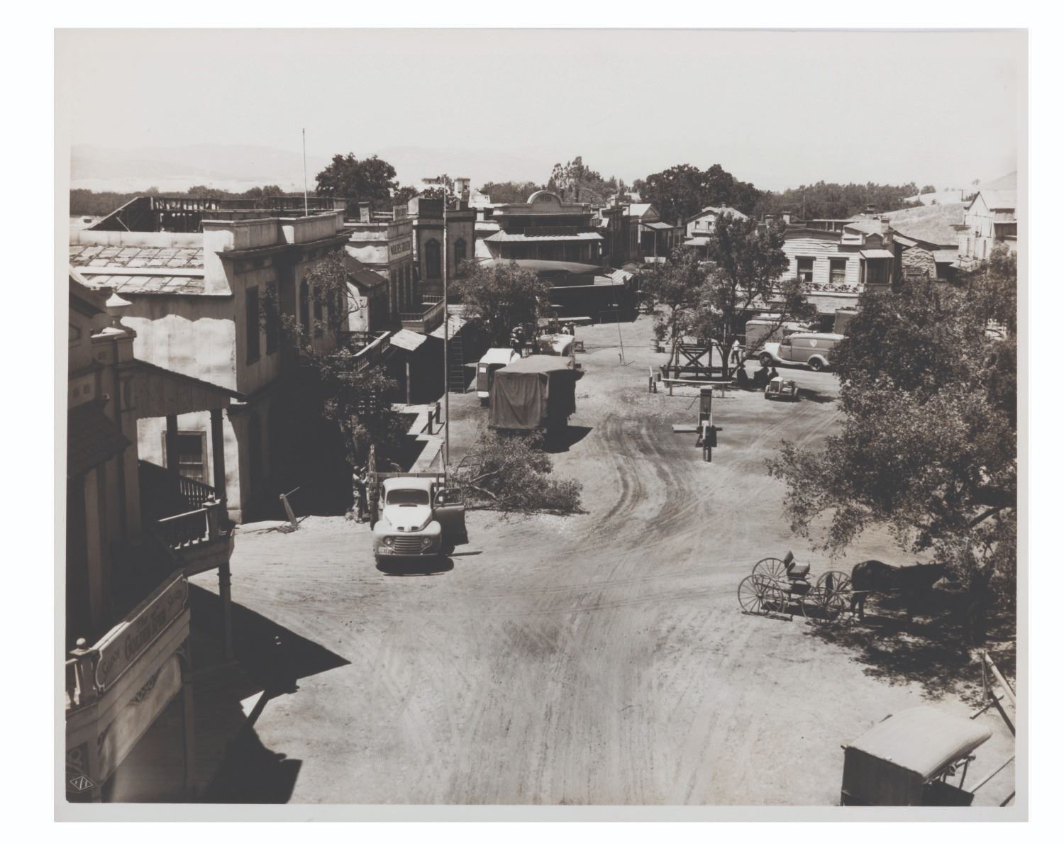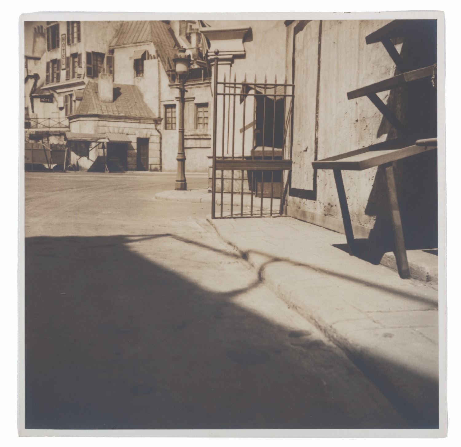 (Goff, 1930s-40s) A set of 63 photos of film backlots from the collection of Harper Goff. Best known for "20,000 Leagues Under the Sea", earlier Goff was an uncredited set designer on a range of films including "The Adventures of Don Juan" and "Casablanca." These photos show mostly empty standing sets on studio backlots including western, Spanish, and European streets on the Universal and Warner Brothers backlots, and more. Some photos include a single man standing in the center for scale reference, or signs of another production in progress. Measuring from 4" x 4" up to 11" x 10.5", the fiber based photos are in very good condition, with some edge wear including small corner creases often only in the borders, and much toning.
