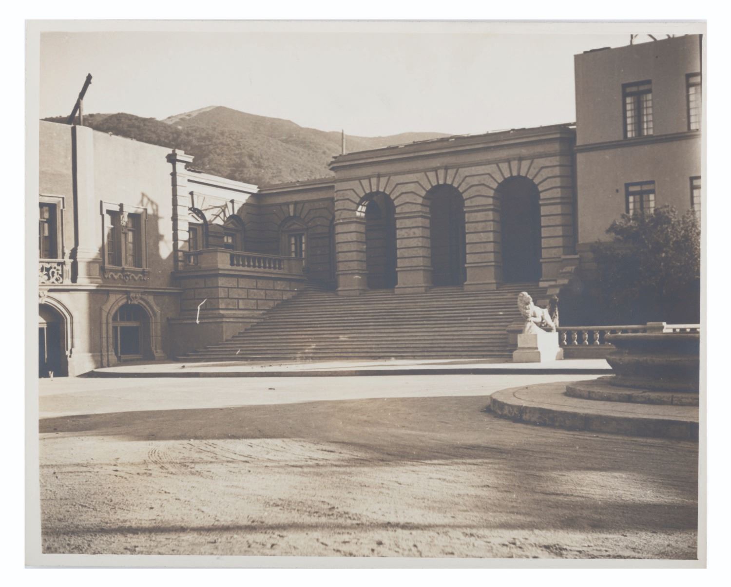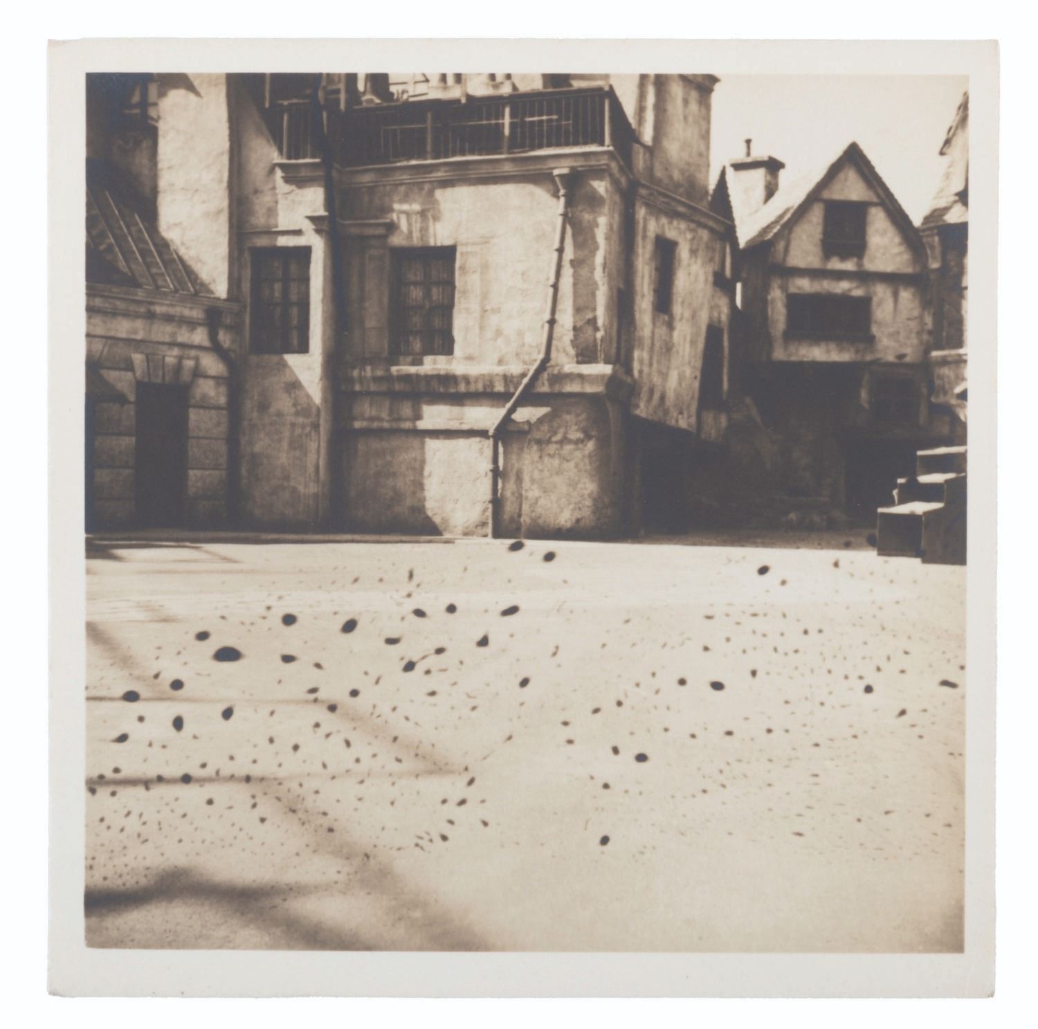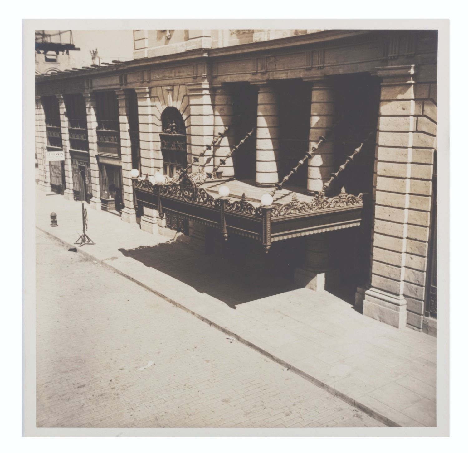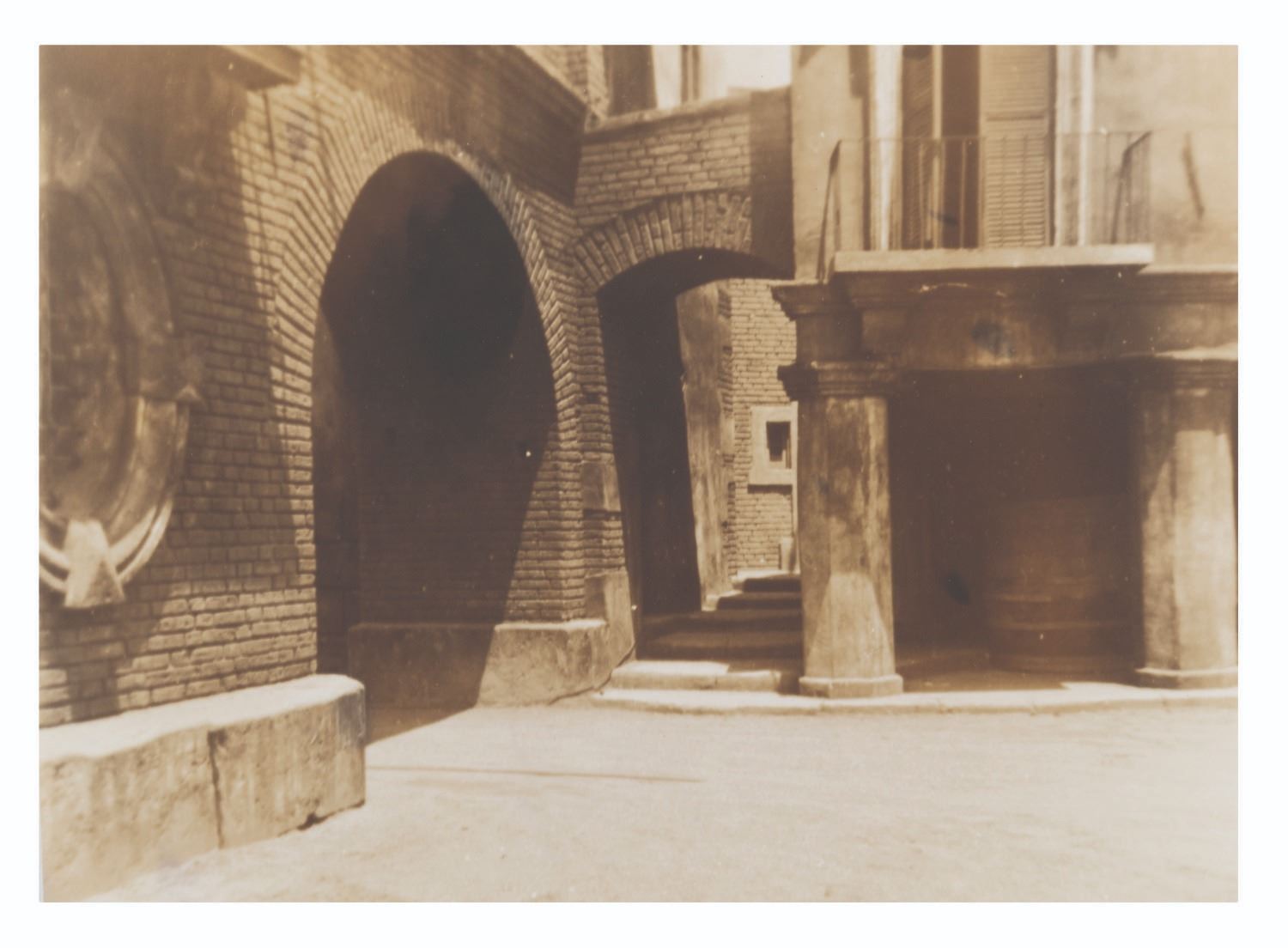 (Goff, 1930s-40s) A set of 63 photos of film backlots from the collection of Harper Goff. Best known for "20,000 Leagues Under the Sea", earlier Goff was an uncredited set designer on a range of films including "The Adventures of Don Juan" and "Casablanca." These photos show mostly empty standing sets on studio backlots including western, Spanish, and European streets on the Universal and Warner Brothers backlots, and more. Some photos include a single man standing in the center for scale reference, or signs of another production in progress. Measuring from 4" x 4" up to 11" x 10.5", the fiber based photos are in very good condition, with some edge wear including small corner creases often only in the borders, and much toning.