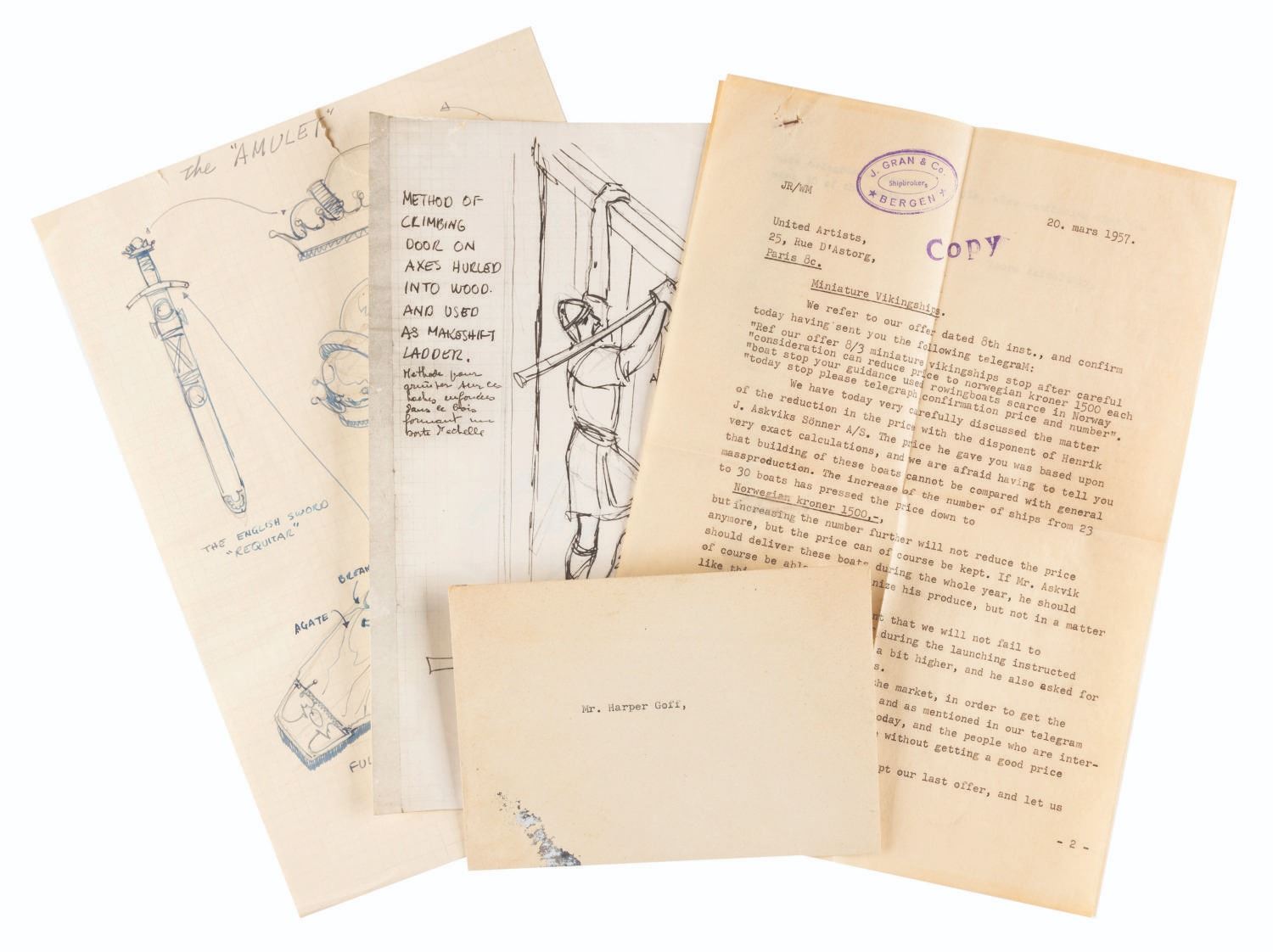 (United Artists, 1958) A set of three documents and drawings relating to the film “The Vikings” from the collection of Harper Goff. The set includes two sketches of production designs, one for an amulet is original while the other showing a method of climbing in battle is a photostat copy. Also included is a letter from a Norwegian shipbroker regarding the procurement of 30 ships for the film. Ranging in size from the 4.5" x 6.5" letter in the envelope to the 11.75" x 8.25" sketch, the pages are in good condition with some edge wear including a few small tears, some wrinkling, and browning to the letter from age. Disneyland. Artist Harper Goff’s fingerprints are all over pop culture’s history. Goff first met Walt Disney in London when the two collectors tried to buy the same train set. The Disney Legend would go on to design the Nautilus, create concepts for Main Street, U.S.A., and even play banjo in the popular Firehouse Five Plus Two, a band consisting of Goff and his fellow Disney artists. Goff’s talents were appreciated throughout Hollywood, as he worked for many different studios over the years. We are proud to have some of his wonderful designs up for auction.