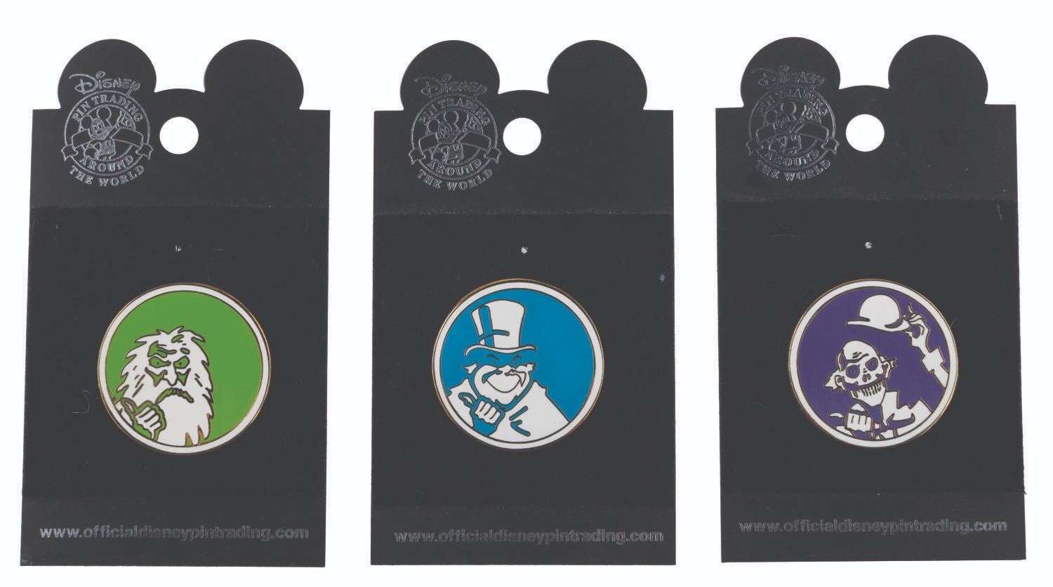 (Walt Disney World, 2002) A set of three Hitchhiking Ghost pins released exclusively at Walt Disney World in 2002. Measuring 1" in diameter each, the pins are in very good condition on their original backing cards.