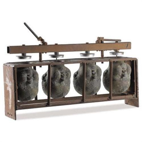 <B>A Set of Iron Molds<BR></B></I>Unknown maker<BR>Nineteenth Century<BR>The metal frame holds moulds for four doll heads with a bar that clamps down to seal<BR>Unmarked<BR>15 inches high x 28.7 inches wide x 5.7 inches deep<BR><BR><b>Shipping:</b> Requires 3rd Party Shipping (<a target="_blank" href="http://www.heritageauctions.com/common/shipping.php">view shipping information</a>)