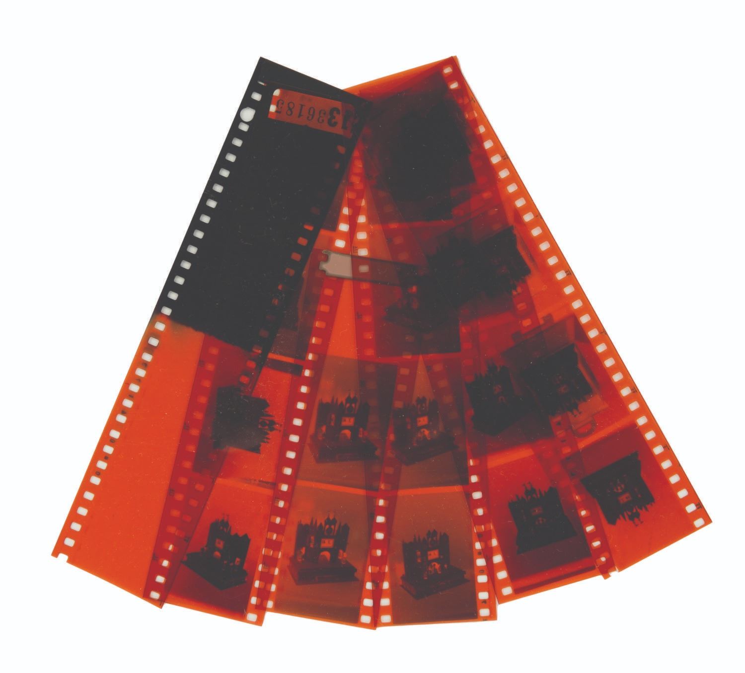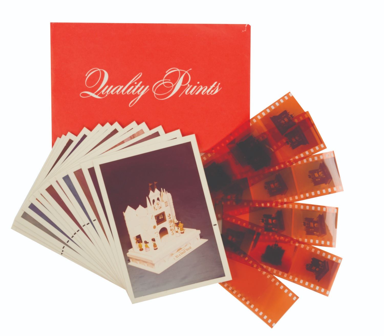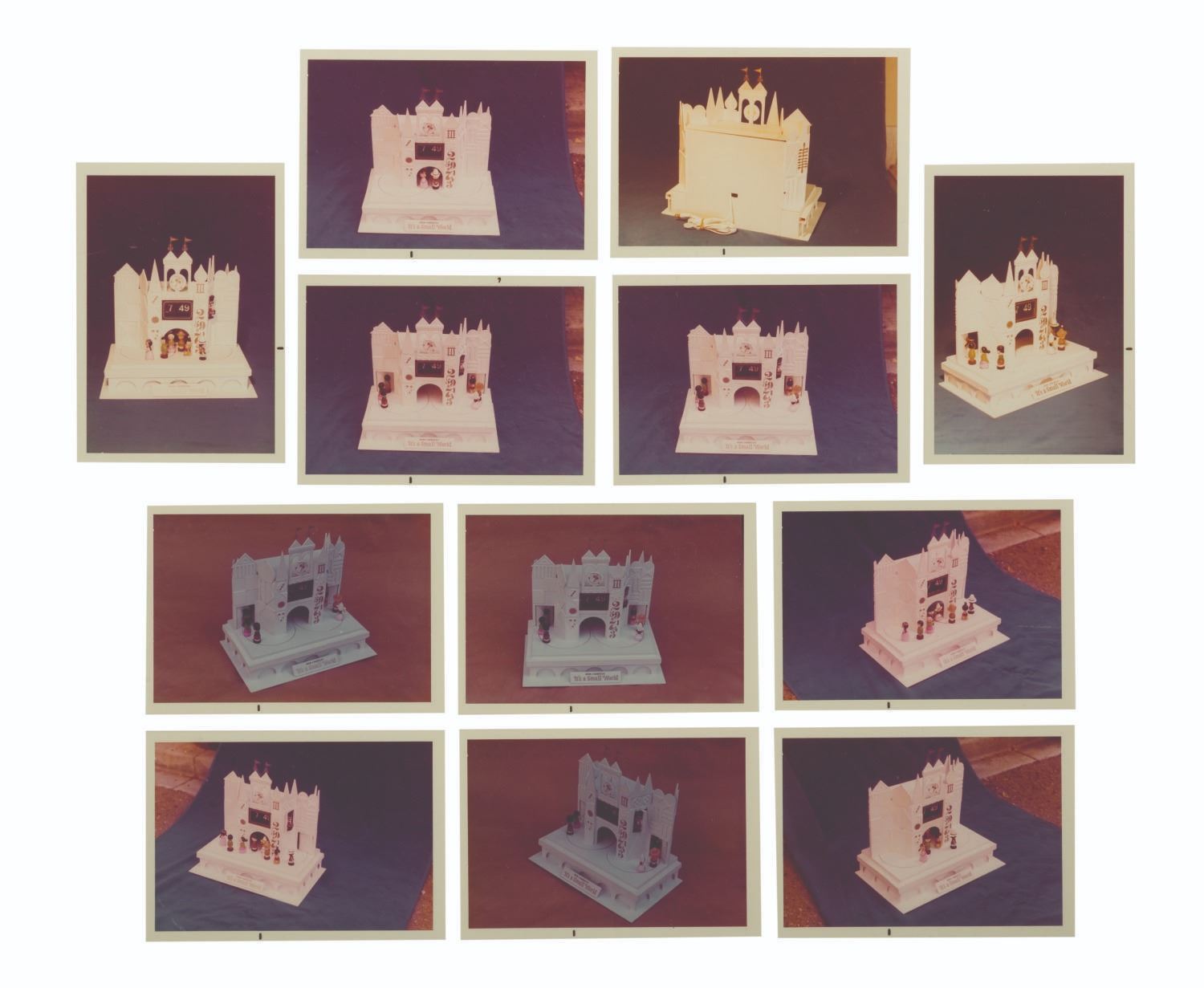 (Disneyland, 1980s) A collection of 15 photographs and 6 negative strips depicting the prototype of an It’s a Small World Clock souvenir. Ranging in size from a 1.5” x 4” film strip to the 3.5” x 5” photos, the items are in fair to good condition with heavy spotting on the photos, light scratches on the strips, and discoloration from age.