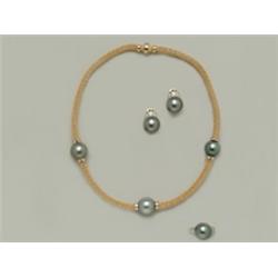 Necklace 14 K gold, flexible tube shape necklace, 3 grey Tahiti cultivated pearls, flanked by white gold inlay with 48 brilliants circa 1.10 ct (MTCrVs), modern, marked, diameter of the middle one: 16.5 mm, diameter of the others: 16.0 and 15.0 mm, length: 43 cm, weight: 44.9 g. A Pair of Earrings 18 K white and yellow gold, 2 grey Tahiti cultivated pearls, diameter: 15.5 mm and 26 tiny brilliants circa 0.75 ct (MTCrVs), pierced earrings and ear clips, modern, marked, weight: 19.9 g. Lady’s Ring 14 K white gold, 1 grey Tahiti cultivated pearl, diameter: 15.5 mm, flanked by 10 tiny brilliants circa 0.25 ct (MTCrVs), modern, marked, diameter of the shank: 19 mm, weight: 12.5 g Maker: Rakács György