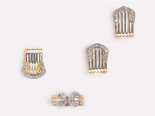 18 K rose, yellow and white gold combination, A pair of earrings, ring and pendant, 49 brilliants circa 0.50 ct (MCrSi), modern, marked, weight: 14.9 g, diameter: 17.0 mm