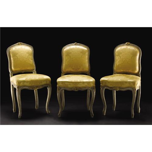 <B>A Set of Louis XV Provincial Armchairs</B></I><BR><BR>Unknown maker, France<BR>Eighteenth Century<BR>Polychromed wood and giltwood<BR>Unmarked<BR>37 inches high<BR><BR>With gilt floral spray at crest and seat rail and fluted cabriole leg, covered with gold floral damask upholstery. <B>Condition Report:</B> Minor loss to paint, refinished upholstery.<BR><BR><b>Shipping:</b> Requires 3rd Party Shipping (<a target="_blank" href="http://www.heritageauctions.com/common/shipping.php">view shipping information</a>)