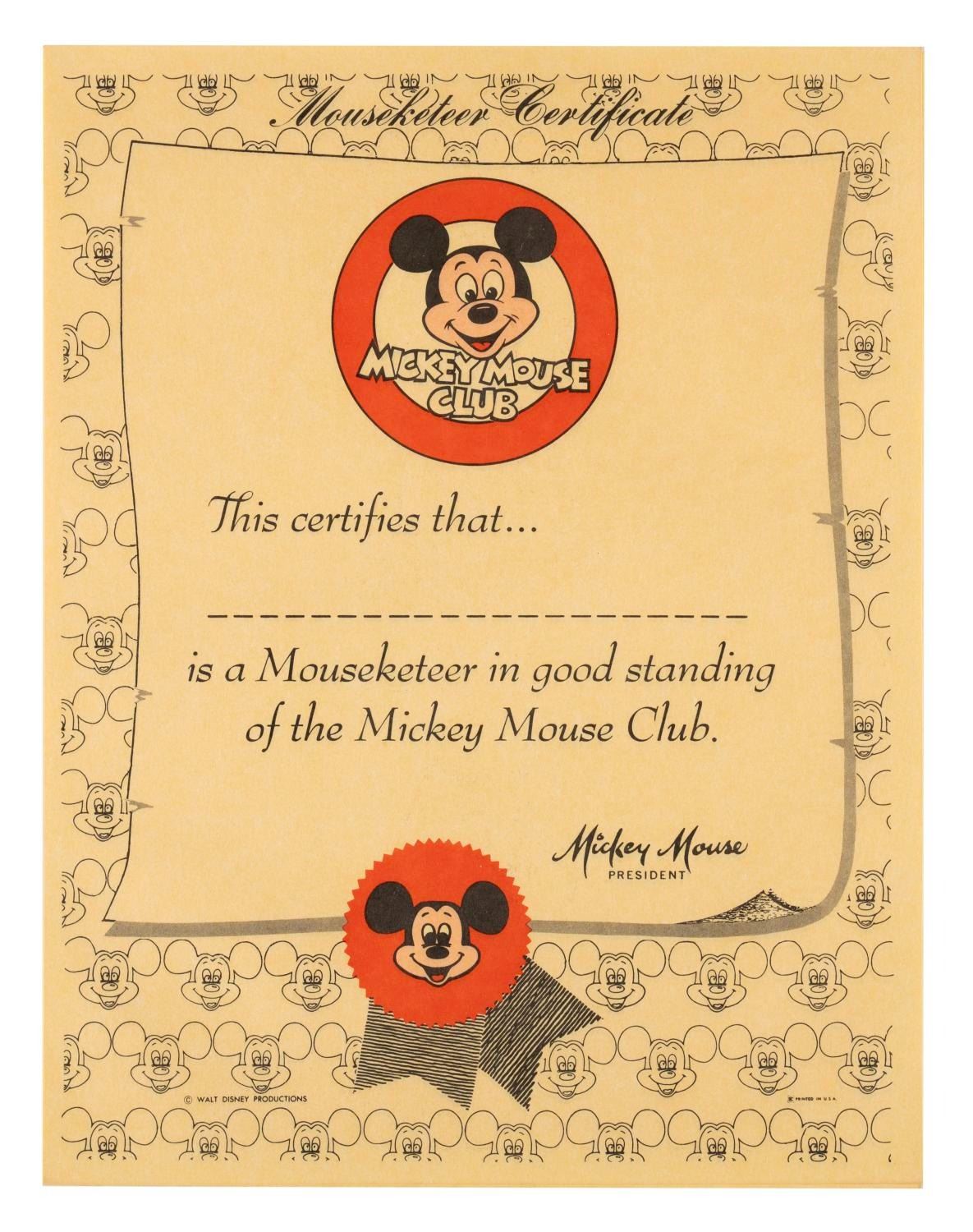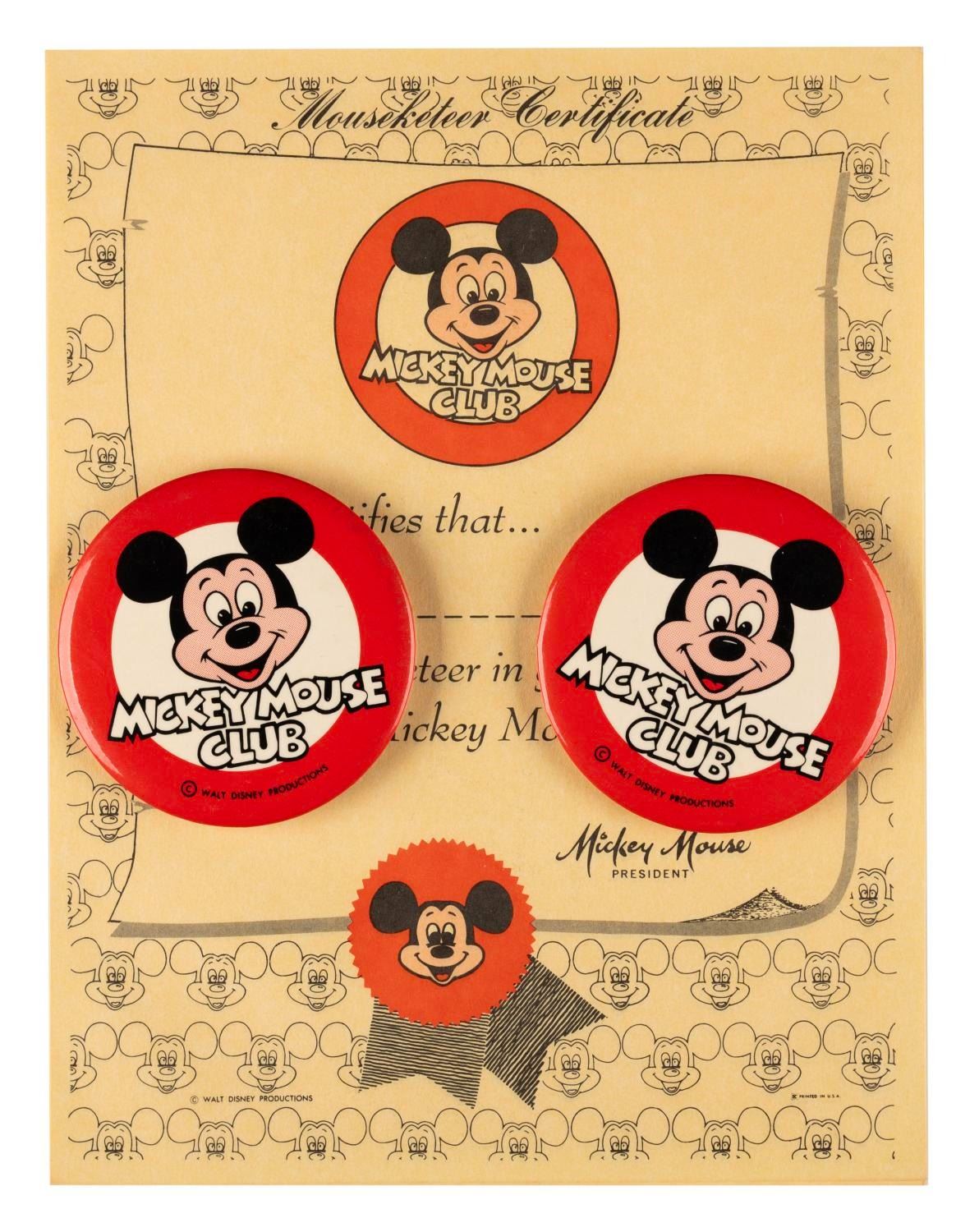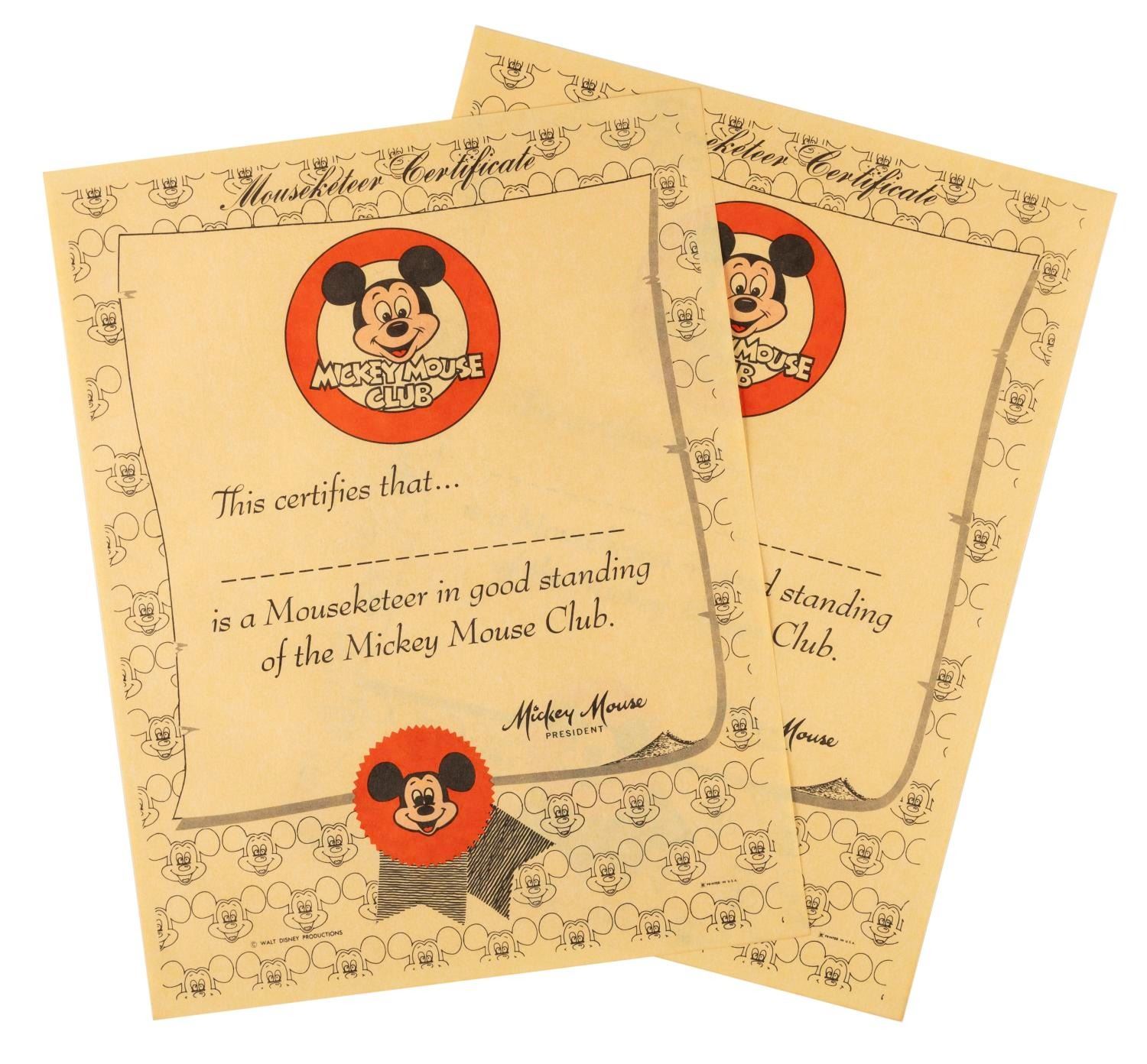 (Disney, 1970s-1980s) A set of Mickey Mouse Club certificates and buttons. The 3.5" in diameter buttons and 8.5" x 11" certificates are in very good condition with light scratches on the buttons.