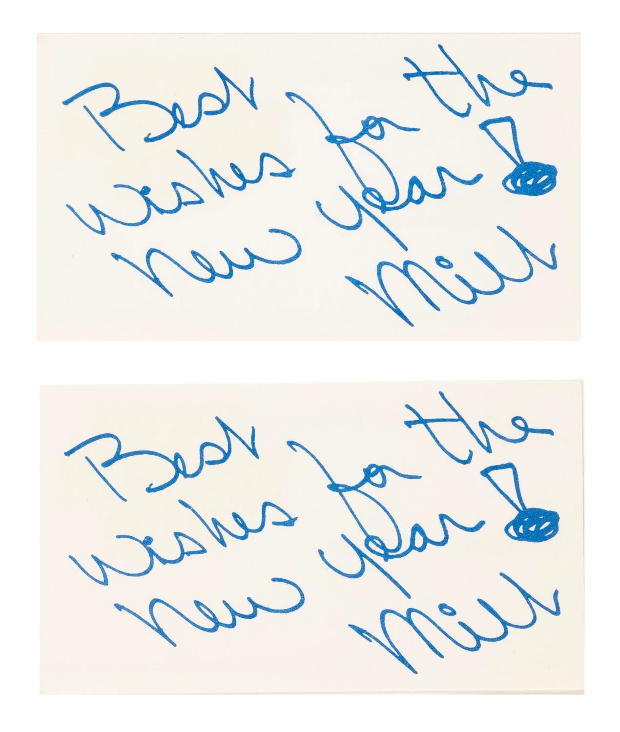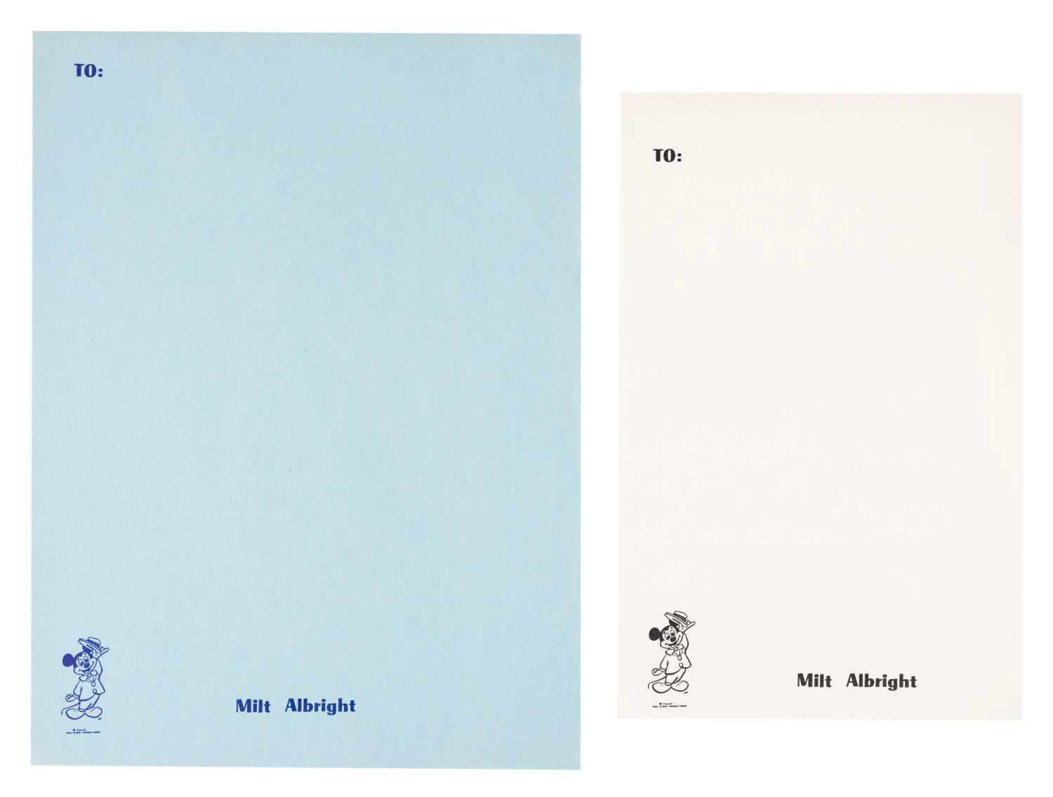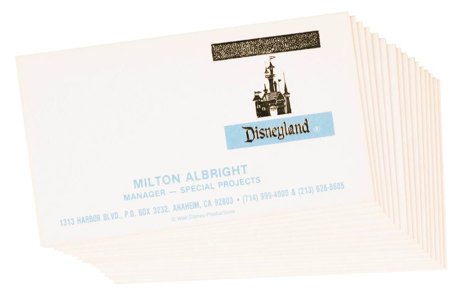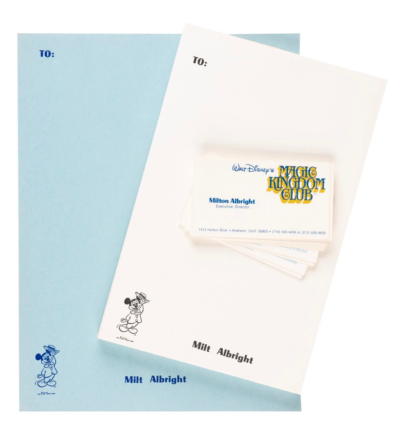 (Disneyland, 1970s-80s) A collection of Disney Legend Milt Albright's personal stationery from Disneyland. Albright became the manager of accounting for Disneyland in 1954, and created the Magic Kingdom Club in 1958. This collection includes a large blue notepad, a small white notepad, two Magic Kingdom Club business cards, and seventeen Disneyland business cards. The notepads measure 10.75" x 7.5" and 8.5" x 5.5", and the business cards at 2" x 3.5". The set is in very good condition.