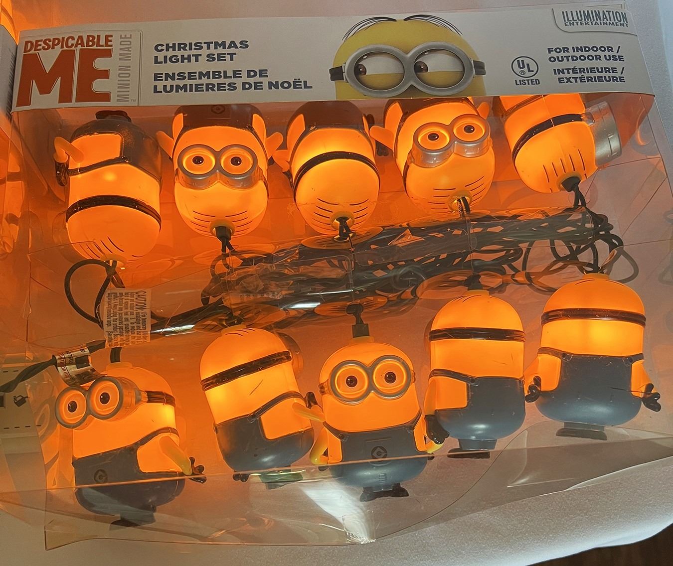 (Universal Studios) This is a Despicable Me Minion Made Christmas light set. The lights are plastic versions of Bob and Stuart. Each strand has 10 lights. It is in working order. It measures 11.5" x 2.25" x 8.75" and weighs 1 lb.