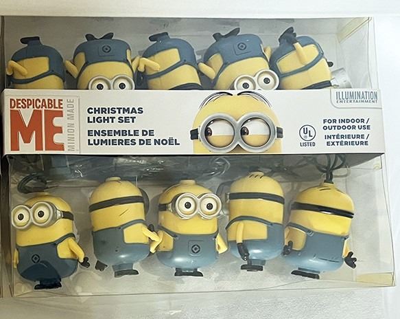 (Universal Studios) This is a Despicable Me Minion Made Christmas light set. The lights are plastic versions of Bob and Stuart. Each strand has 10 lights. It is in working order. It measures 11.5" x 2.25" x 8.75" and weighs 1 lb.