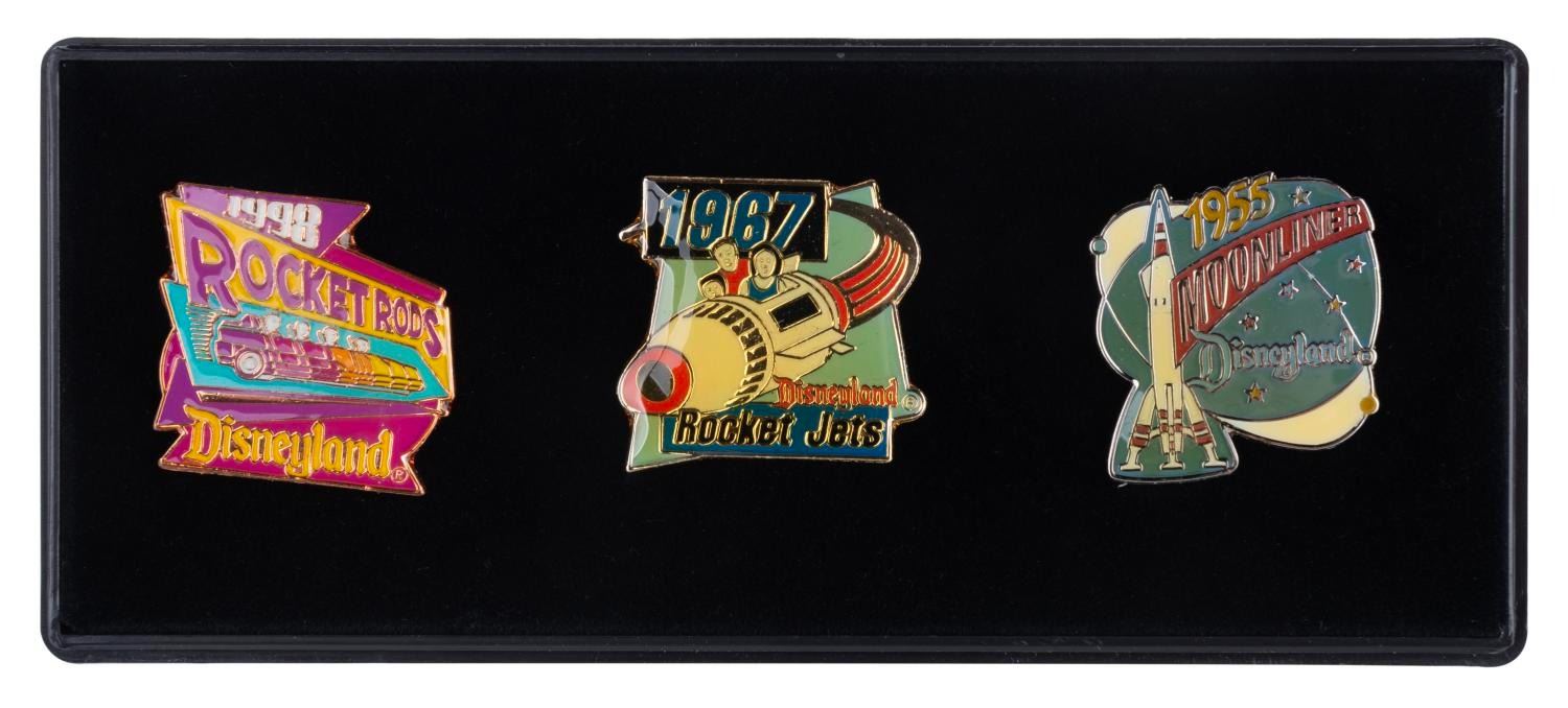 (Disneyland, 1998) A 3-piece pin set given to select members of the press at the grand opening of the New Tomorrowland refurbishment in 1998. The set includes pins for Rocket Rods, Rocket Jets, and the Moonliner. The 1” x 1” pins in the original 2” x 5” display box are in fine condition.