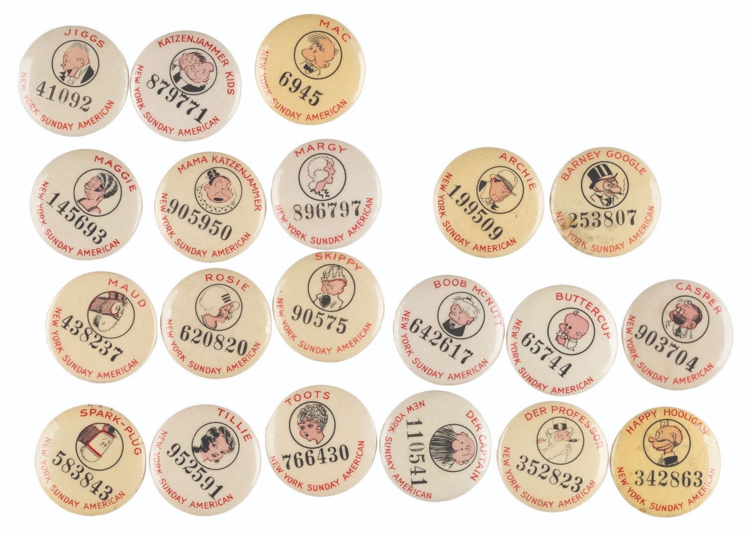 (New York Sunday American, 1930s) A complete set of twenty New York Sunday American comic buttons, part of a contest run by the newspaper. Readers were given a lucky number and if their number matched the one in the paper’s comic pages, they won a prize. Featured are comic stars Barney Google, Spark-Plug, Toots, the Katzenjammer Kids, and many more. Measuring 1.25” in diameter each, the buttons are in good condition with scratches, wear, creases, pinholes, oxidation on the reverse, and discoloration from age.