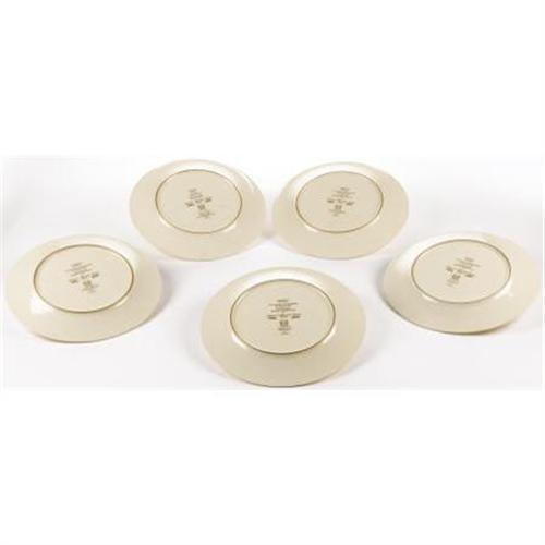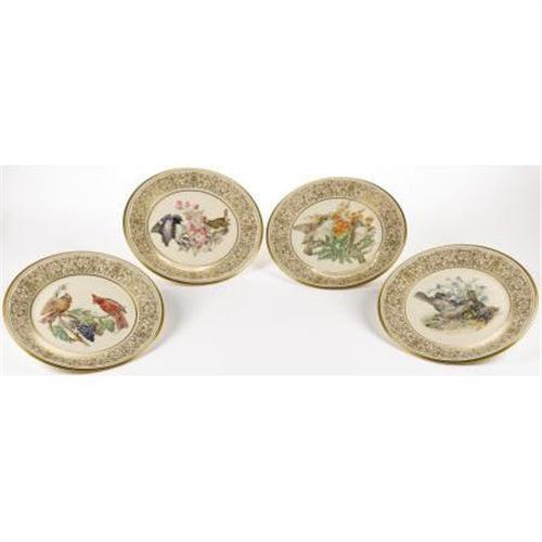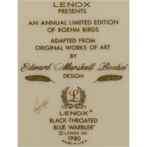 <B>A Set of Nine Porcelain Plates<BR></B></I>Edward Marshall Boehm<BR>Lenox<BR>11-5/8 inches diameter (26.92 cm)<BR> <BR>The limited annual edition of Boehm birds adapted from original works of art with first of series in 1970, signed on front; comprising of 1970, Wood Thrush, official bird of the nation's capital; 1971, Goldfinch; 1973, Meadowlark; 1974, Rufous Hummingbird; 1975, American Redstart; 1976, Cardinal; 1978, Mockingbirds; 1980, Black-throated Blue Warbler; 1981, Eastern Phoebe.<BR><BR><b>Shipping:</b> Requires 3rd Party Shipping (<a target="_blank" href="http://www.heritageauctions.com/common/shipping.php">view shipping information</a>)