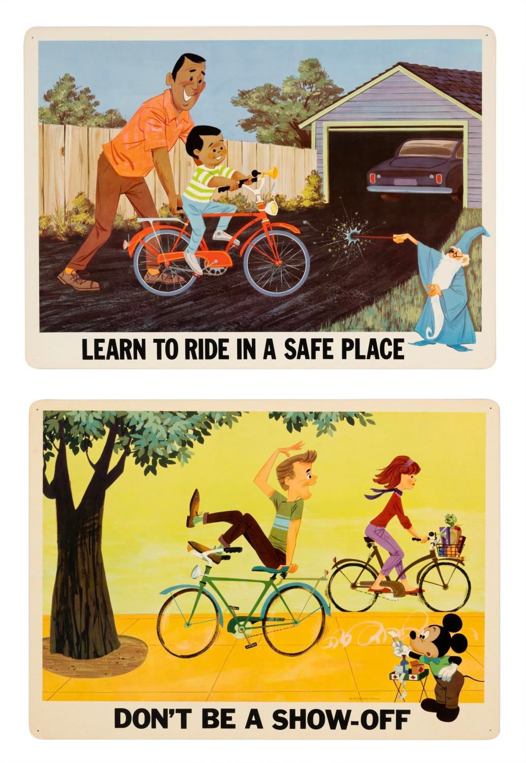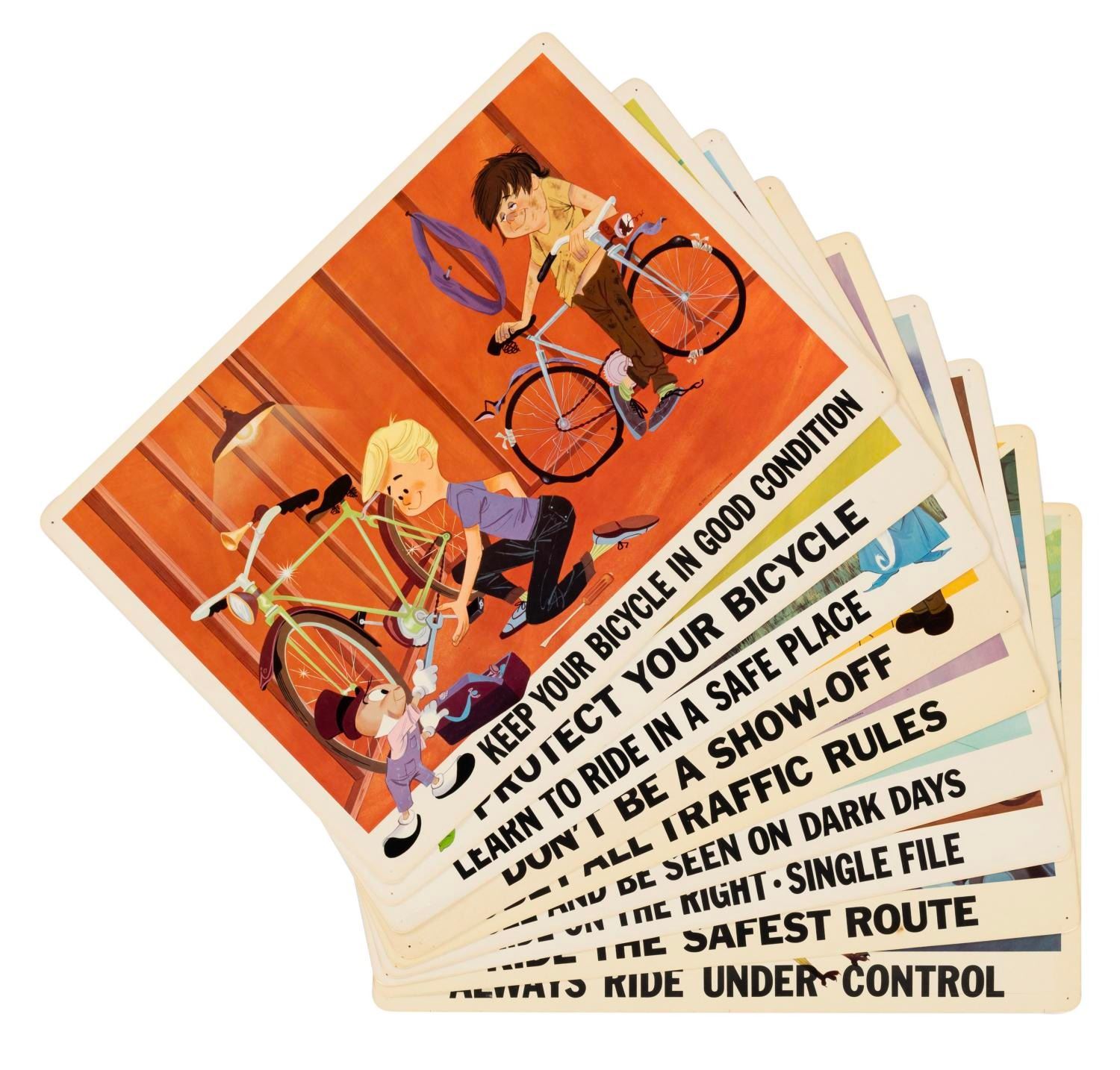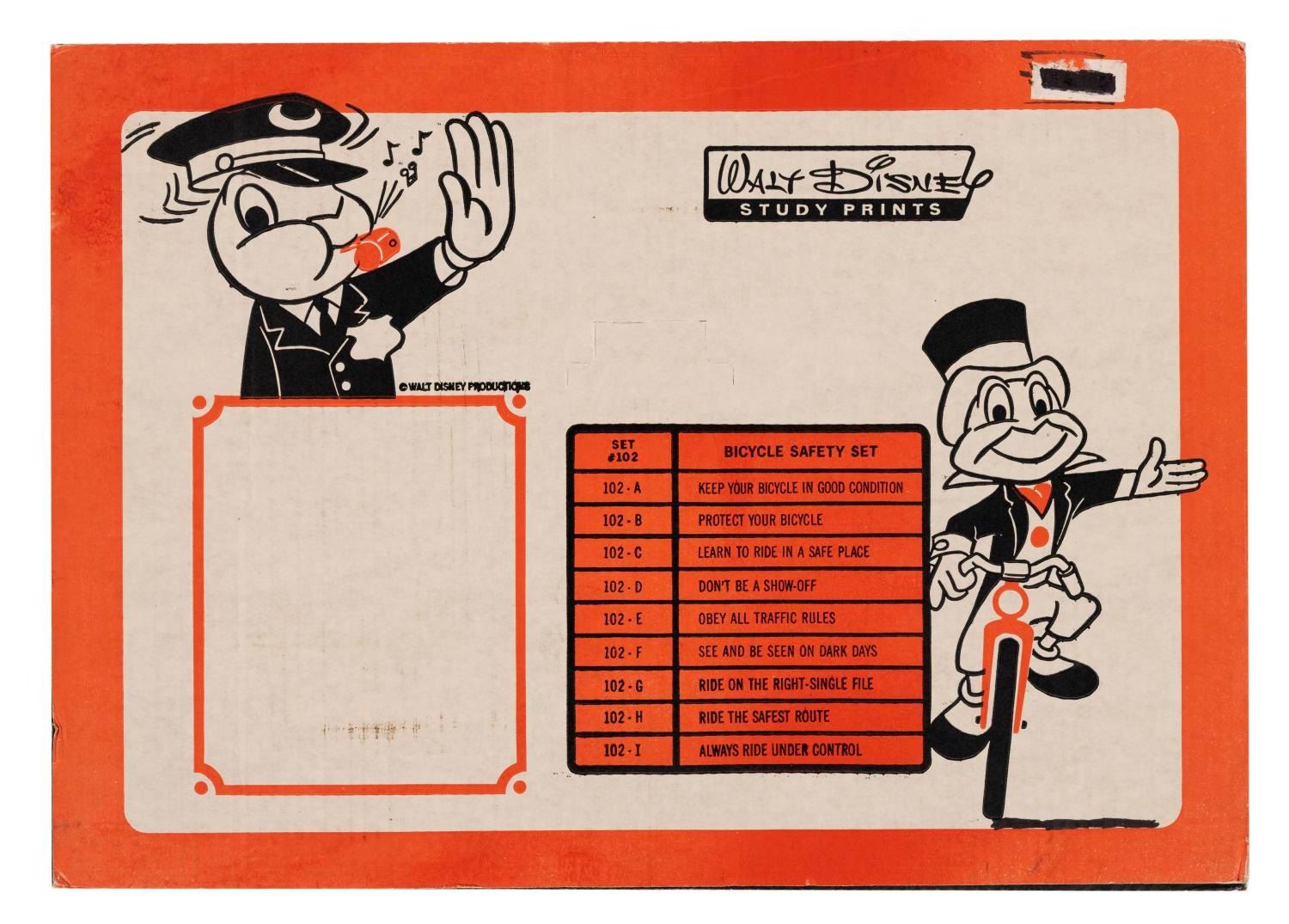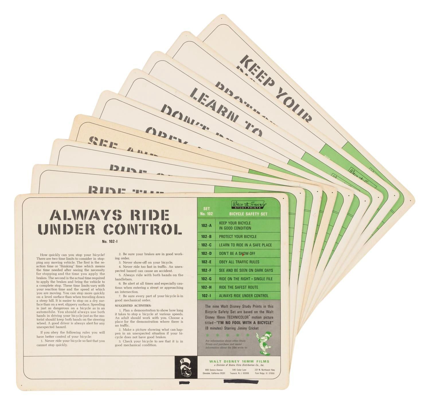 (Disney, 1966) A complete set of nine Walt Disney No. 102 Bicycle Safety Study prints in their original cardboard case which converts into an easel. In the 1960s Walt Disney Educational Materials Co. began producing a series of double-sided prints for study aids in elementary schools. Measuring 18" x 13" each, the prints are in very good condition with light wear and discoloration from age and minor indentations. The case measures 22" x 15" and is in very good condition with handling wear and discoloration from age.