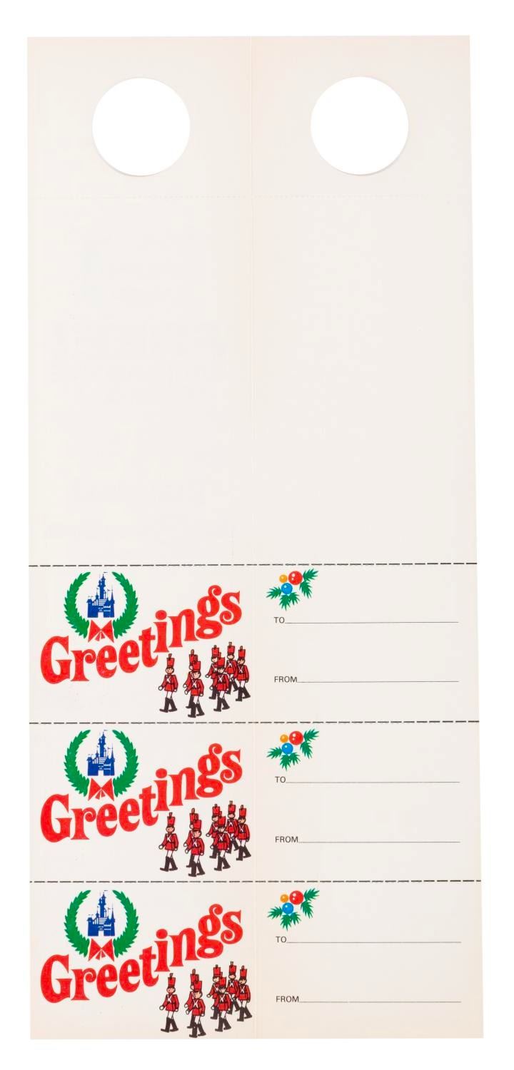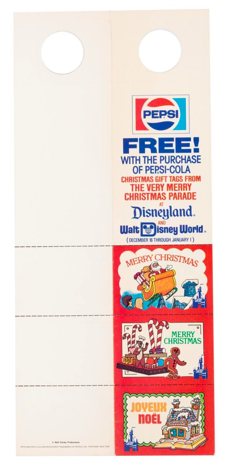 (Pepsi-Cola/Disney, 1988) Three Pepsi-Cola gift with purchase Christmas tags from the Very Merry Christmas Parade at Disneyland and Walt Disney World. Measuring 5" x 11.25", the complete hang tag sheet is in very good condition with light discoloration and creasing.