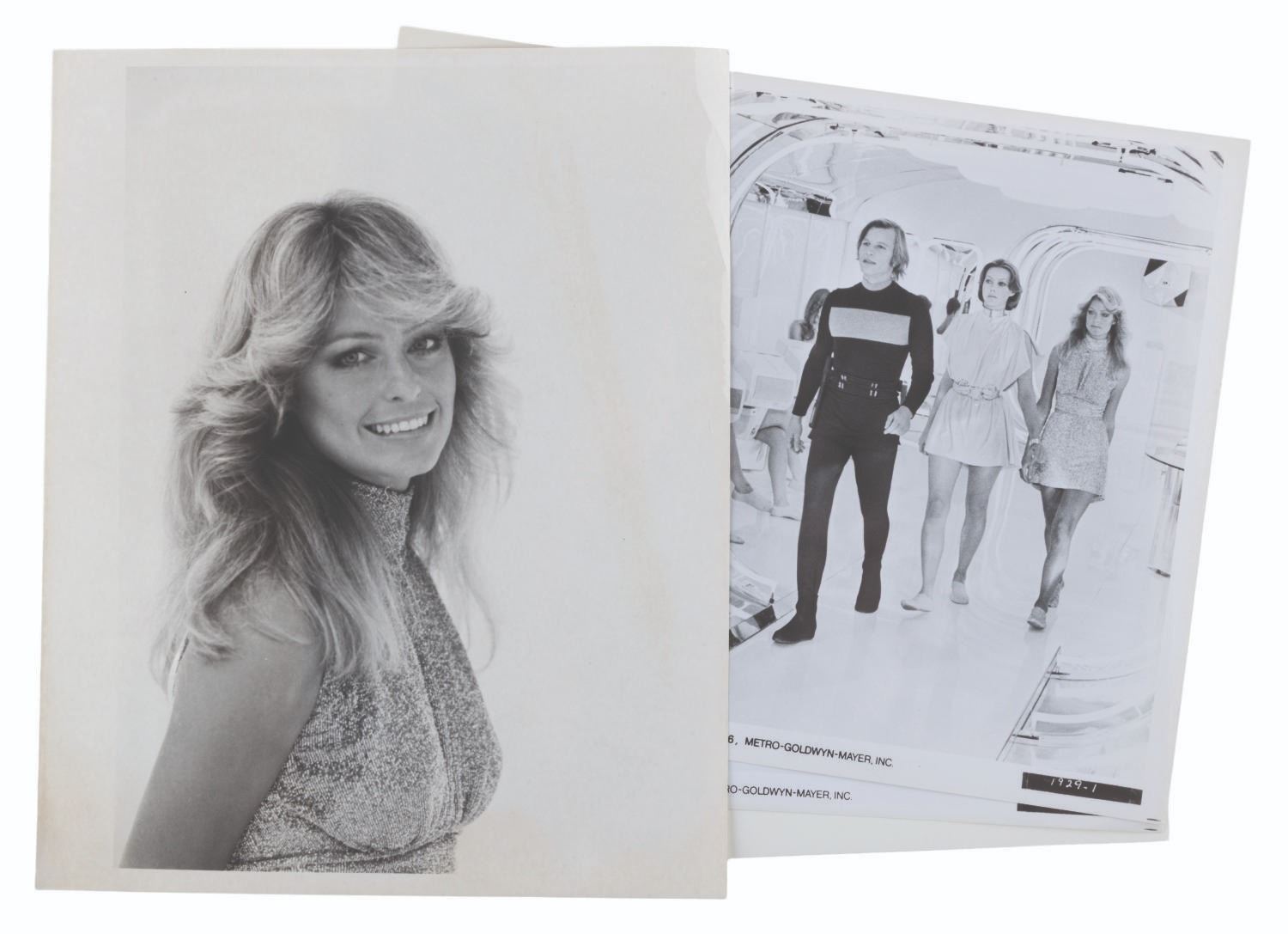 (MGM, 1976) A collection of three publicity photos and one behind the scenes shot of the ”New You” boutique scene in “Logan’s Run” that featured Farrah Fawcett-Majors. Each measuring 8” x 10”, the photos are in very good condition.