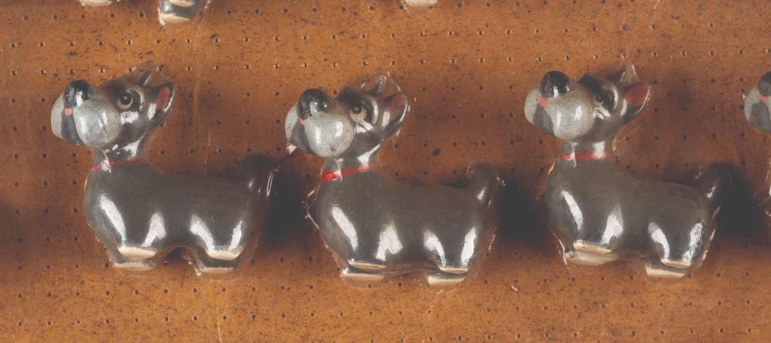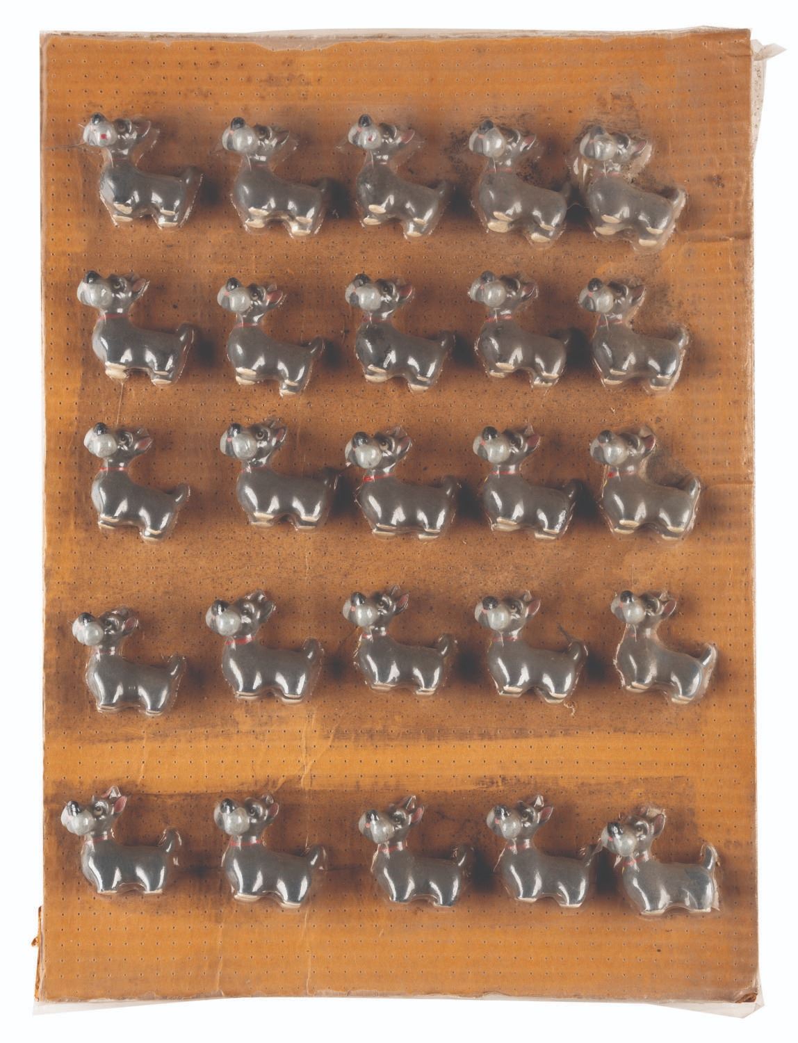 (Disney, 1950s-70s) A shrink-wrapped set of 25 ceramic Jocks from "Lady and the Tramp." Measuring 1.75" x 1.75" each on 12" x 16" cardboard backing, the unopened ceramic figures are as originally shipped by the manufacturer, in assumed very good to fine condition with several red paint marks from production, and may have some unseen cracks, damage, or wear once unwrapped.
