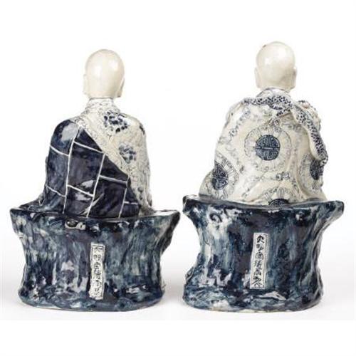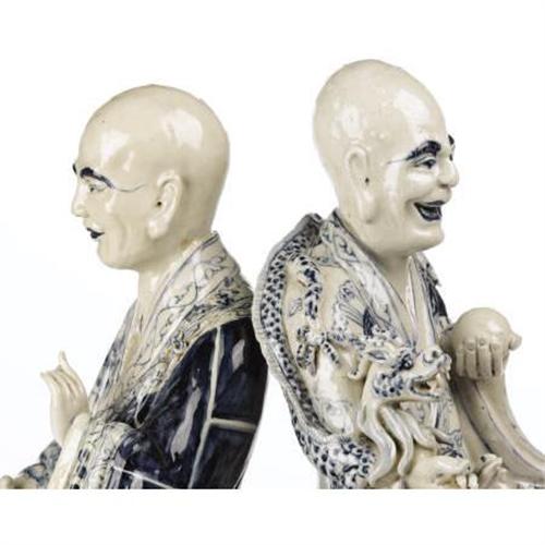 <B>A Set of Six Chinese Ceramic Figures of Lohans<BR></B></I>Unknown maker<BR>Circa 1900<BR>Glazed in blue and white, each holding various attributes, the backs with Ming-style six-character marks within rectangular panels.<BR>15 inches to 17 inches high<BR><BR><b>Shipping:</b> Requires 3rd Party Shipping (<a target="_blank" href="http://www.heritageauctions.com/common/shipping.php">view shipping information</a>)