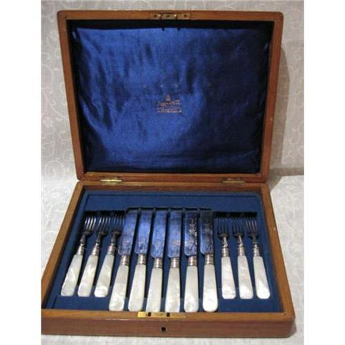 Engraved set of six silverplate dessert knives and forks with handles made of mother of pearl. This complete set comes in its original wood presentation box that is lined with blue satin and velvet. The set are made by Mappin & Webb, Sheffield.