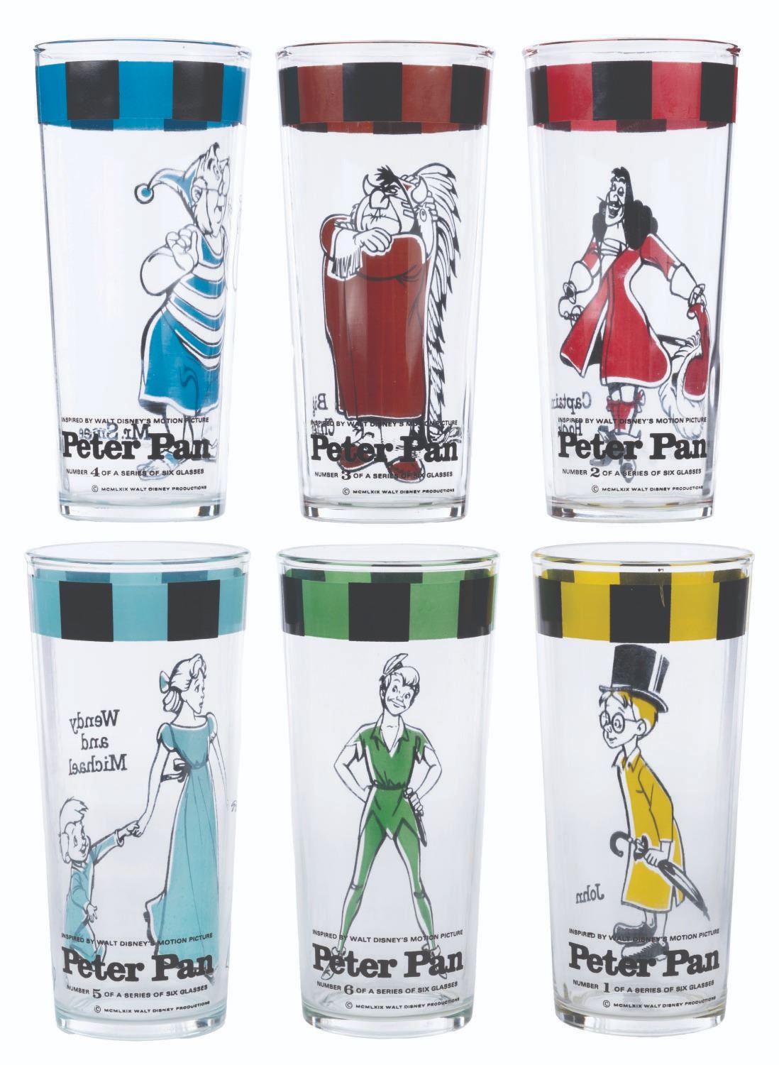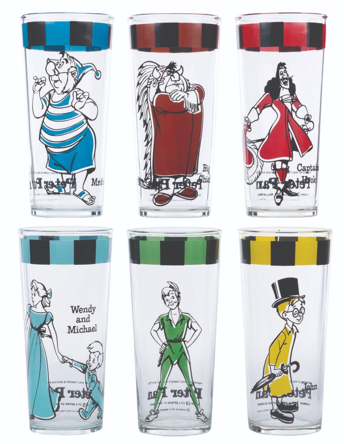 (Disney, 1969) A complete set of six promotional glasses for the 1969 re-release of “Peter Pan,” featuring John, Captain Hook, Big Chief, Mr. Smee, Wendy, Michael, and Peter. Measuring 6.5” tall and 3” in diameter, the colorful glasses are in very good to good condition with light paint loss, scratches, smudges, stains, and wear.