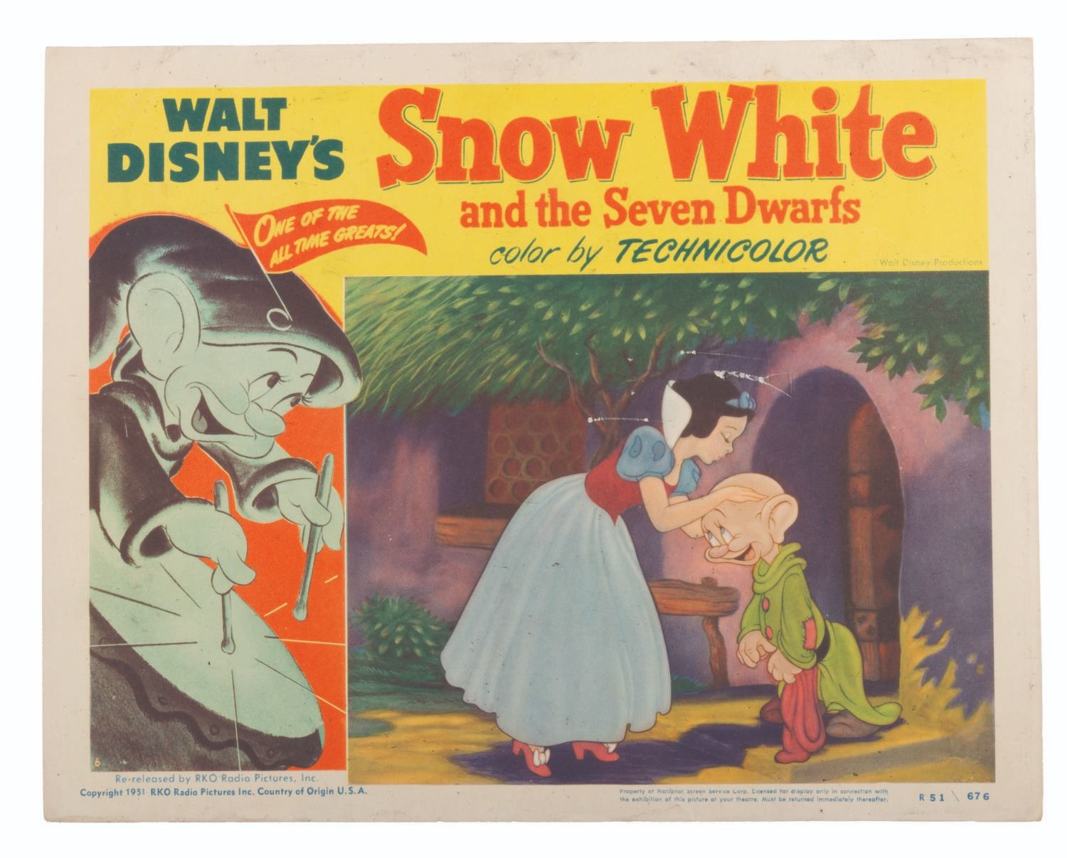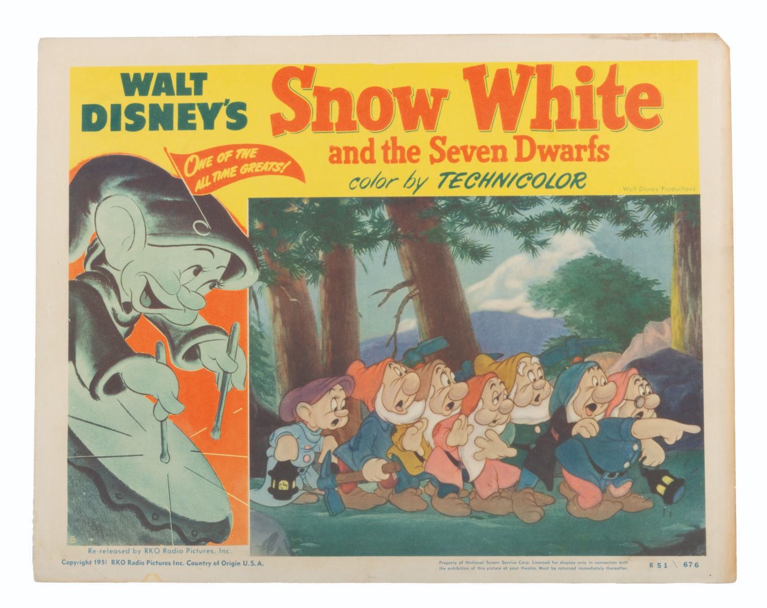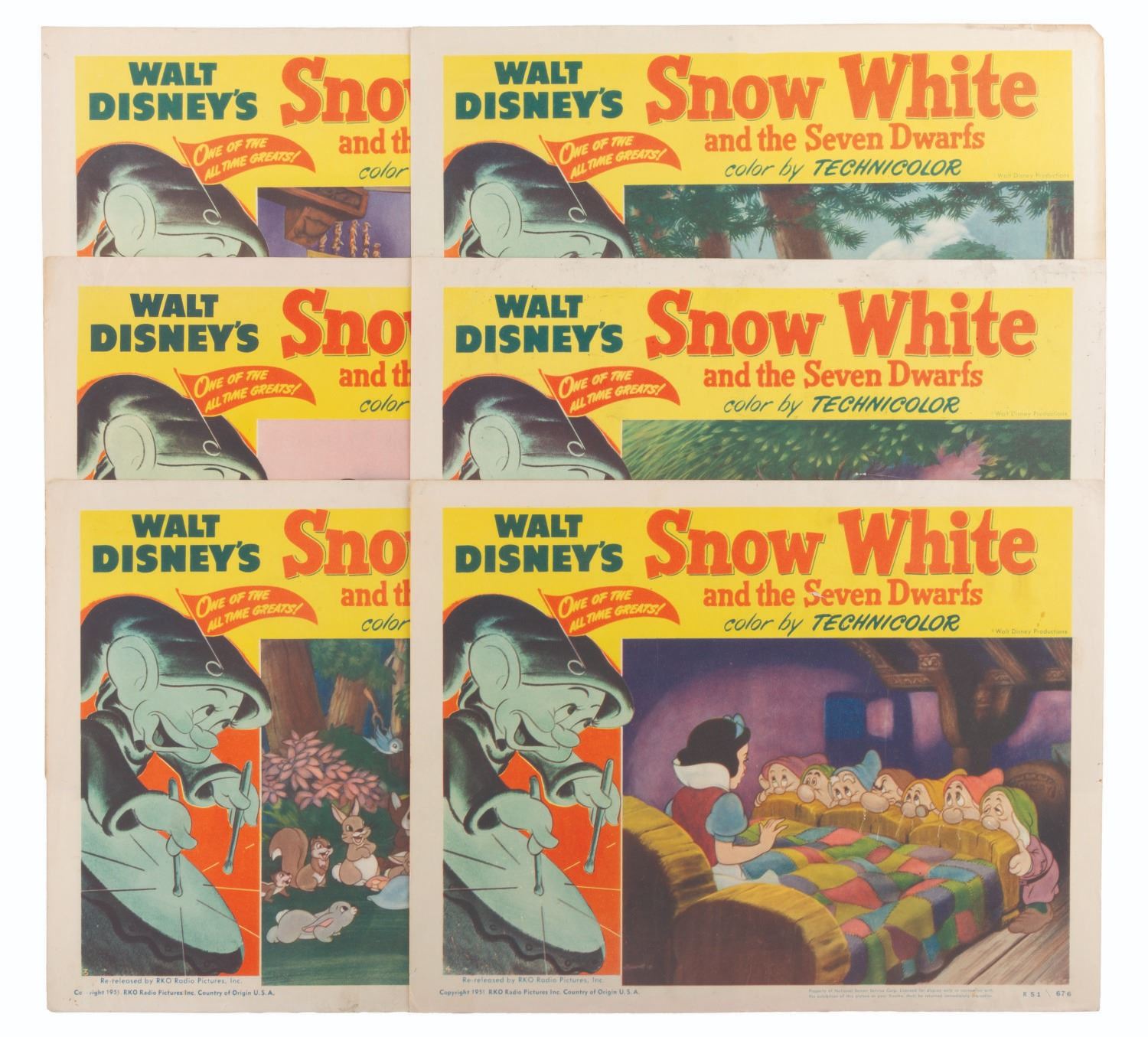 (Disney, 1951) A set of six lobby cards from the 1951 re-release of “Snow White and the Seven Dwarfs.” Each measuring 11” x 14”, the lobby cards are overall in very good condition with small tears, some edge wear, and discoloration typical of age, with two in good condition showing more wear and spotting.