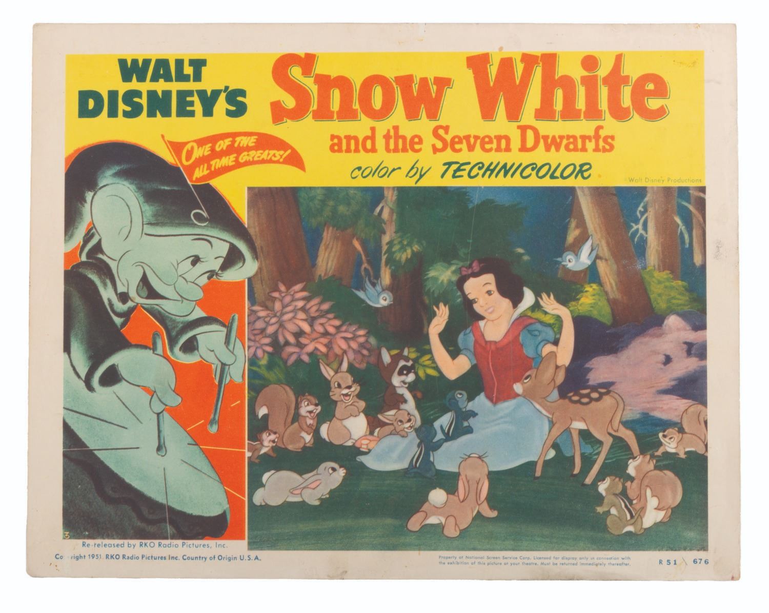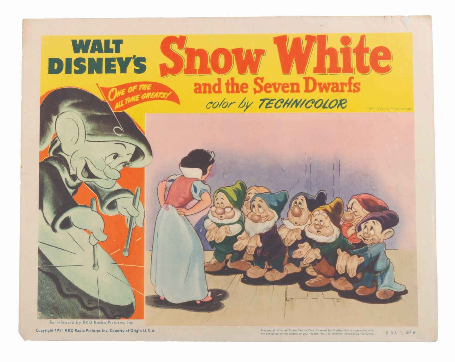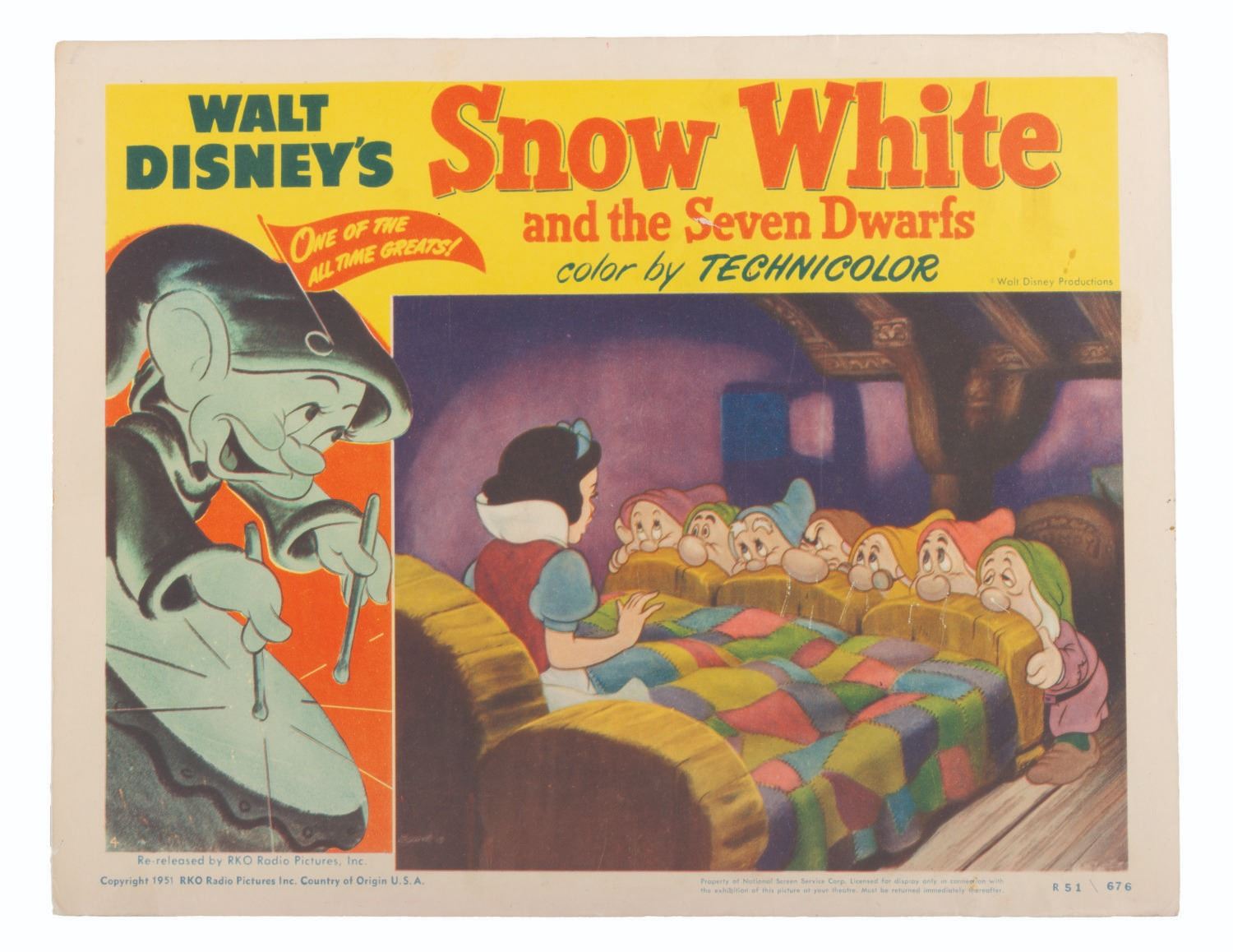 (Disney, 1951) A set of six lobby cards from the 1951 re-release of “Snow White and the Seven Dwarfs.” Each measuring 11” x 14”, the lobby cards are overall in very good condition with small tears, some edge wear, and discoloration typical of age, with two in good condition showing more wear and spotting.