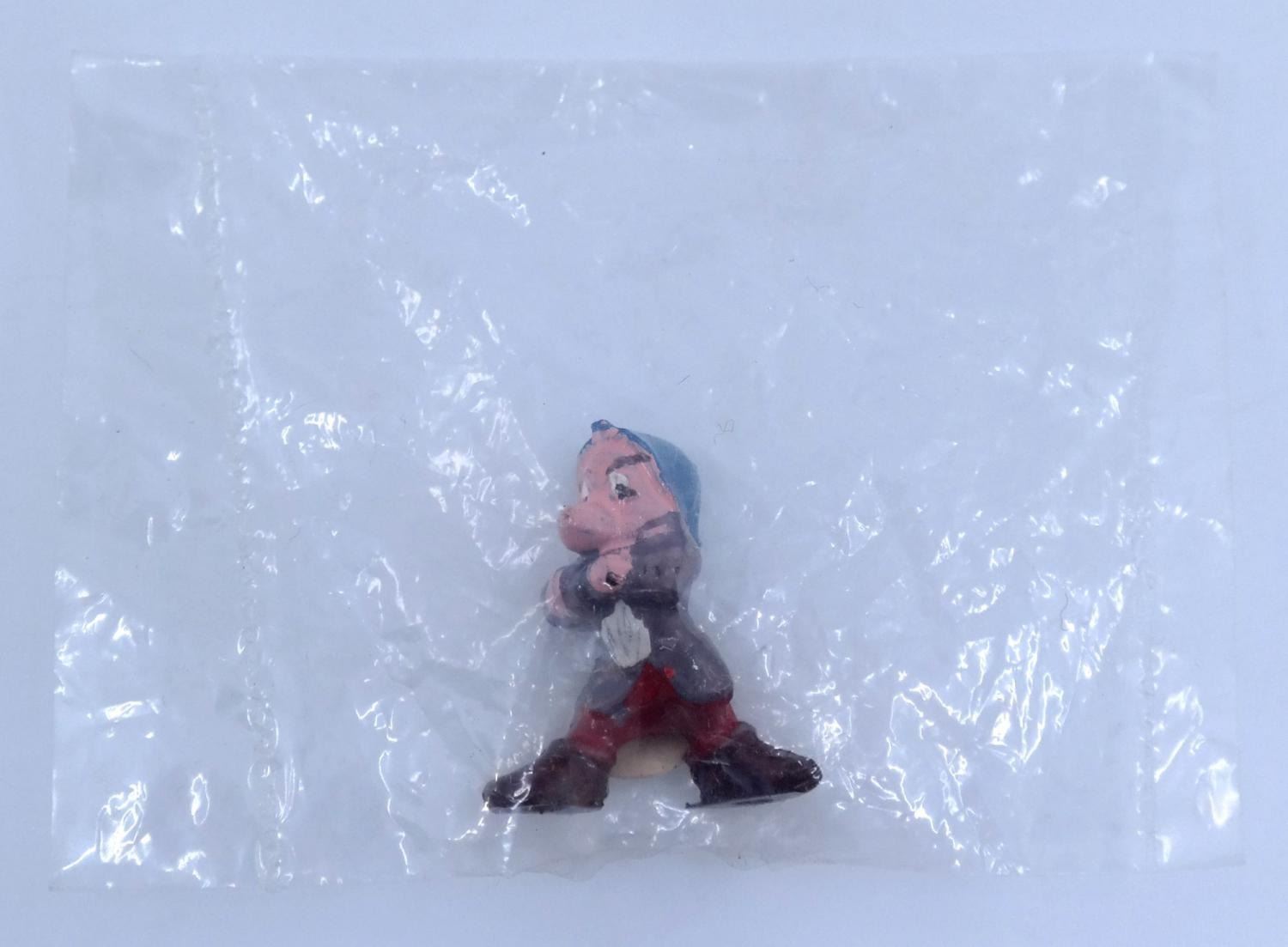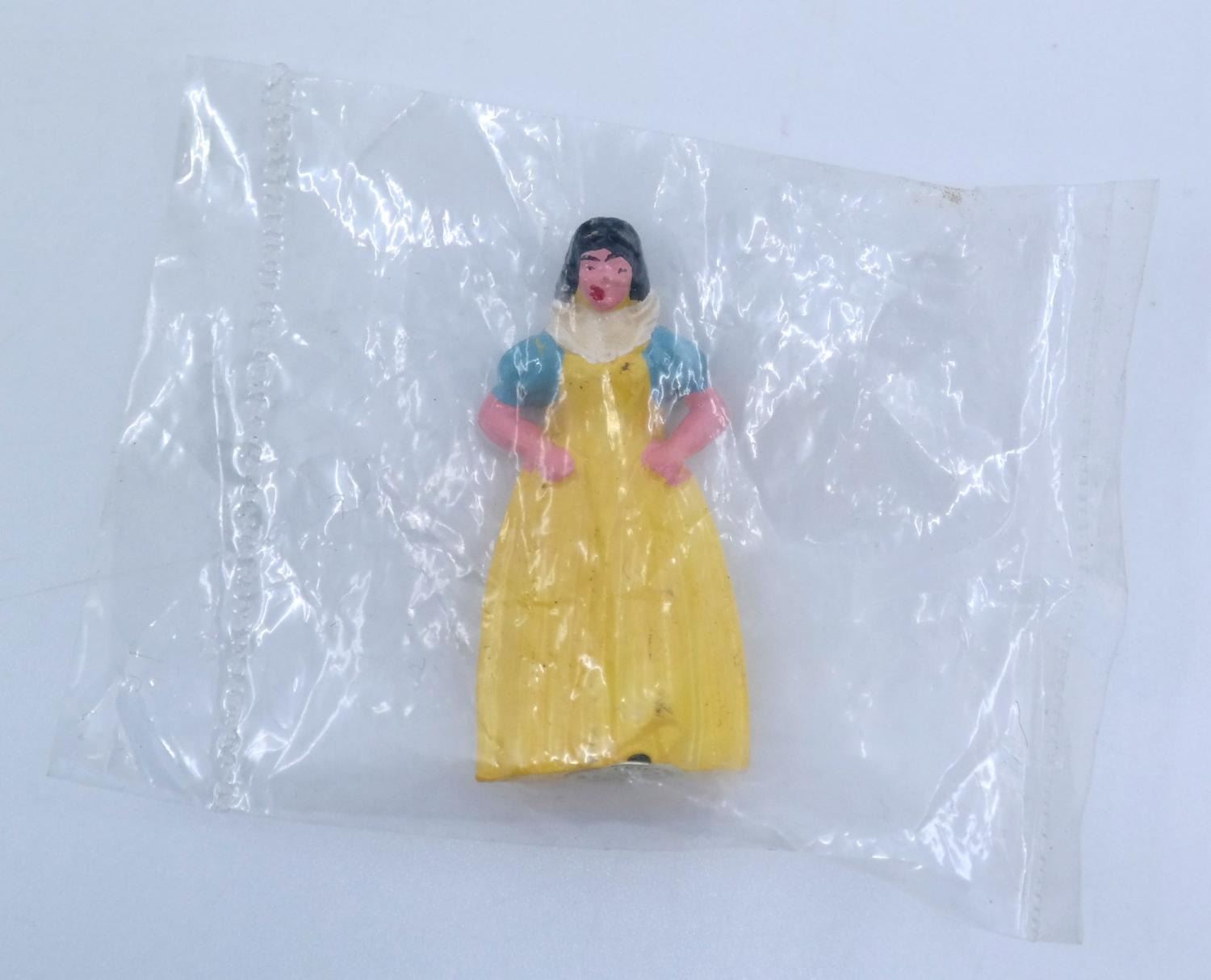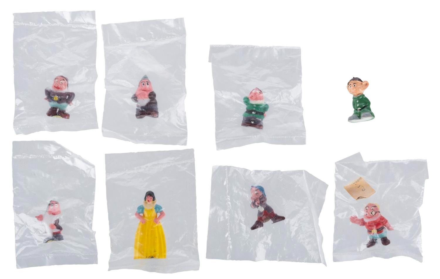 (Marx, 1960s) A set of eight miniature "Snow White and the Seven Dwarfs” Disneykins figures. Measuring approximately 0.5" to 1" tall, the hand-painted figurines are in fine condition, all in the original packaging except for Dopey.
