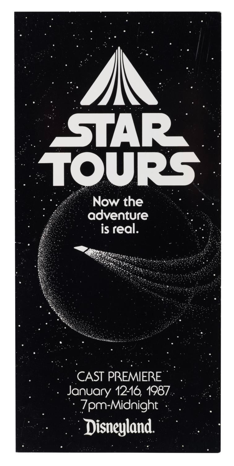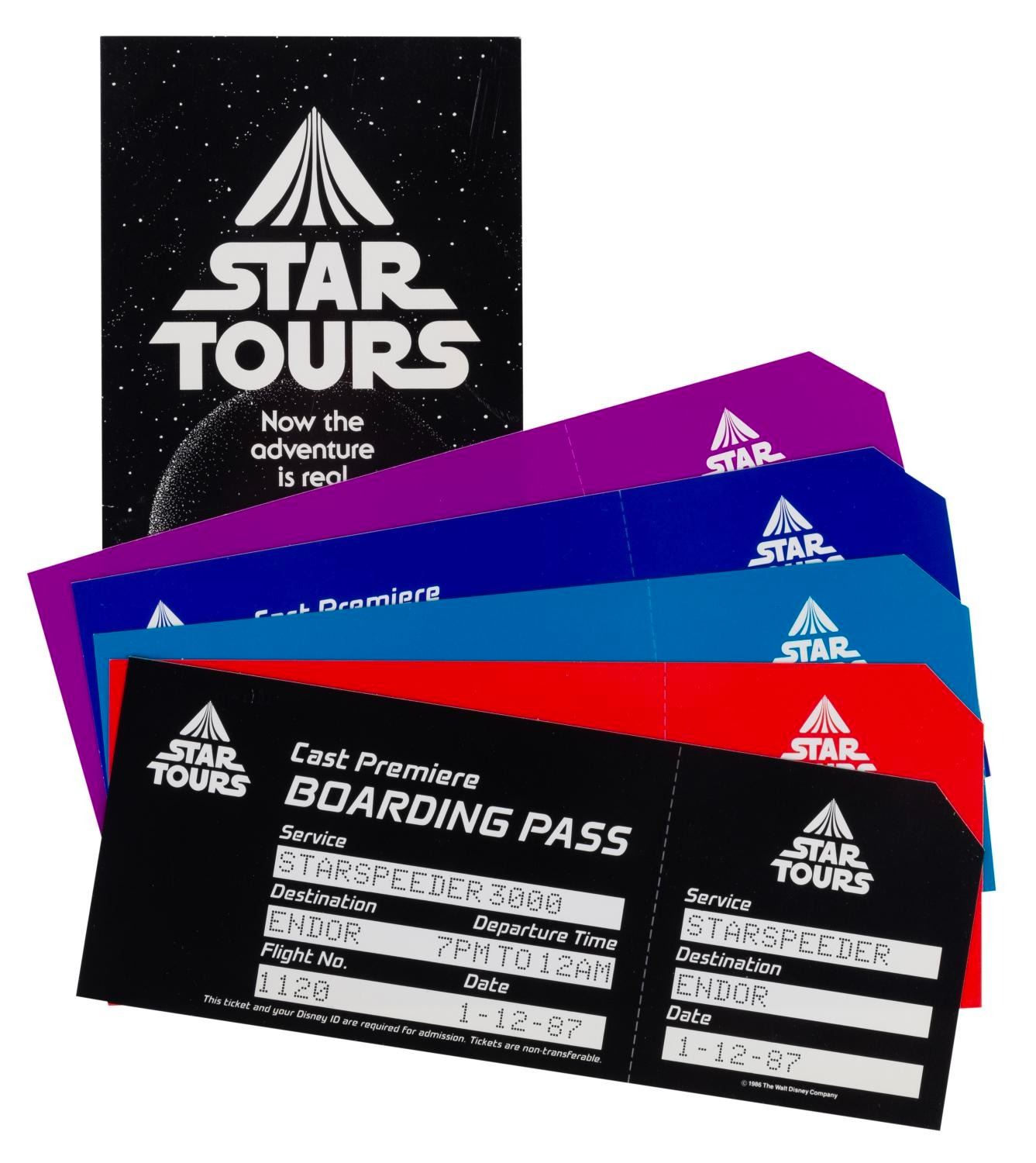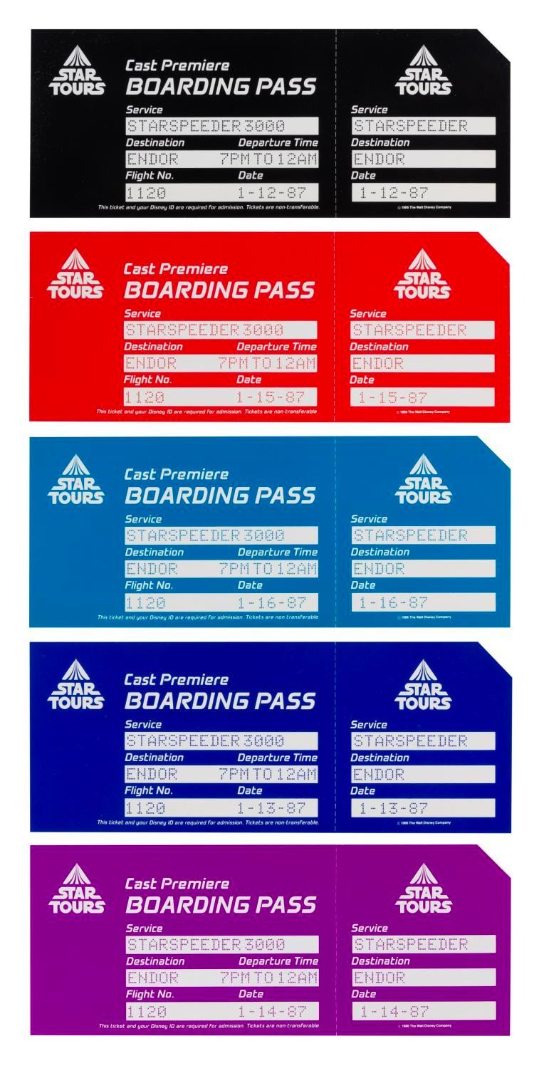(Disneyland, 1987) A set of five Star Tours Cast Member premiere boarding passes, one for each day of the January 12-16, 1987 premiere, and a ticket sleeve. Each 3.25” x 8.25” boarding pass is in very good condition with minor scratches, while the 4" x 8.5" ticket holder is in good condition with heavy scratches.