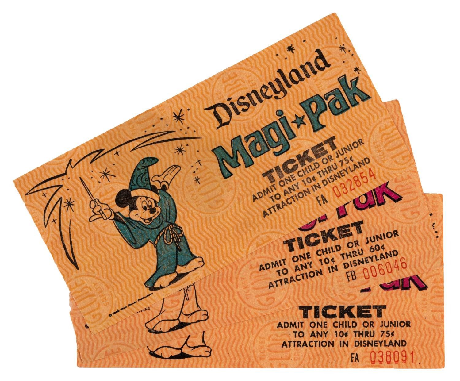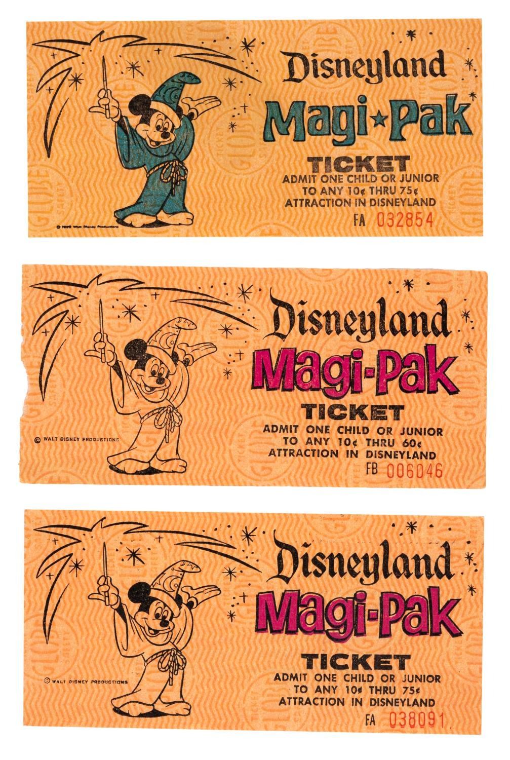 (Disneyland, 1960s) A collection of three Magi-Pak child or junior tickets, from booklets that were sold in the Park in the 1960s. Each measuring 2.5” x 5.5” the tickets are in very good condition with light handling wear.