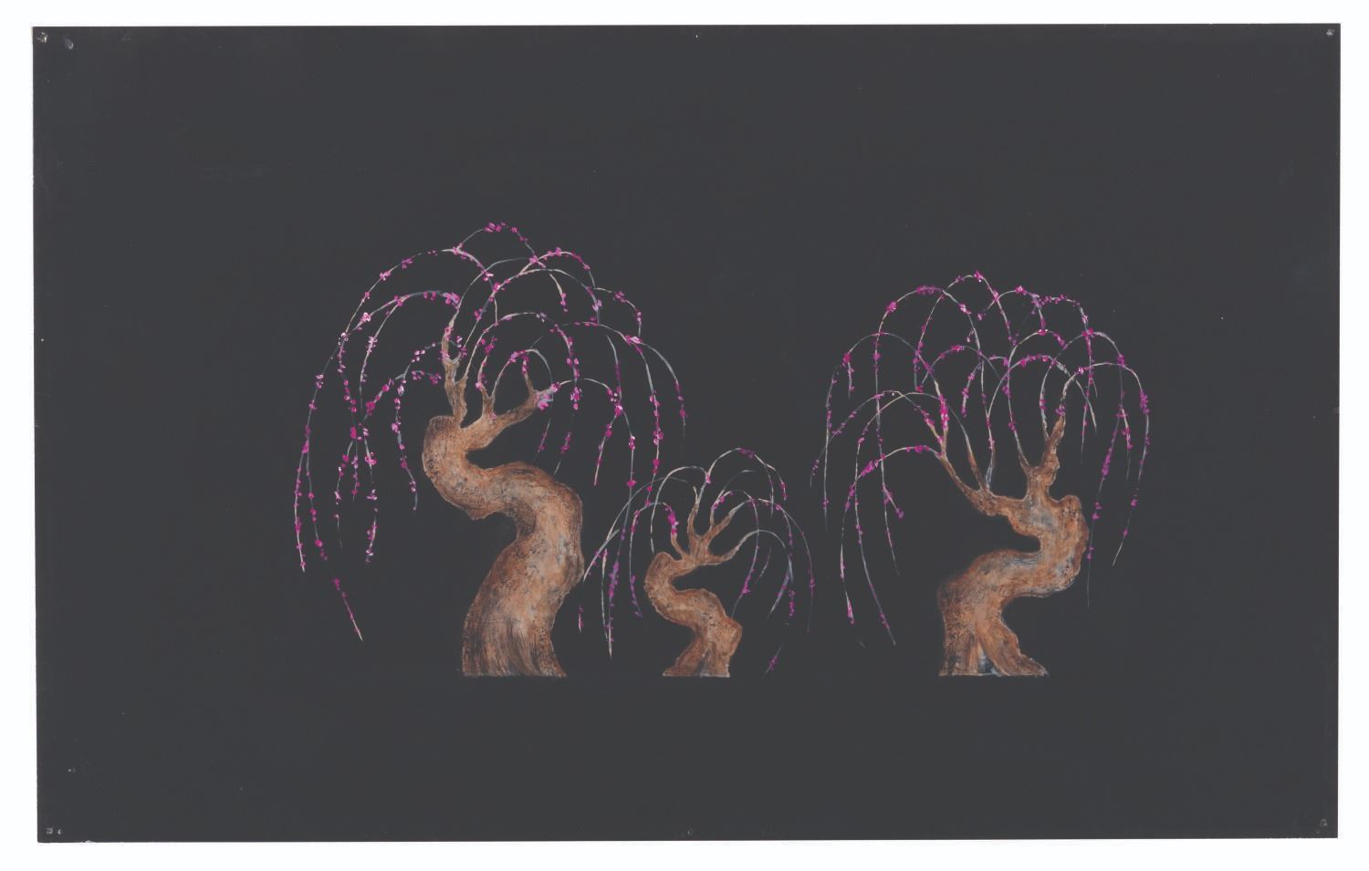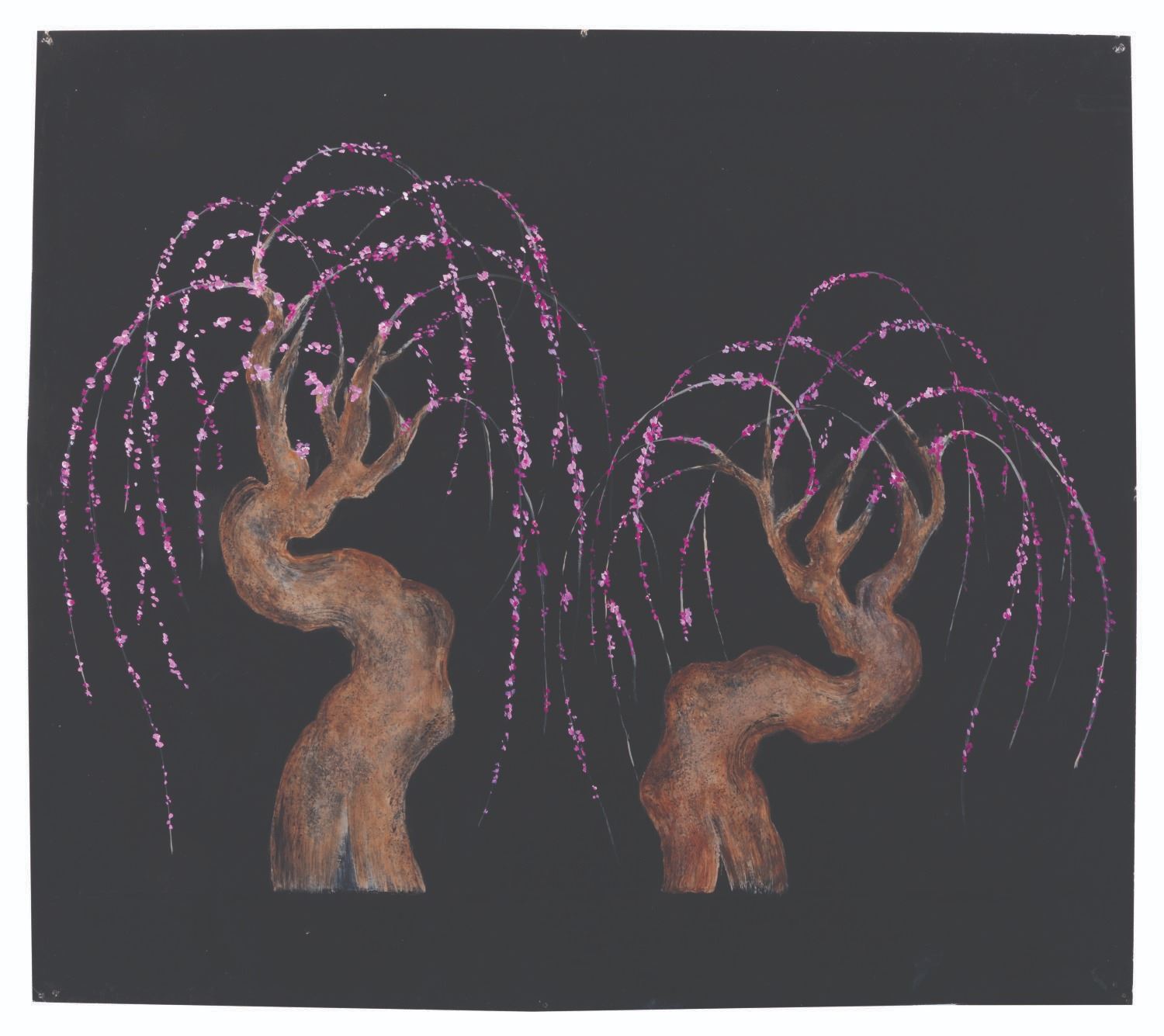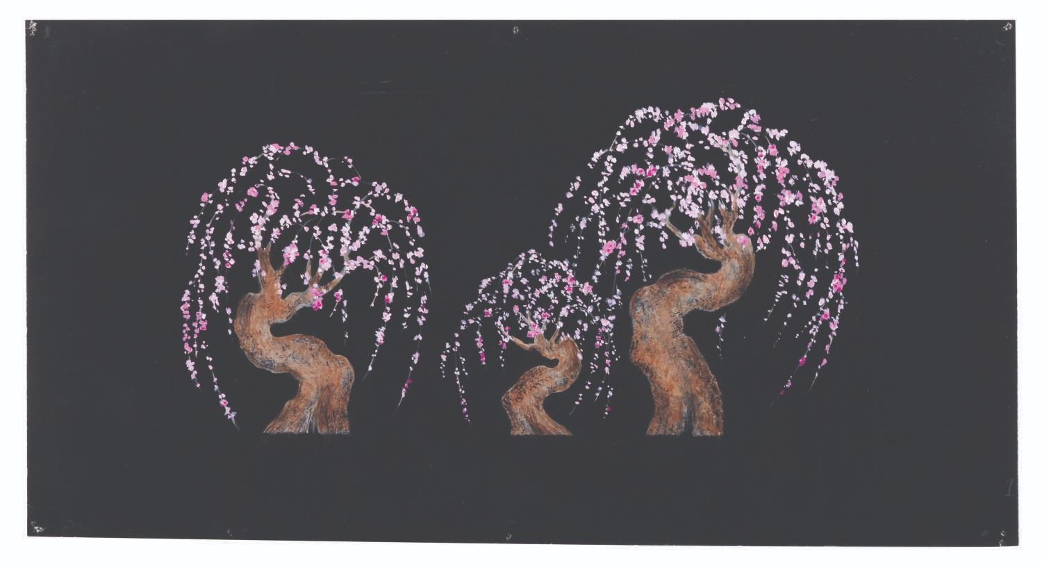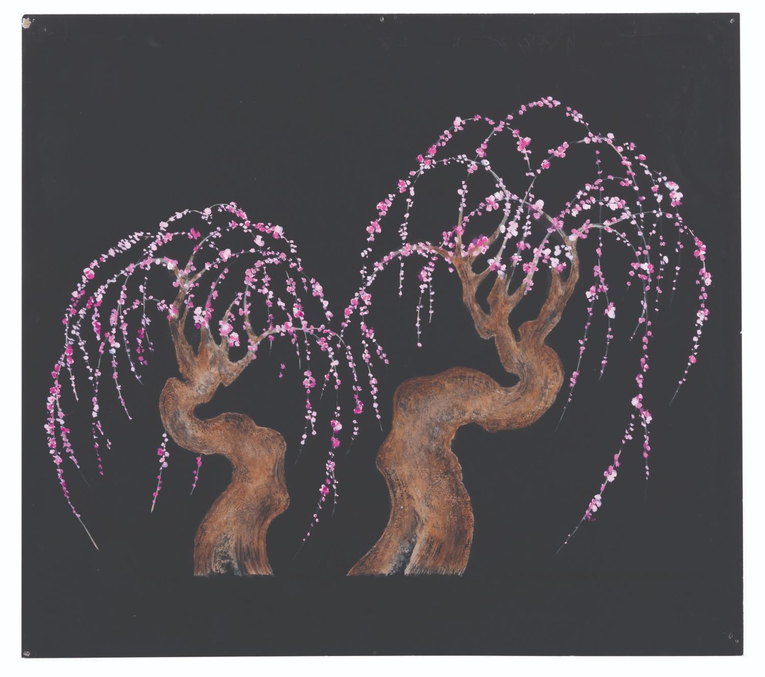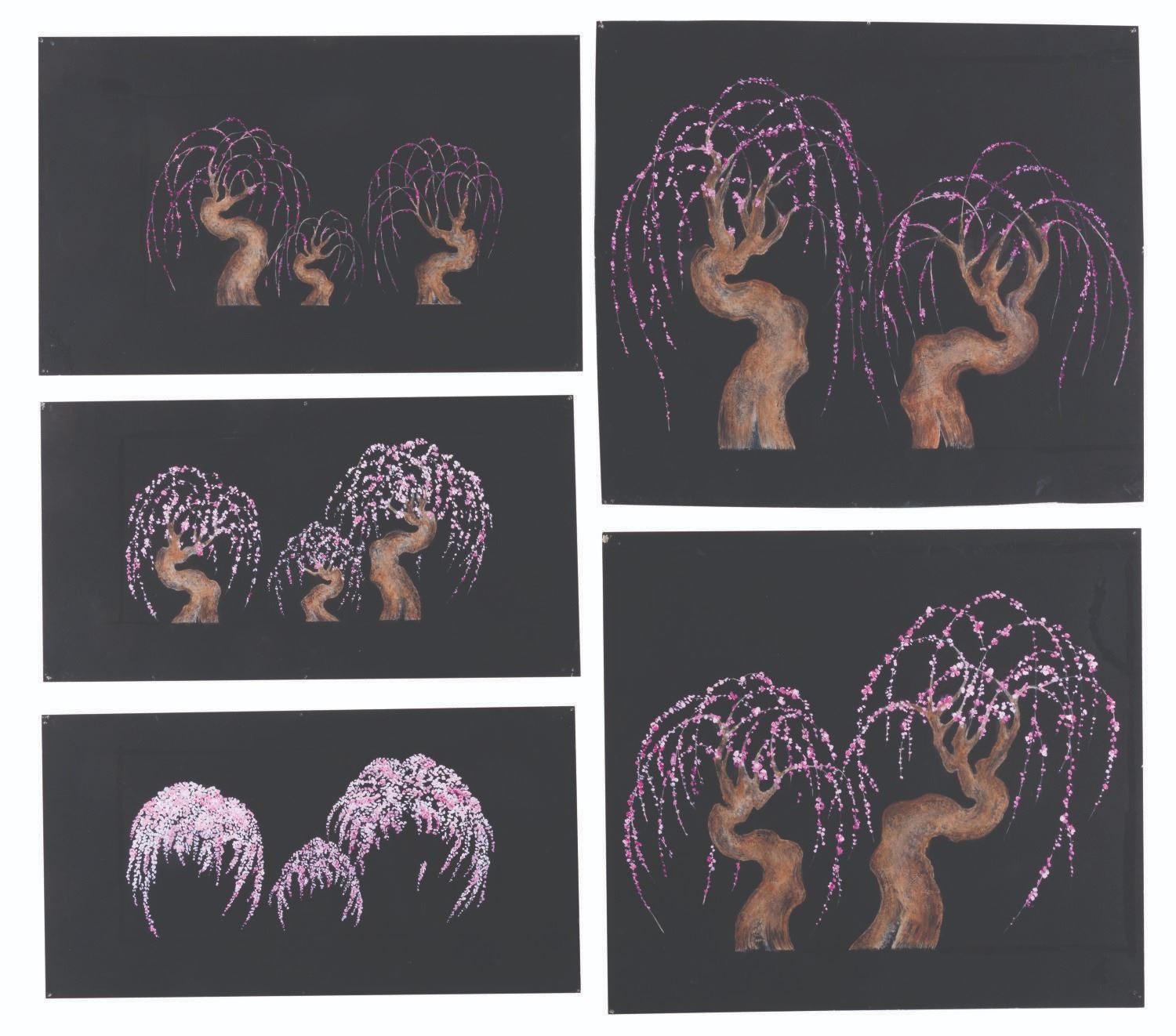 (Tokyo Disneyland, 1983) A set of five concept paintings by Animator and Imagineer Claude Coats for the Meet the World attraction at Tokyo Disneyland. Coats was the lead designer on the 19-minute attraction, which told the history of Japan through a rotating theater format. These five pieces depict sakura, also known as cherry blossom trees. Ranging in size from 7.25” x 13.7 to 12.75” x 14.25”, the concepts are in good condition with dark smudges, scratches, edge wear, and holes at the corners from production.