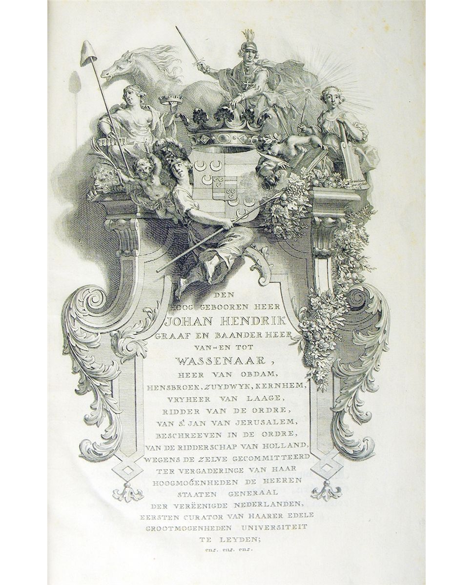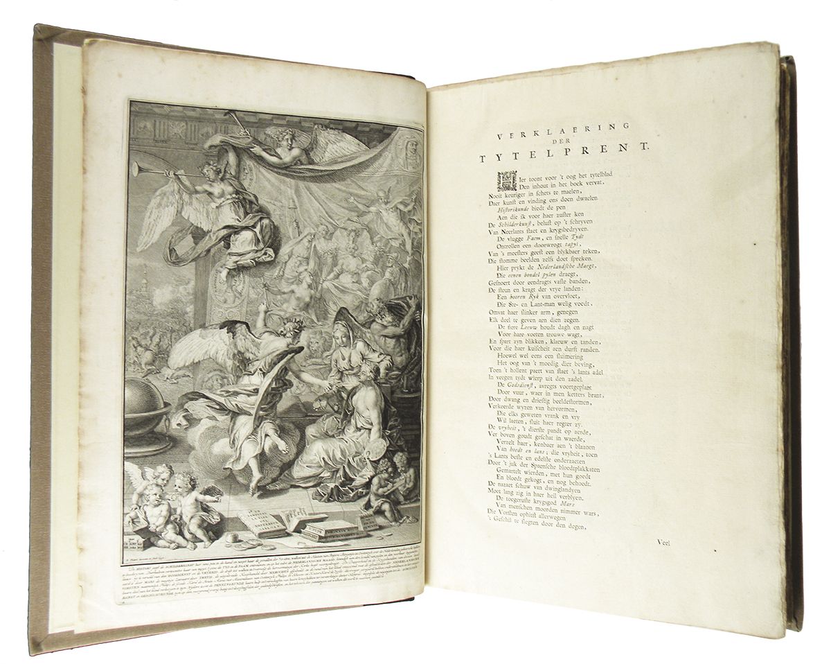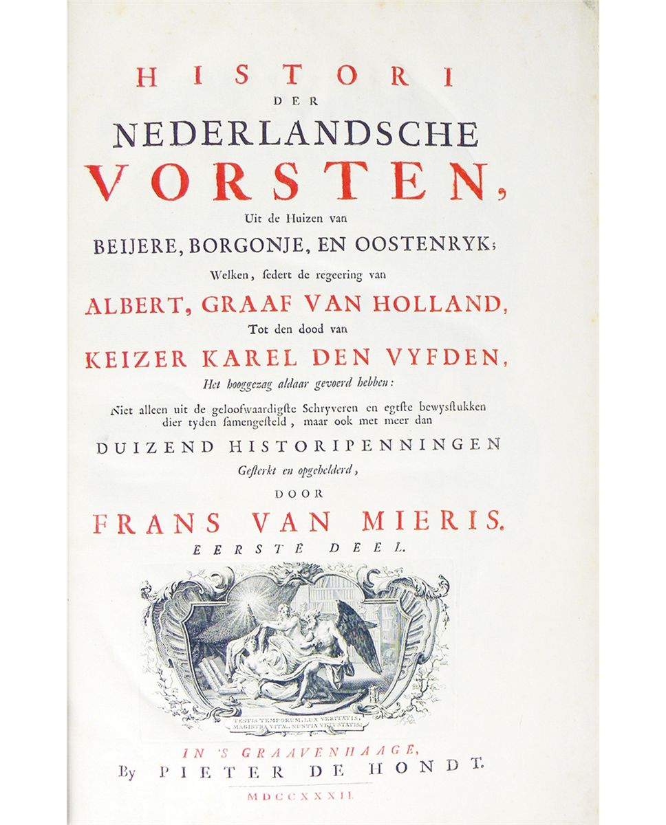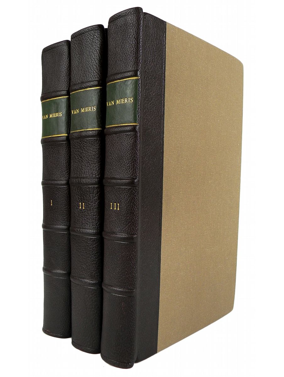 Mieris, Frans van. HISTORI DER NEDERLANDSCHE VORSTEN, UIT DE HUIZEN VAN BEIJERE, BORGONJE, EN OOSTENRYK; WELKEN, SEDERT DE REGEERING VAN ALBERT, GRAAF VAN HOLLAND, TOT DEN DOOD VAN KEIZER KAREL DEN VYFDEN, HET BOOGGEZAG ALDAAR GEVOERD HEBBEN: NIET ALLEEN UIT DE GELOOFWAARDIGSTE SCHRYVEREN EN EGTSTE BEWYSSTUKKEN DIER TYDEN SAMENGESTELD, MAAR OOK MET MEER DAN DUIZEND HISTORIPENNINGEN. In 's Graavenhaage: By Pieter de Hondt, 1732, 1733 & 1735. First edition. Three volumes, complete. Folio, modern matching brown quarter morocco; spines with five raised bands; green morocco spine labels, gilt. (32), 466, (108); (8), 484, (56); (4), 446, (58) pages; finely engraved allegorical frontispiece by Bernard Picart; superbly engraved portrait of the author by Jacob Houbraken; titles printed in red and black with engraved vignettes by Picart; finely engraved unsigned dedication; genealogical table; finely engraved headpieces by Picart and Jan Wandelaar; woodcut initials; engraved tailpiece by Picart; fine engravings of medals throughout the text. A fine, untrimmed set. A handsome set of this magnificent classic, and still standard, reference work, covering Dutch medals up to 1555. Rare. Clain-Stefanelli 14862*. Cumont 2089. Engel & Serrure 4589. Grierson 265.