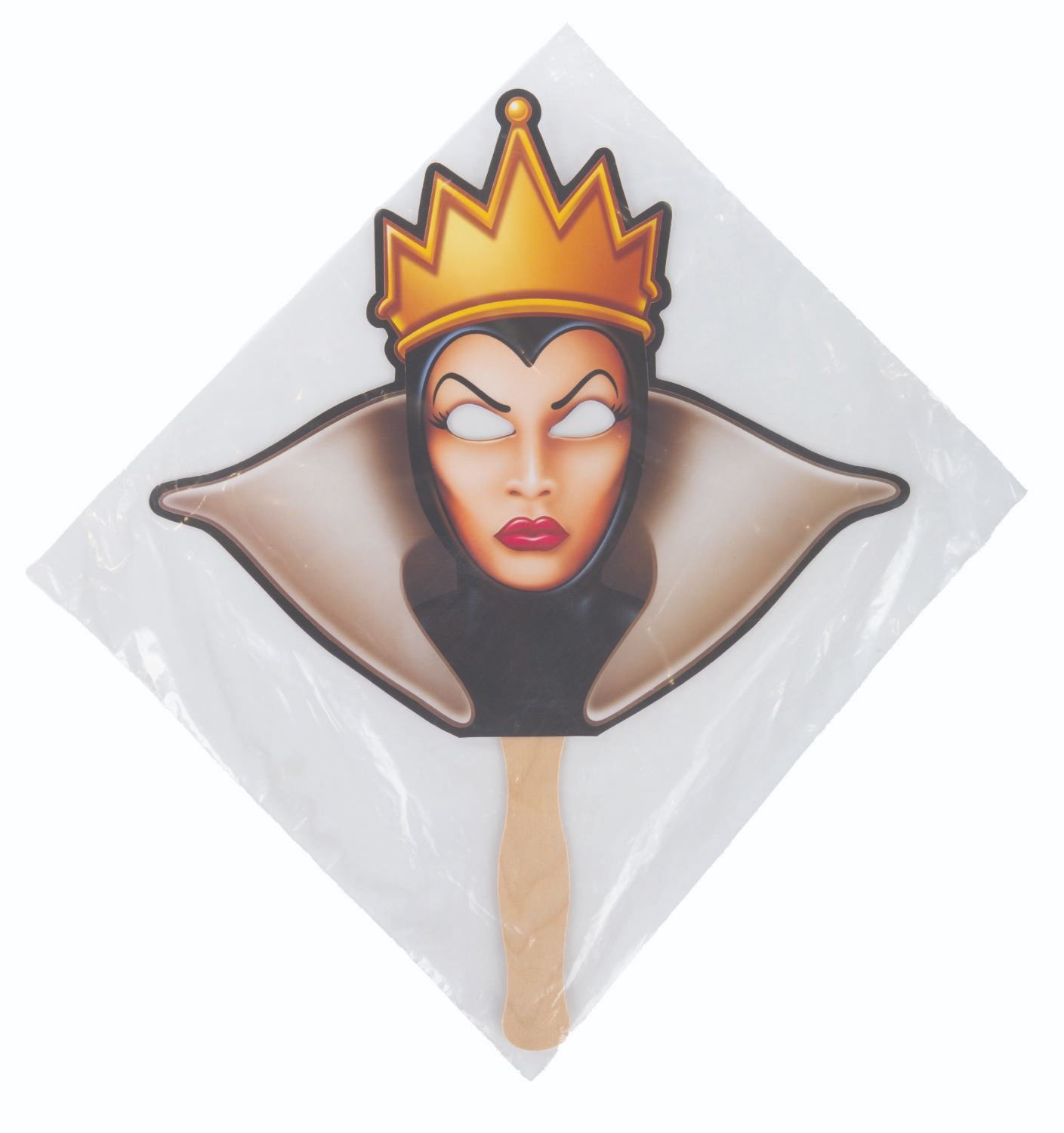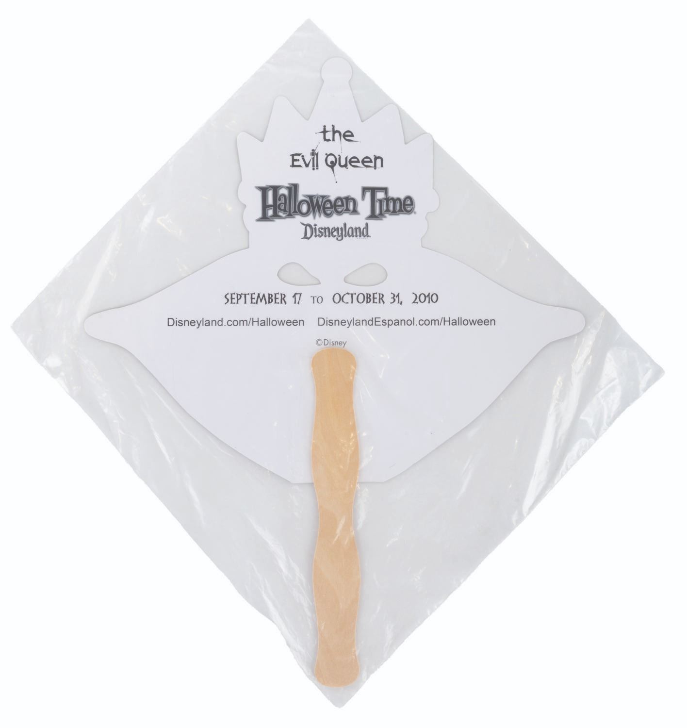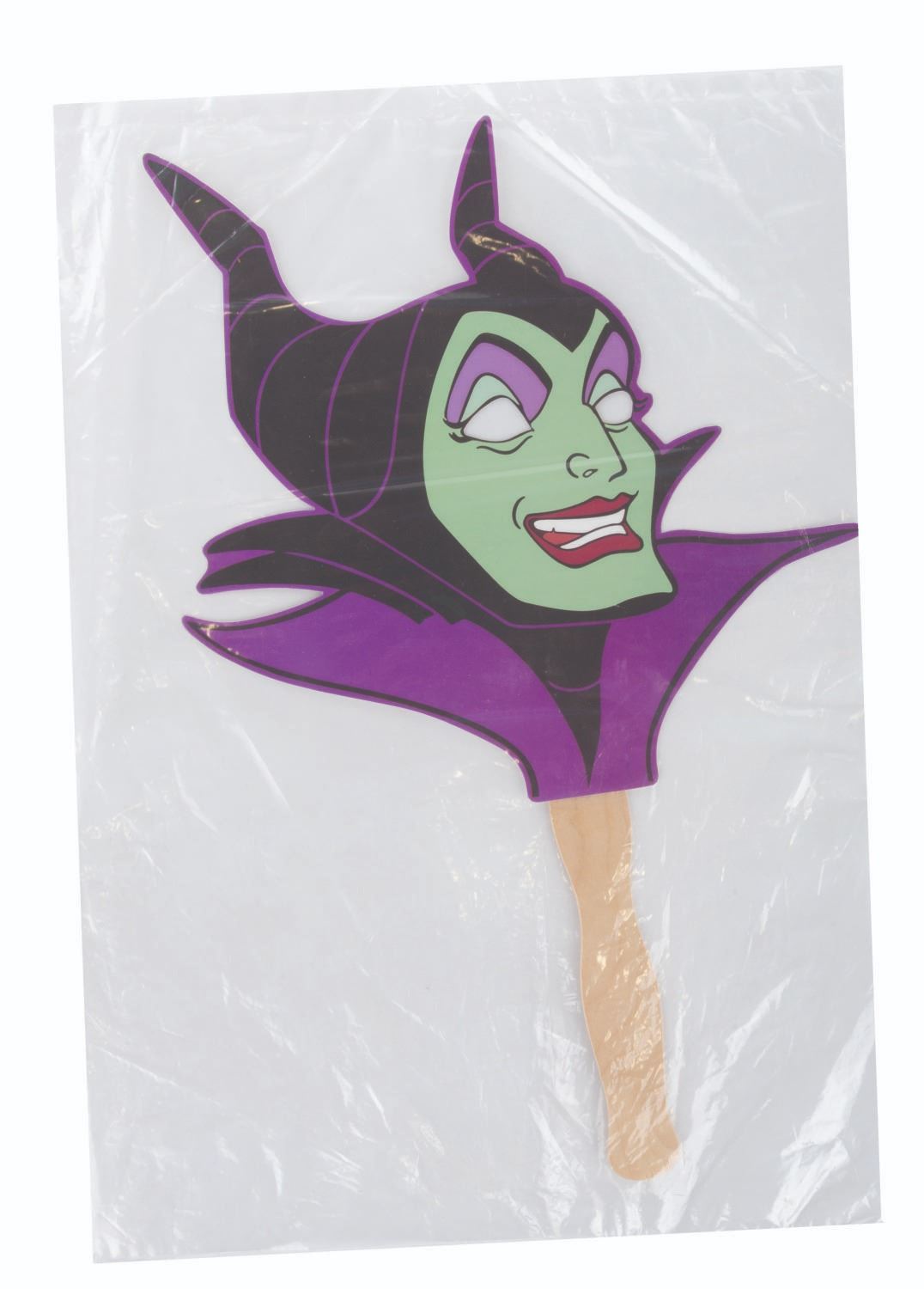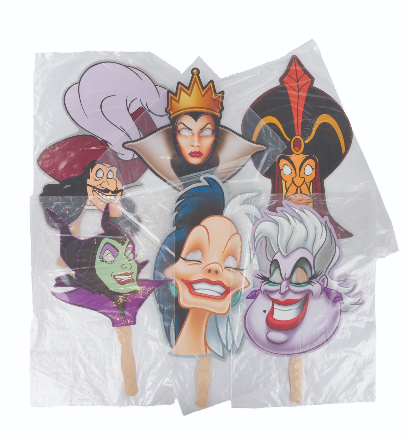 (Disneyland, 2010) A collection of six handheld masks from the Halloween Time at Disneyland events in 2010. Included are The Wicked Queen, Maleficent, Cruella De Vil, Jafar, Ursula, and Captain Hook. The masks are in fine condition, sealed in original bags, with some very light handling wear.