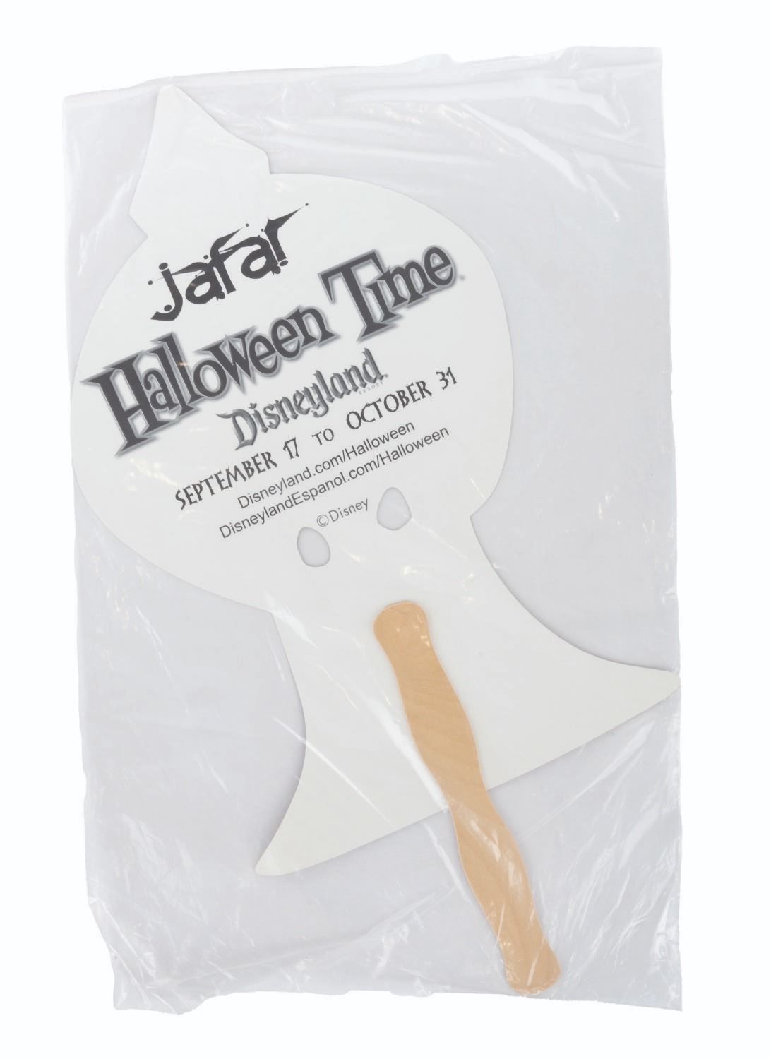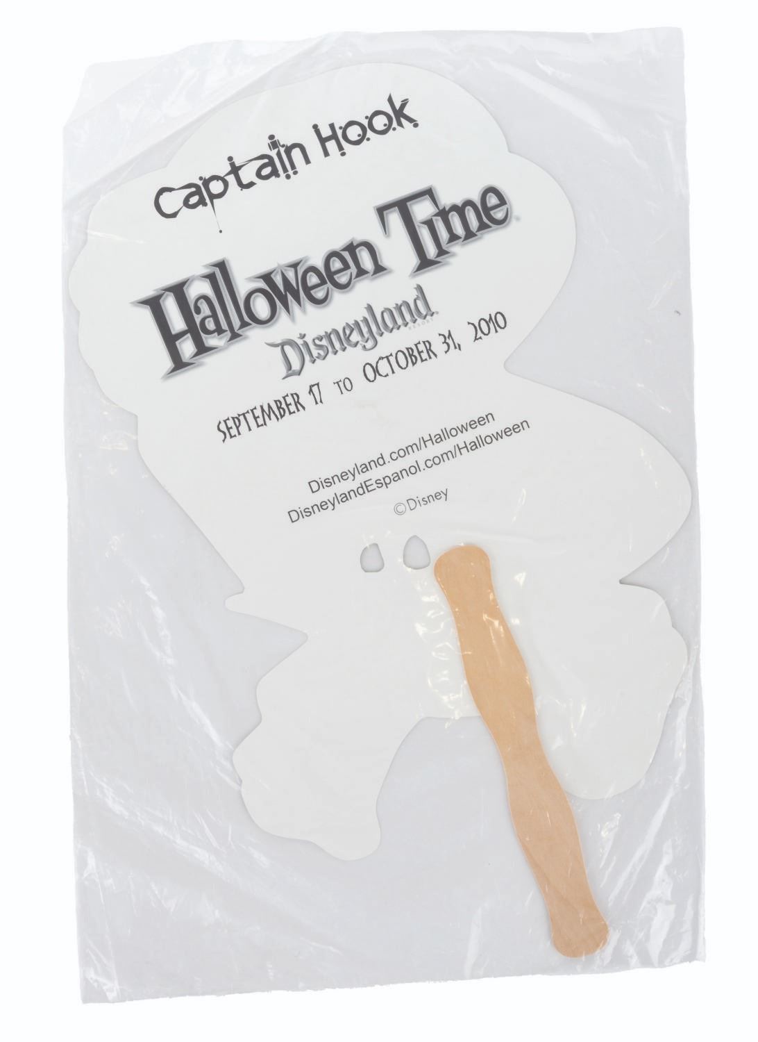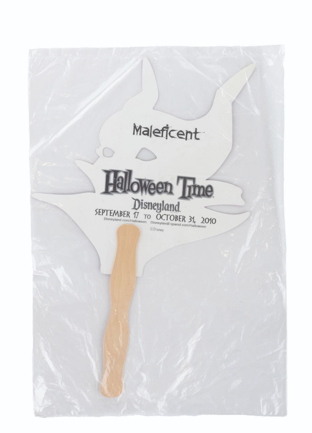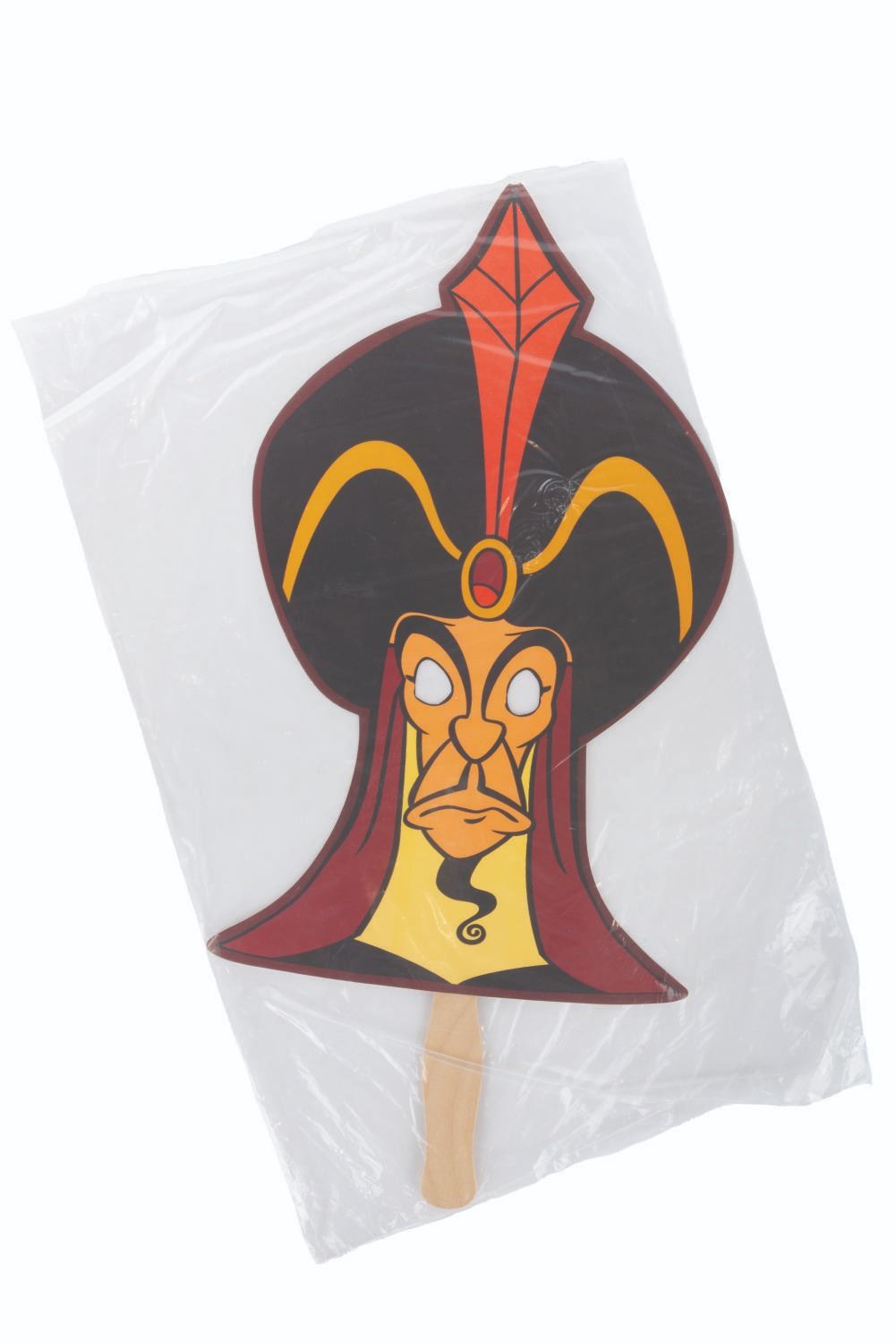 (Disneyland, 2010) A collection of six handheld masks from the Halloween Time at Disneyland events in 2010. Included are The Wicked Queen, Maleficent, Cruella De Vil, Jafar, Ursula, and Captain Hook. The masks are in fine condition, sealed in original bags, with some very light handling wear.