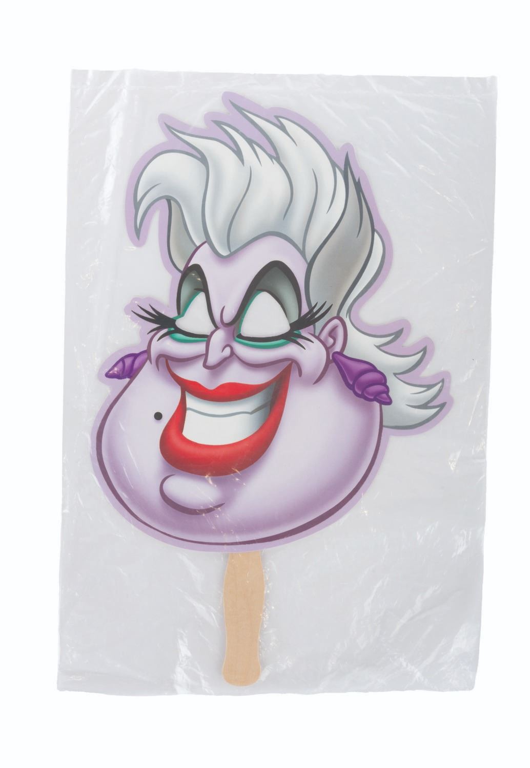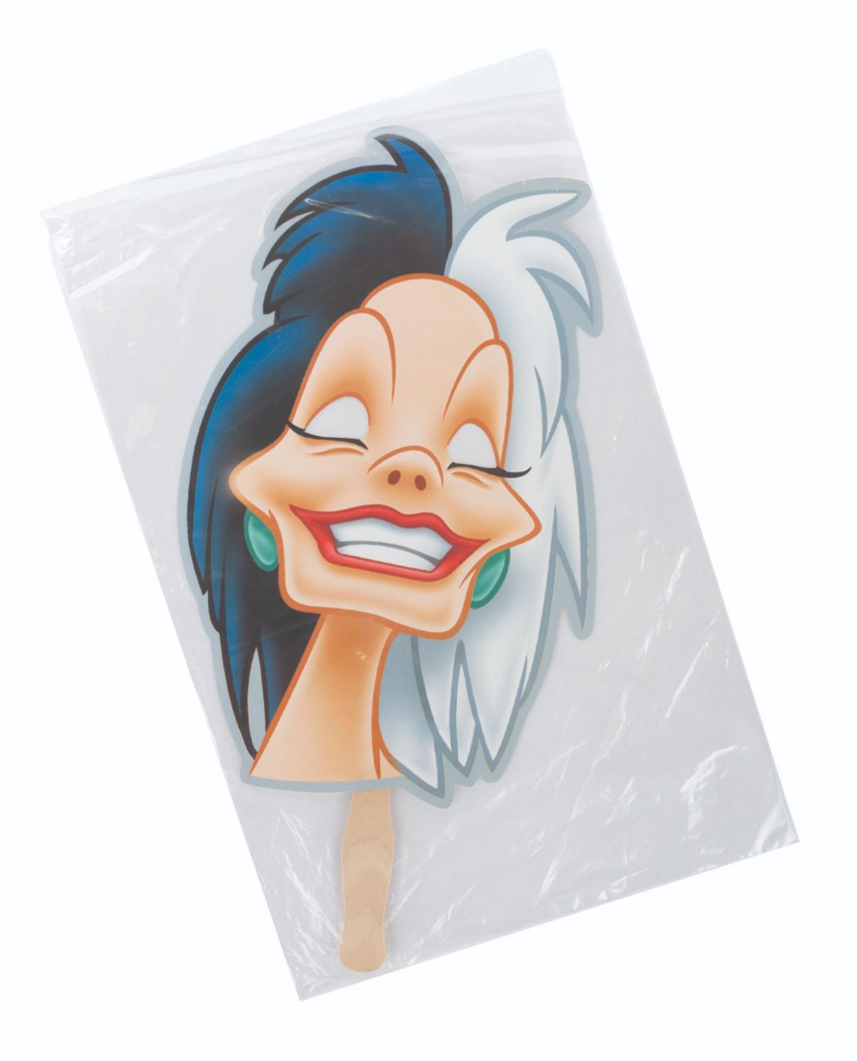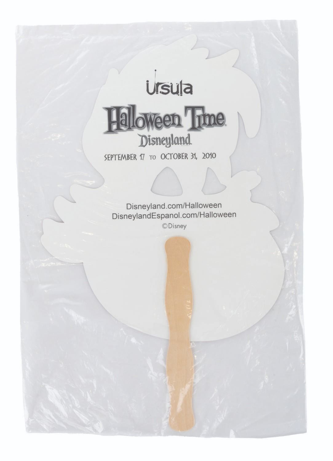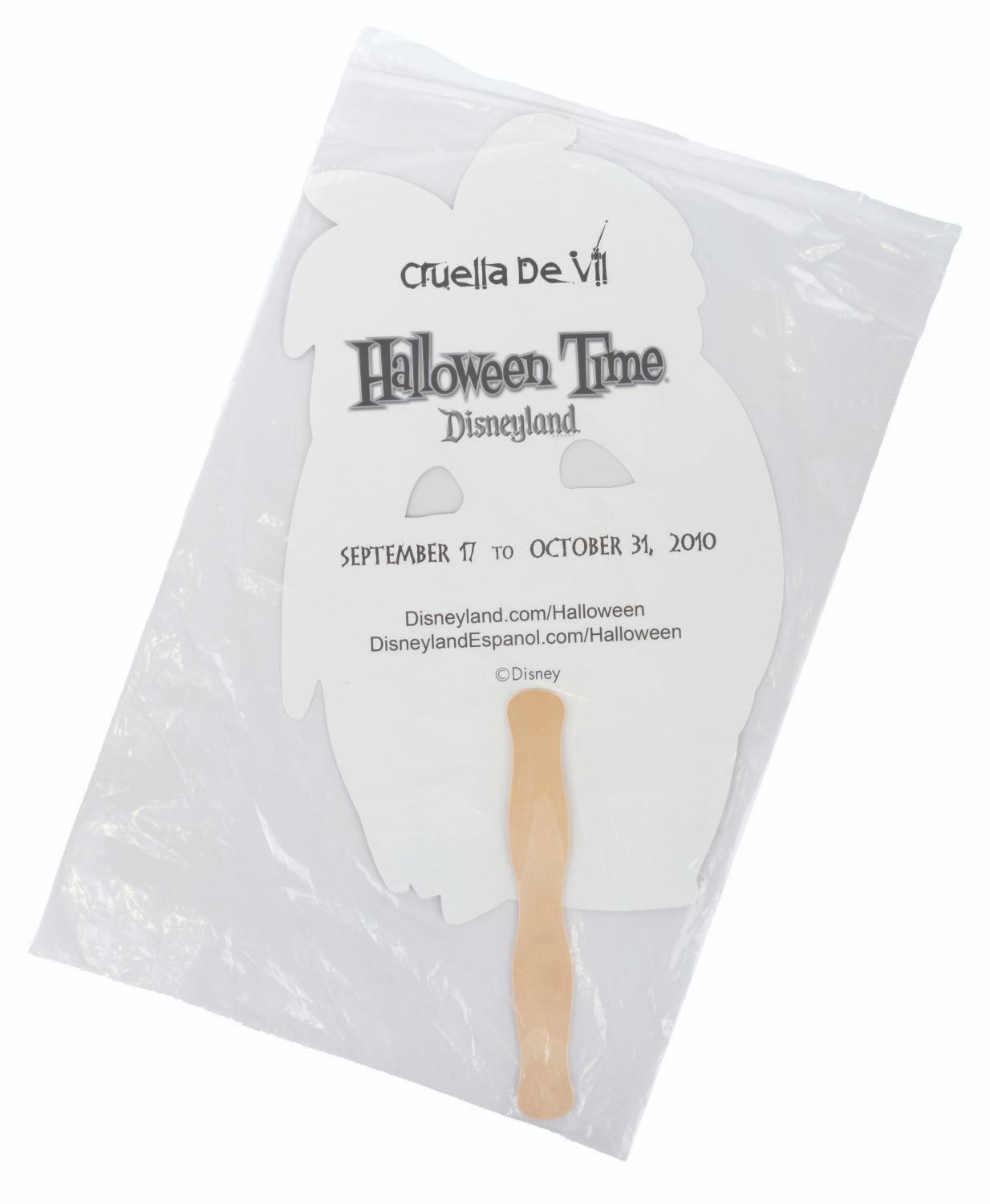 (Disneyland, 2010) A collection of six handheld masks from the Halloween Time at Disneyland events in 2010. Included are The Wicked Queen, Maleficent, Cruella De Vil, Jafar, Ursula, and Captain Hook. The masks are in fine condition, sealed in original bags, with some very light handling wear.
