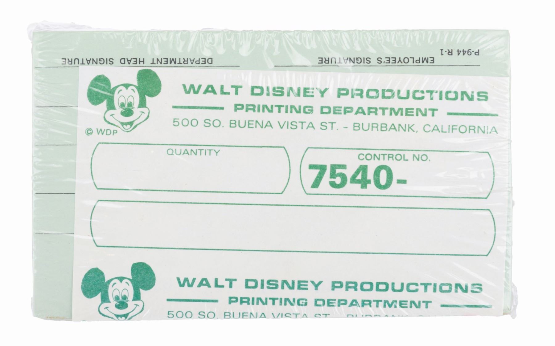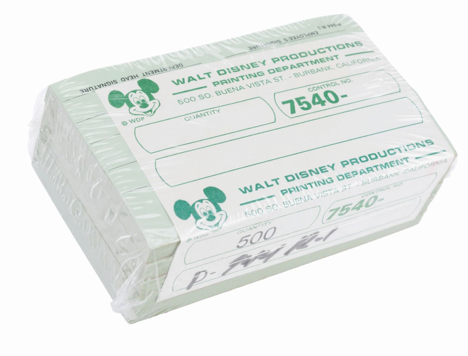 (Disney, 1970s-80s) A set of five Walt Disney Productions Printing Department Cast Member pass books. Measuring 3.25” x 5.5” x 2” tall, the unopened books are in fine condition.
