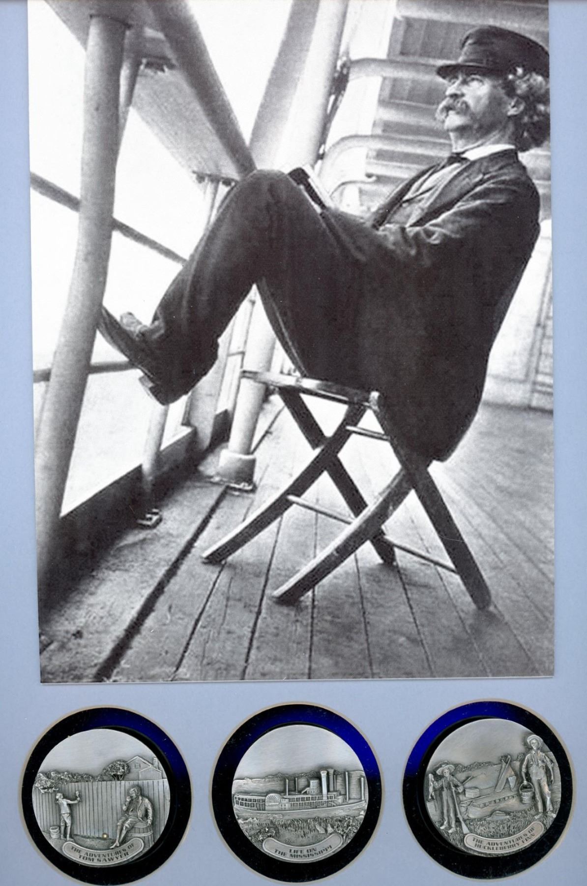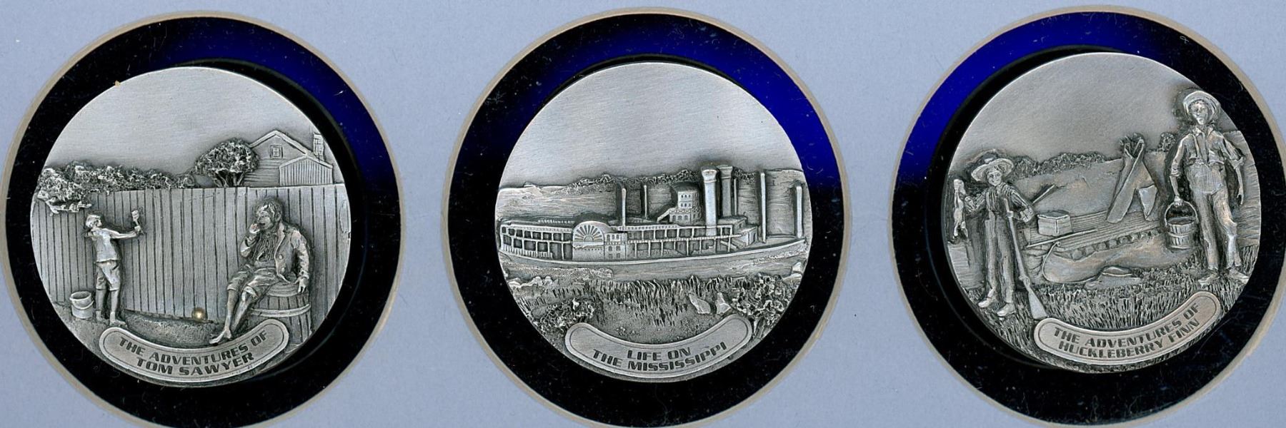3 Large 21st century buttons by Battersea Pewter company. Here we have a limited edition set of buttons from the Connie Robinson collection who purchased them directly from Kathy Baughman of Battersea Pewter company of Wisconsin. This set on its original card includes a button commemorating Tom Sawyer, one commemorating Huckleberry Finn, and one of Life on the Mississippi. A great set to add to any collection.