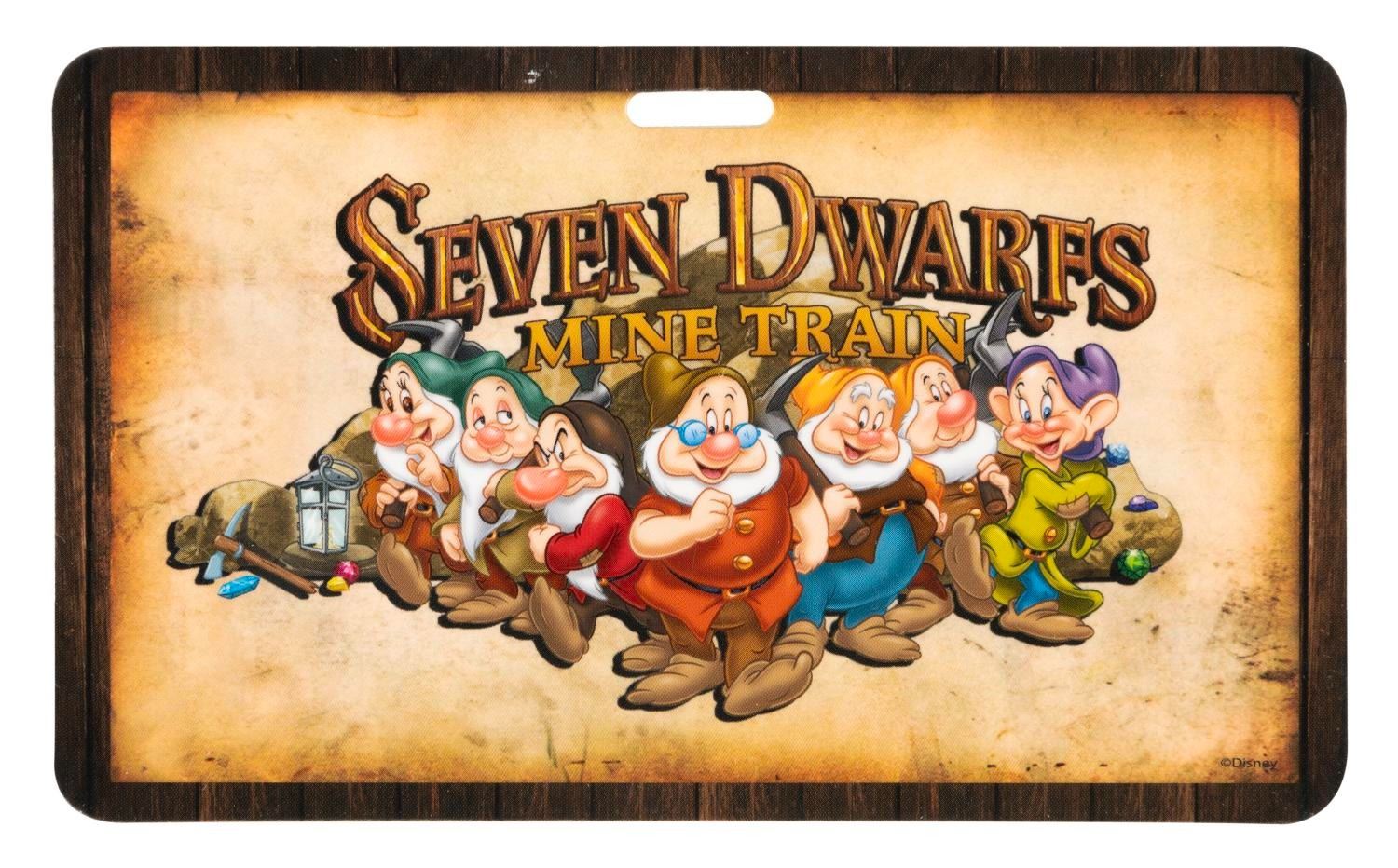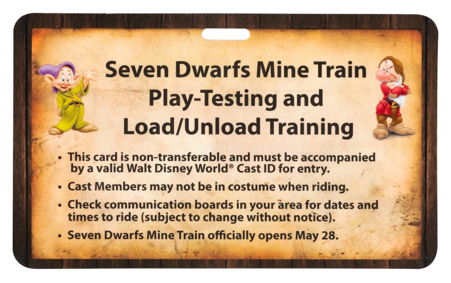 (Walt Disney World, 2014) A Cast Member-exclusive badge used during testing the Seven Dwarfs Mine Train attraction. Measuring 3" x 5" overall, the badge displays in good condition with creases, scratches, and wear from Cast Member use.