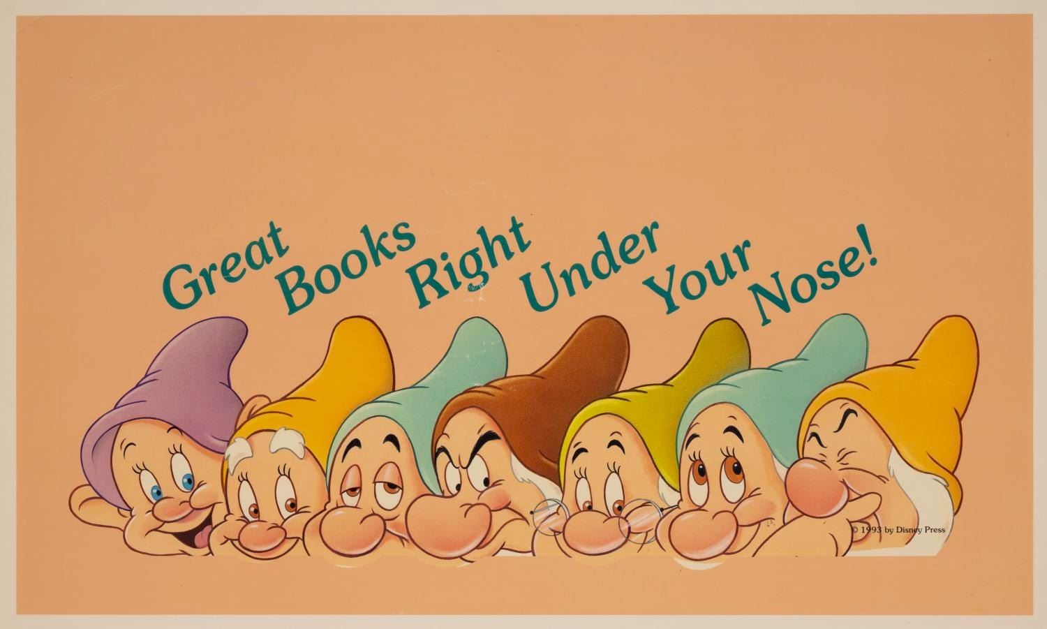 (Disney, 1993) A Seven Dwarfs store display poster with text that reads, "Great Books Are Right Under Your Nose!" Measuring 23" x 31.5", the poster is in fair condition with creases in the middle and tears and yellowing outside of the intended display area.