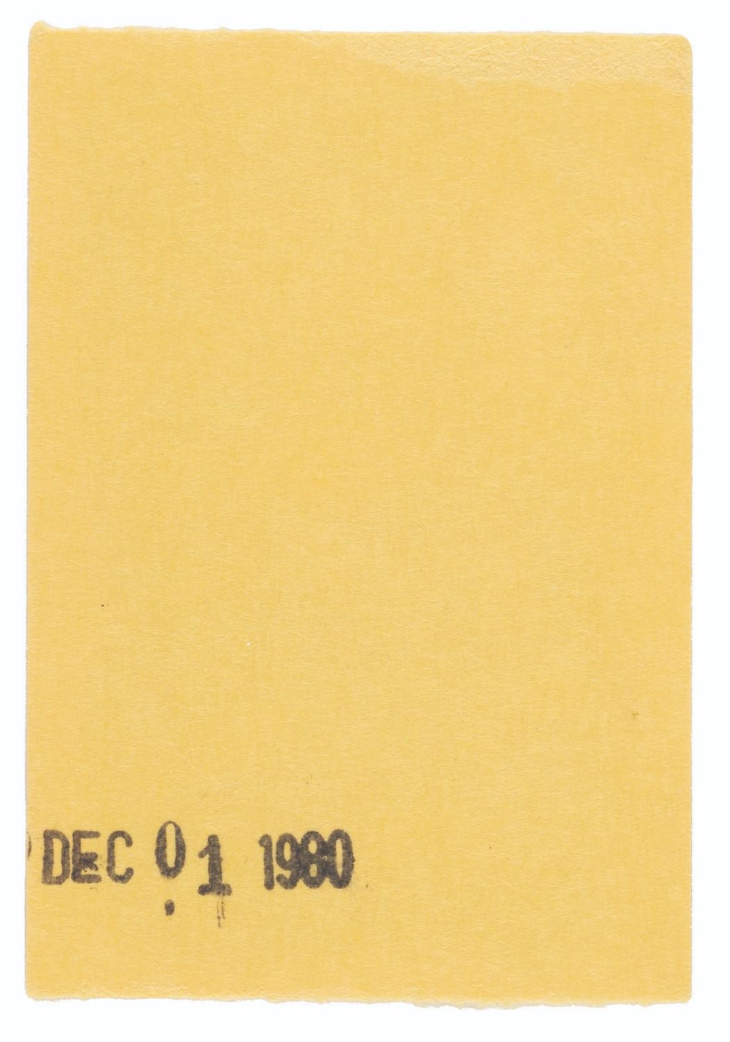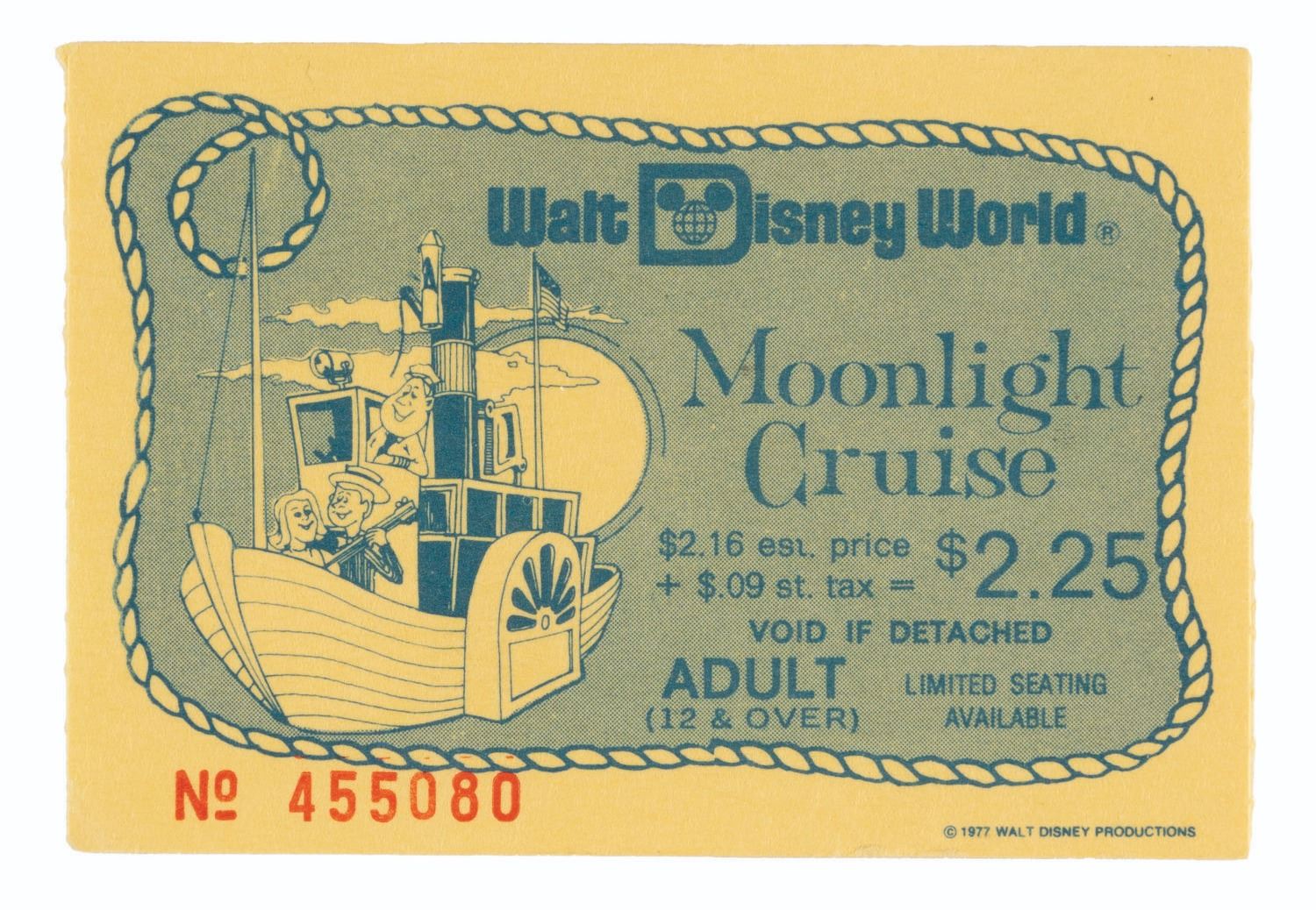 (Walt Disney World, 1980) An adult ticket for the Moonlight Cruise in the Seven Seas Lagoon. Guests on this cruise were taken on a ferryboat trip around the Resort, with drinks and entertainment on board. Measuring 2" x 3", the ticket is in very good condition with edge wear, light paper loss on the reverse, and the date stamped on the reverse.