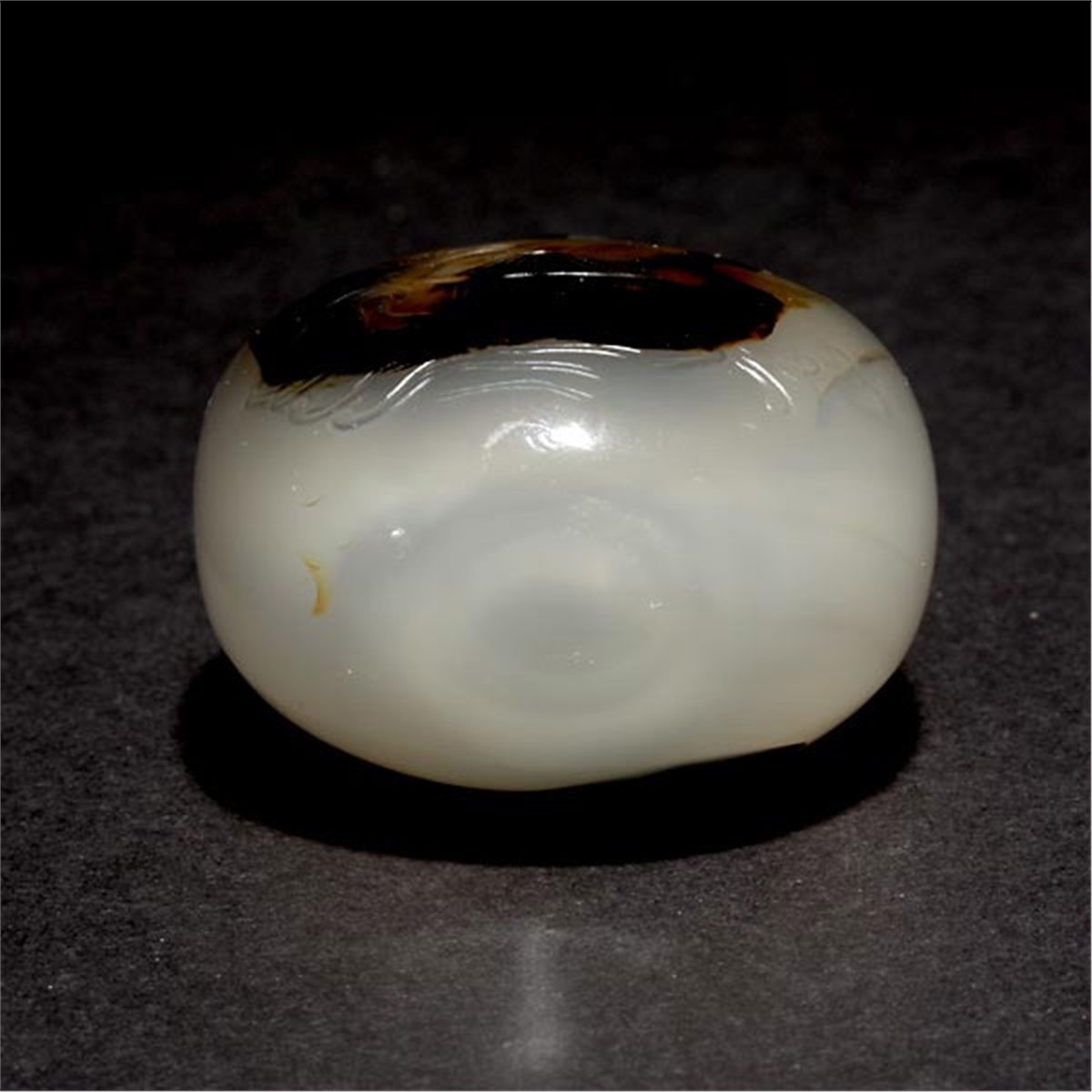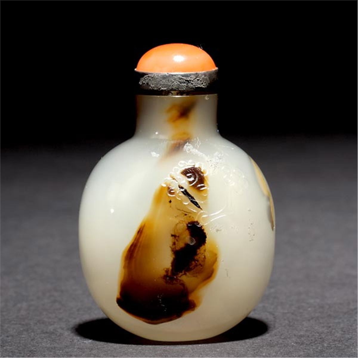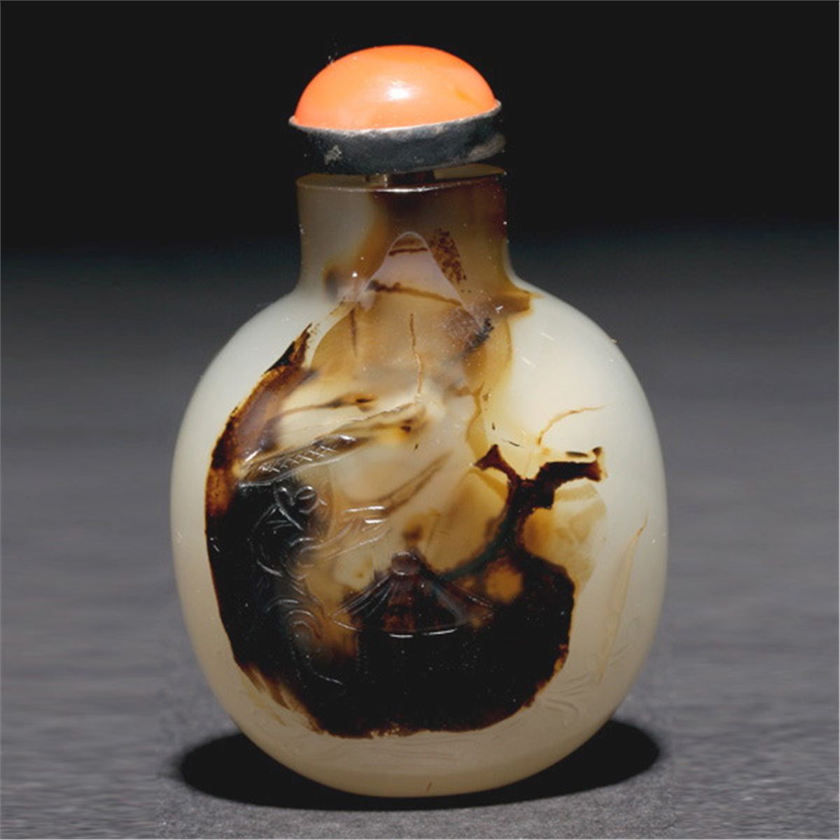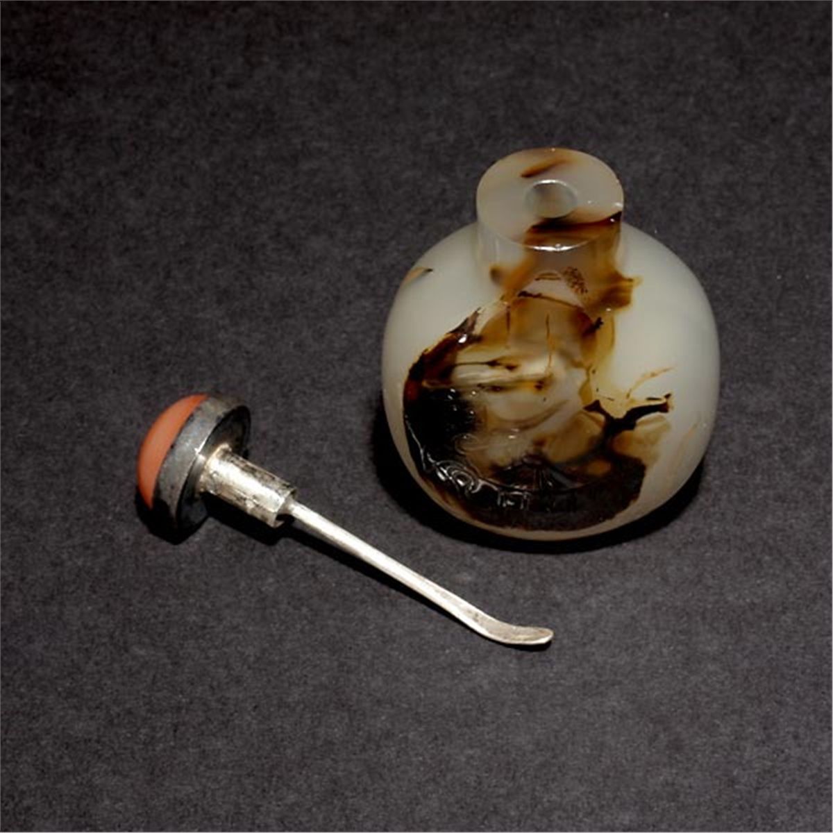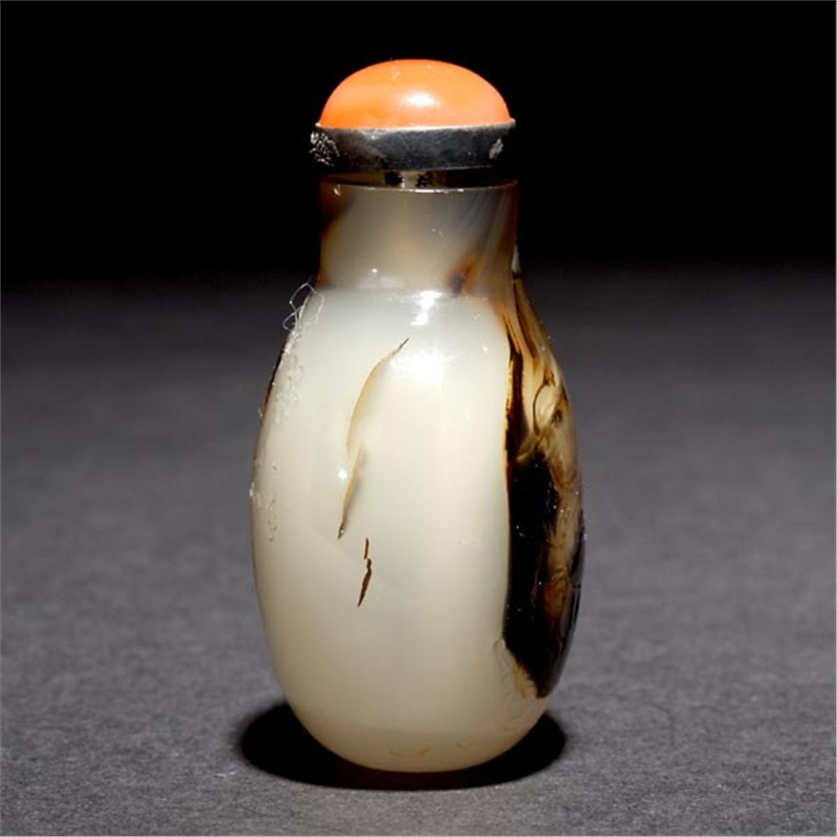 A Shadow Agate Snuff Bottle, Of globular shape, carved with two male figures, with a carnelian stopper. Height: 2 1/4 inches (5.7 cm) [Chips. This condition report states major condition issues only.]