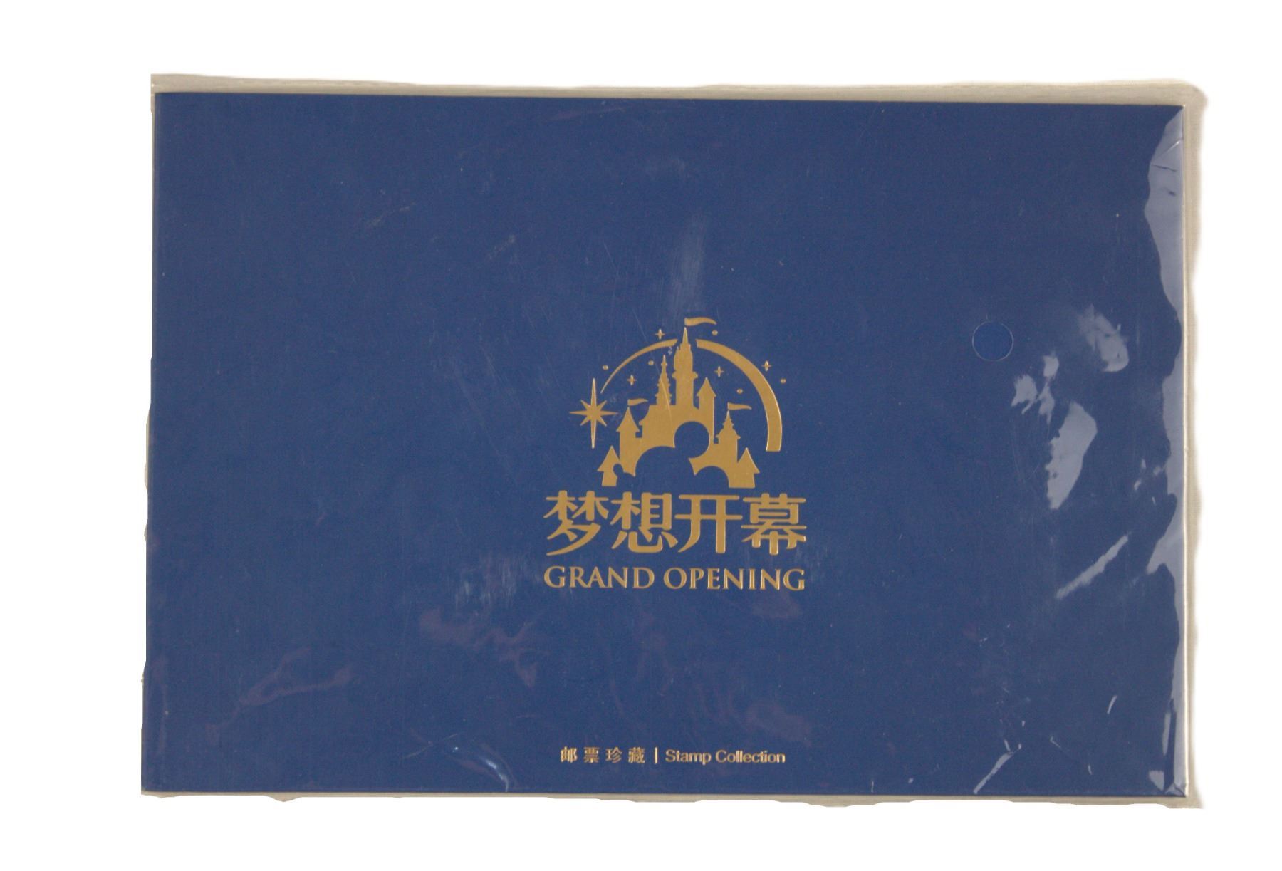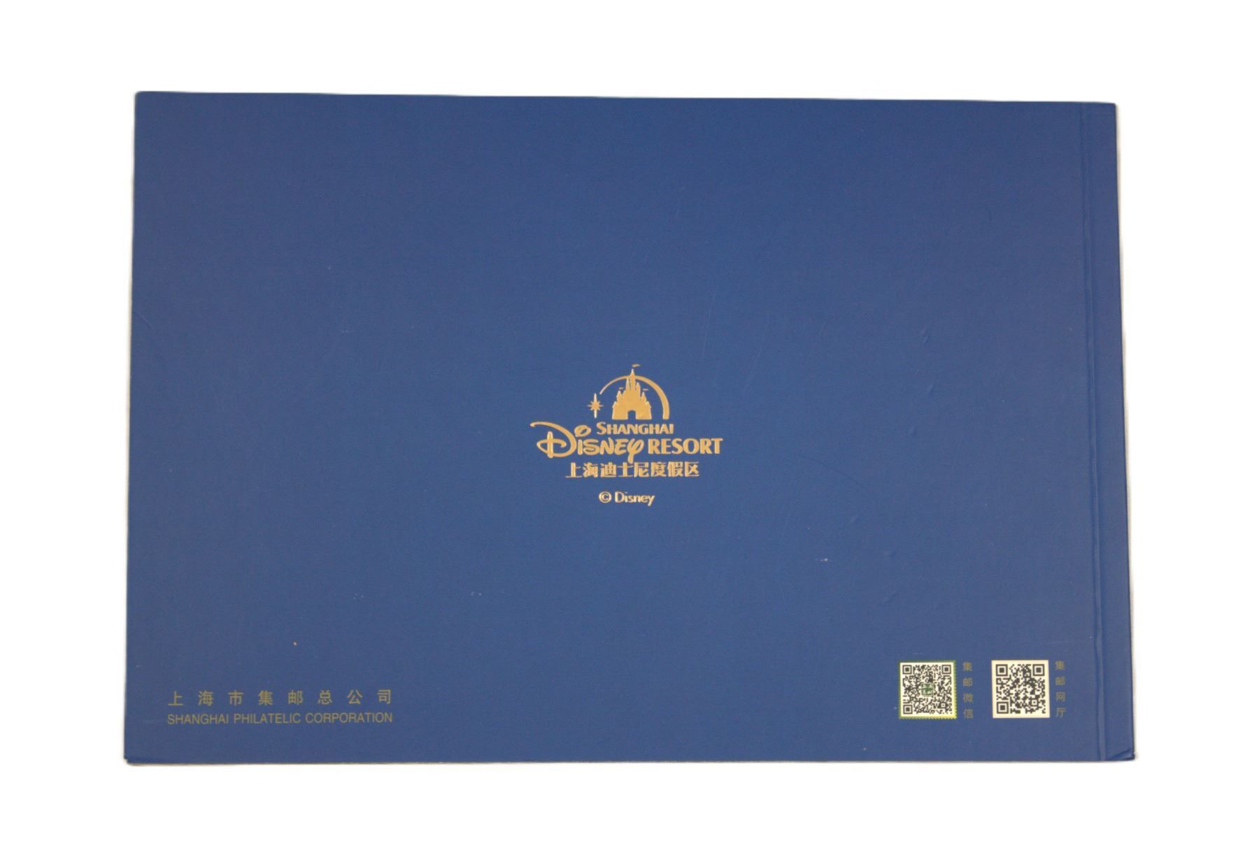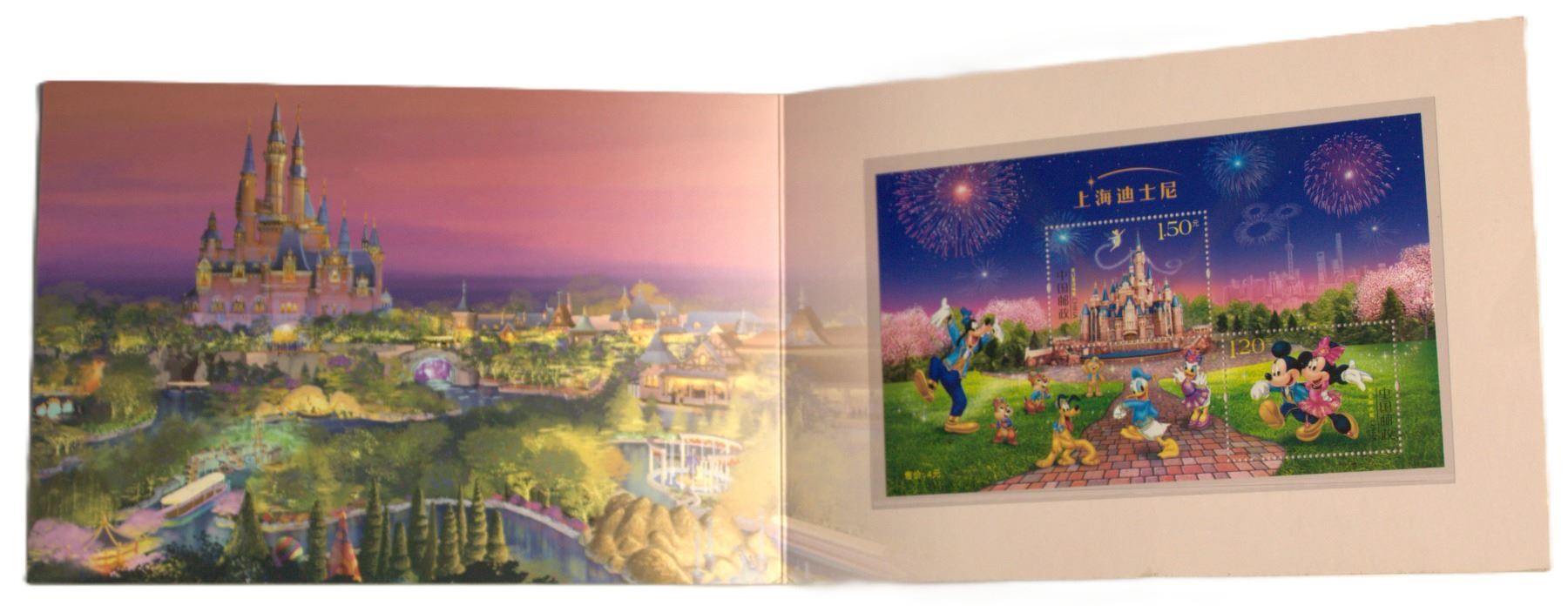 (Shanghai Disney Resort, 2016)This is a stamp collection book commemorating the grand opening of the Shanghai Disney Resort. It includes two stamps that are separate and then those same two stamps on the full uncut sheet. It features beautiful imagery of the park on both pages. One stamp features Mickey and Minnie strolling through the park and the other features the Enchanted Storybook Castle with Tinker Bell flying overhead. It is in like new condition.