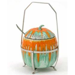 A Shelley earthenware pickle jar and cover, in the form of an apple with streaked orange and green glaze-effects, with a spoon, on chrome stand, stand 6.75in. £60-80