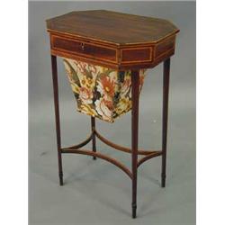 A Sheraton mahogany inlaid octagonal work table with single frieze drawer, onsquare tapering legs, united by a shaped stretcher. 19 5/8" (50cm) wide Est.400/600